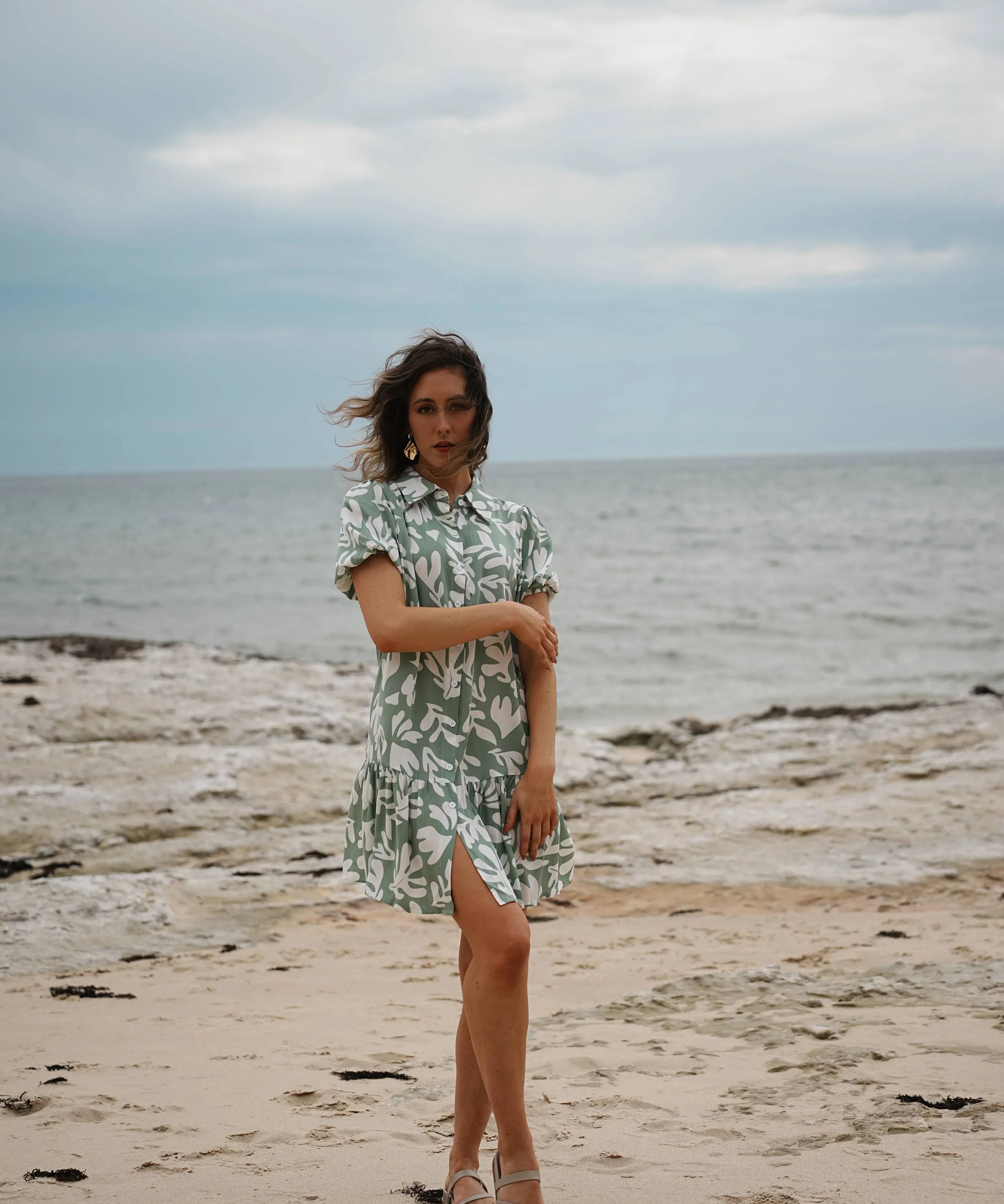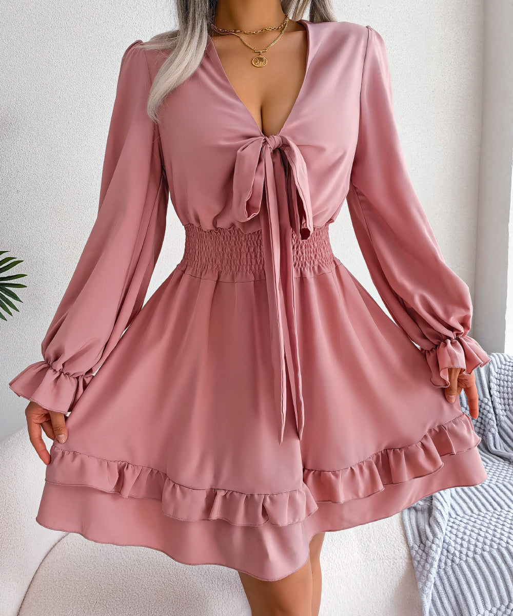 Square Neck Puff Sleeve Smocked Waist Ruffle A-Line Dress