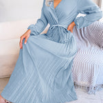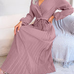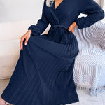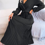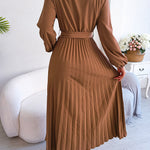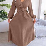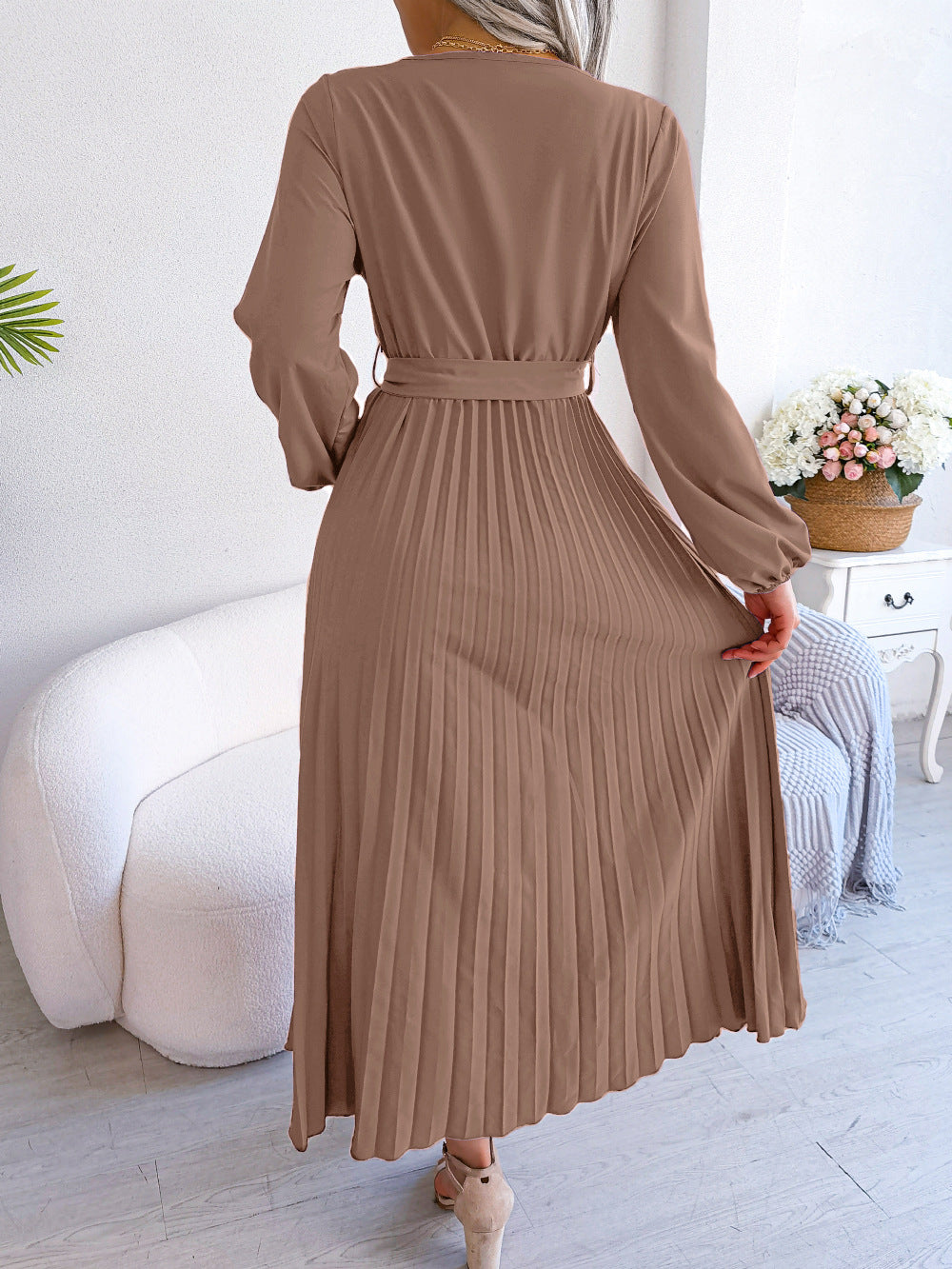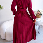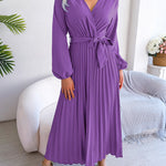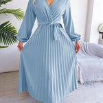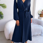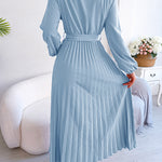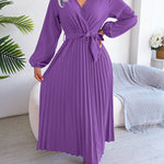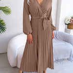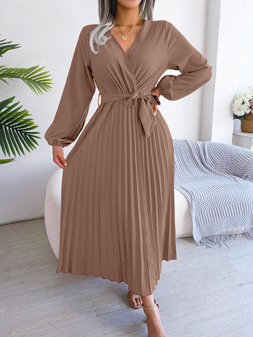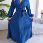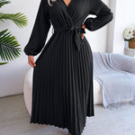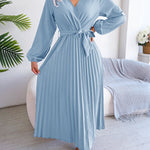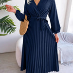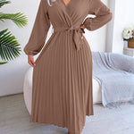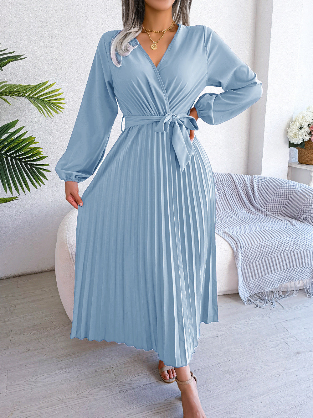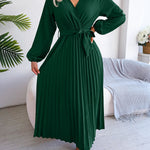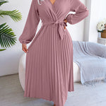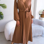 Embrace elegance with this V-neck pleated maxi dress. It features a crossover neckline, a tie waist for a tailored fit, and a flowy pleated skirt. Perfect for spring-summer dates, dinners, or special events, it blends chic style and comfort effortlessly.