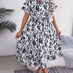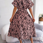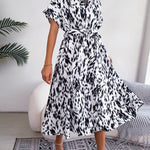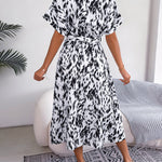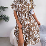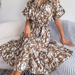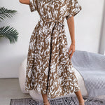Elevate your casual style with this leopard print shirt dress. It features a collared neck, short sleeves, and a tie waist for a tailored fit. Ideal for work, weekend strolls, or lunch dates, it merges comfort and trendy flair seamlessly.