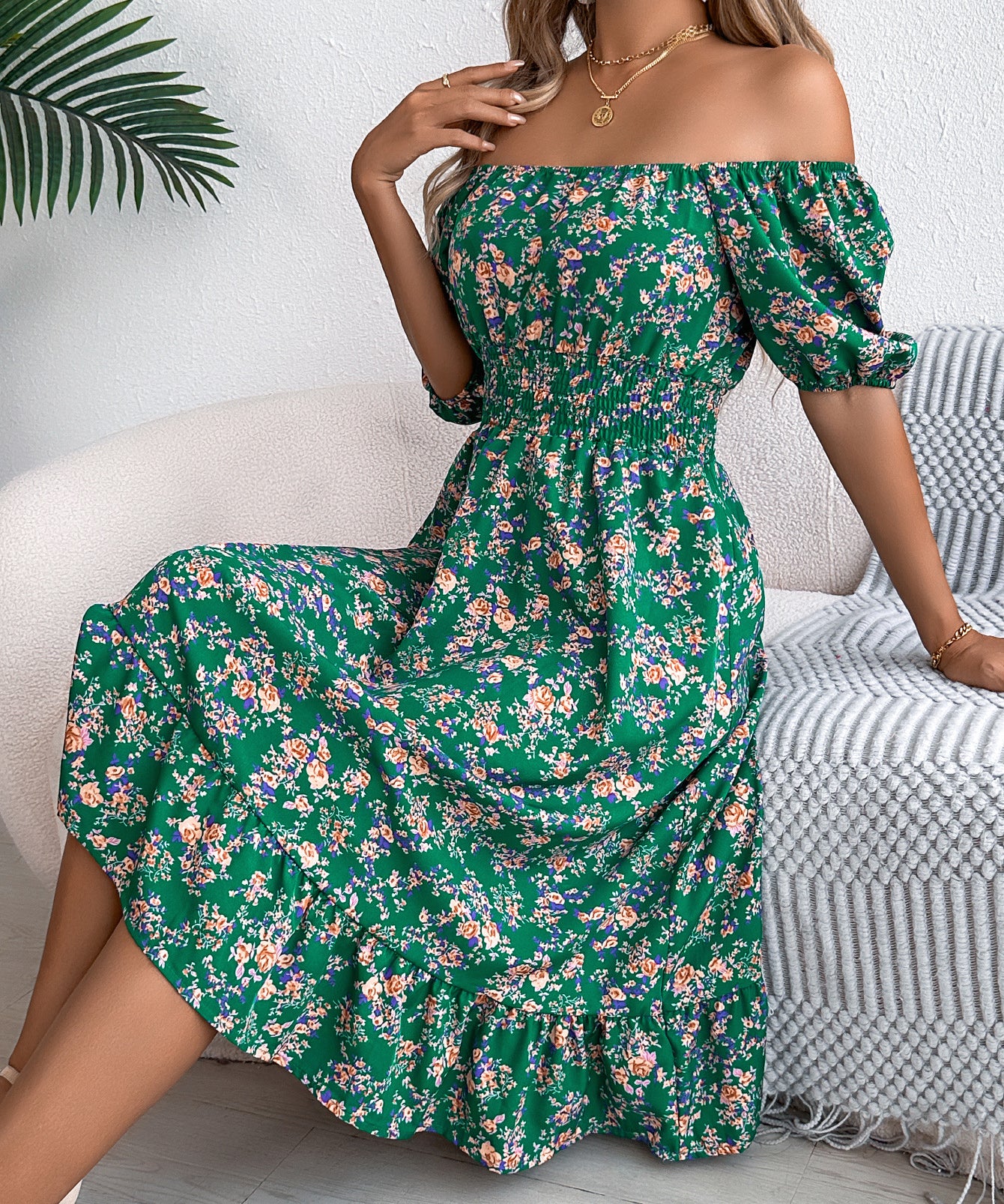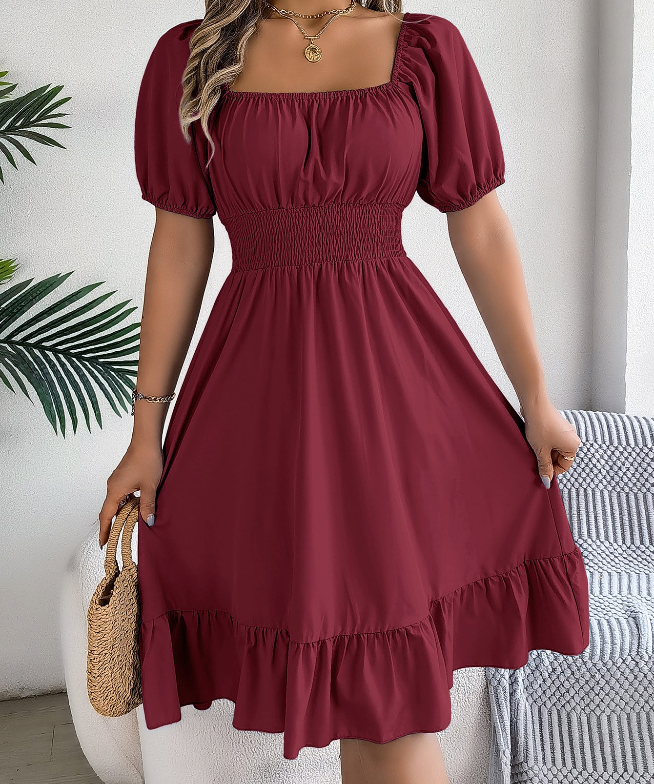 Square Neck Puff Sleeve Smocked Waist Ruffle A-Line Dress