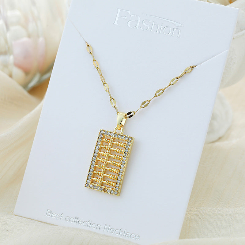 This fade-resistant titanium steel clavicle necklace features a niche abacus pendant accented with diamonds—lightweight, durable, and brimming with understated luxury. It shines in diverse winter scenarios: Pair it with a beige knit cardigan for a bookstore visit (literary softness), match a black turtleneck to browse a winter market (warm refinement), or coordinate with a silk blouse for a light business tea (sleek capability). It’s a versatile accessory that elevates cold-weather outfits effortlessly.