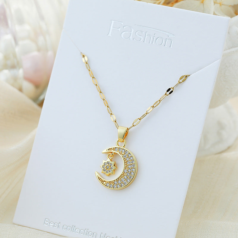 This fade-resistant titanium steel clavicle necklace features a niche moon-and-star pendant adorned with tiny diamonds, exuding understated luxury. It shines in winter scenarios: Pair it with an off-white knit maxi dress for a winter terrace movie night (romantic ambiance), match a caramel retro sweater to browse a used bookstore (literary casualness), or coordinate with a light blue wool blazer for commutes (sleek refinement). It’s a versatile winter accessory that elevates outfits effortlessly.
