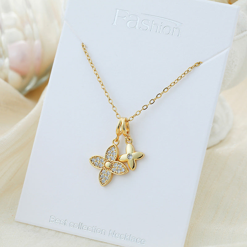 Titanium Steel Double Four-Leaf Clover Diamond-Accented Clavicle Necklace