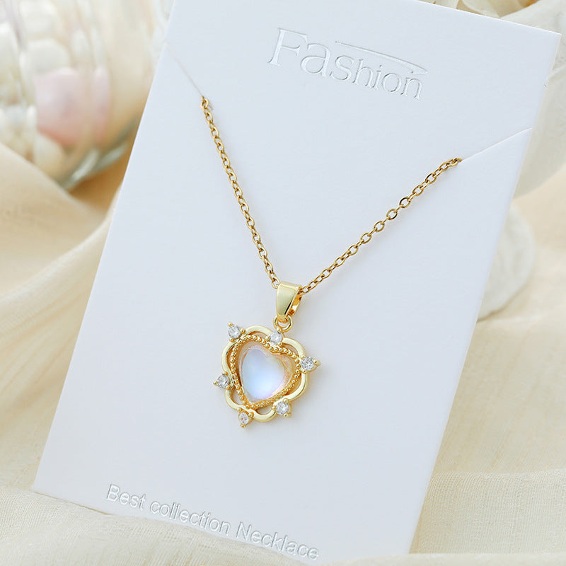 Titanium Steel Moonstone Heart Pendant Diamond-Accented Clavicle Necklace
