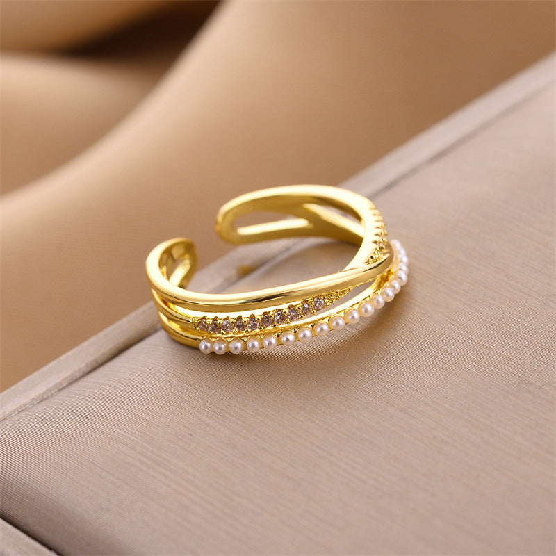 Gold-Plated Korean Multi-Layer Pearl & Zircon Open Ring