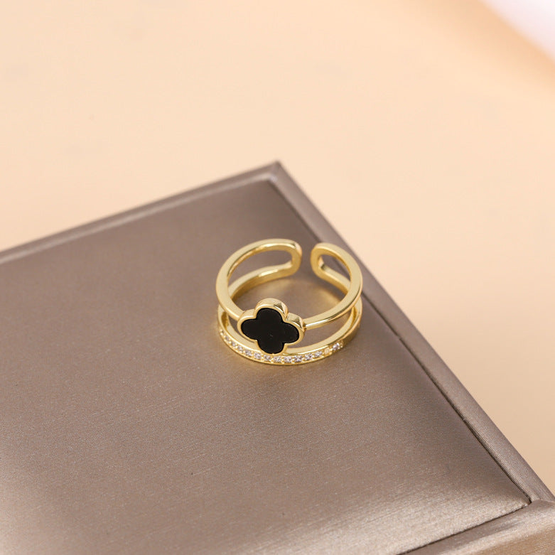 Gold-Plated Korean Light Four-Leaf Clover Zircon Double-Layer Open Ring
