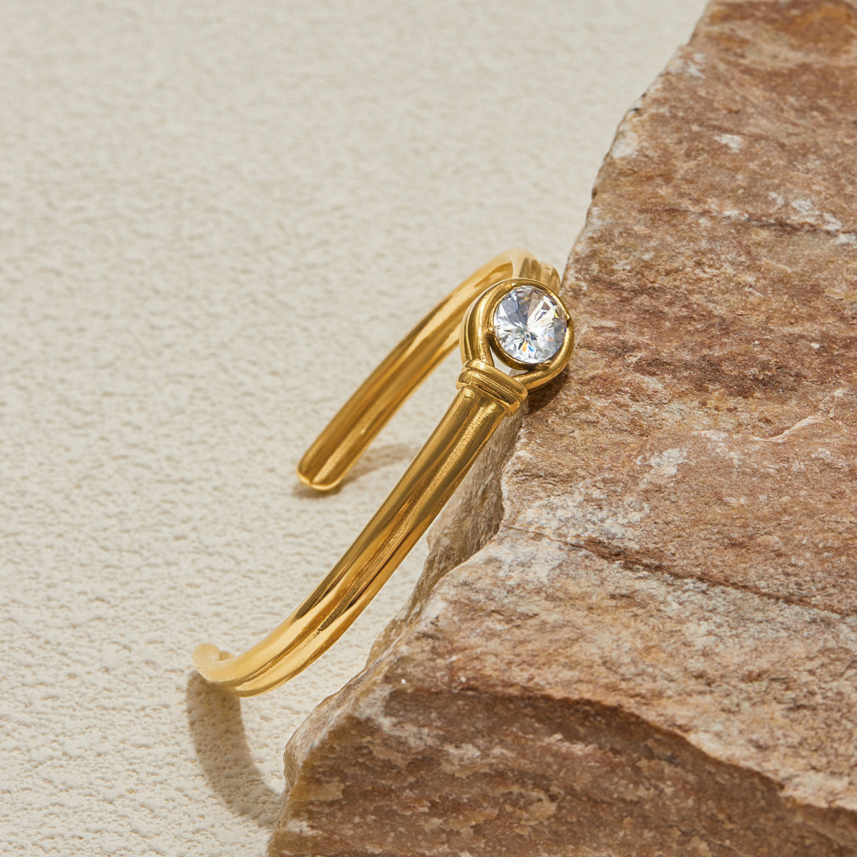 This Gold Stainless Steel Zircon Open Cuff Bangle showcases a sparkling zircon centerpiece on a sleek gold - hued stainless steel band. Made for long - lasting wear without fading, it pairs wonderfully with a flowy maxi dress during a beach trip, a tailored blazer at work, or a cozy knit sweater for a dinner date. Effortlessly bring a touch of luxury to any look with this stylish accessory.