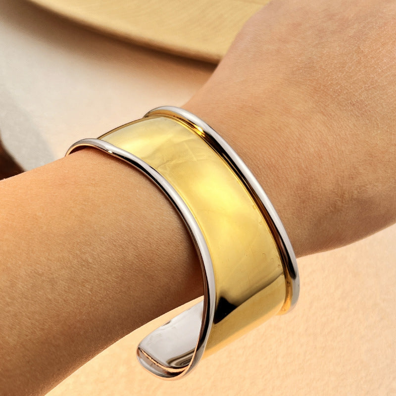 These Irregular Shiny Titanium Steel Cuff Bracelets, offered in gold and silver, boast a sleek wide design with a polished finish for a luxurious touch. Ideal for pairing with a structured blazer at work, a satin midi dress for a gallery visit, or a cropped top during a city stroll. Effortlessly add an elegant edge to any outfit with these versatile cuffs.