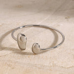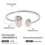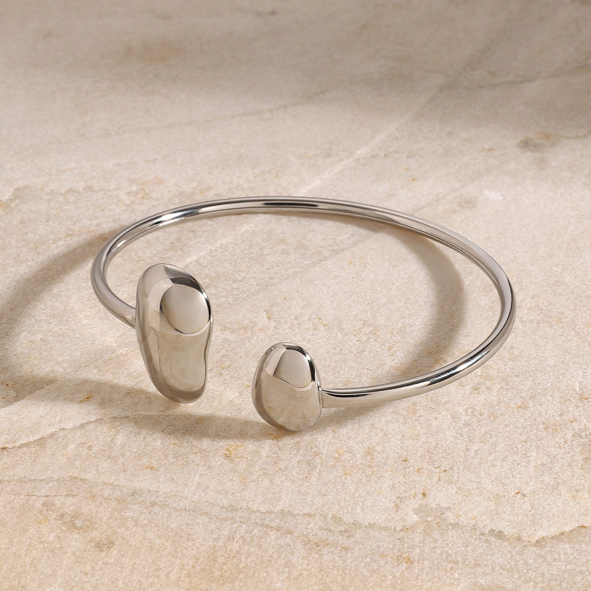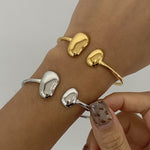 This Irregular Water - Drop Open Stainless Steel Bangle, offered in gold and silver, showcases a sleek, organic water - drop design with an open cuff for easy wear. Crafted from durable stainless steel, it pairs beautifully with a tailored suit for office sophistication, a silk cami dress at a cocktail party, or a chunky knit sweater for weekend casualness. Effortlessly add a touch of modern elegance to any outfit with this versatile accessory.