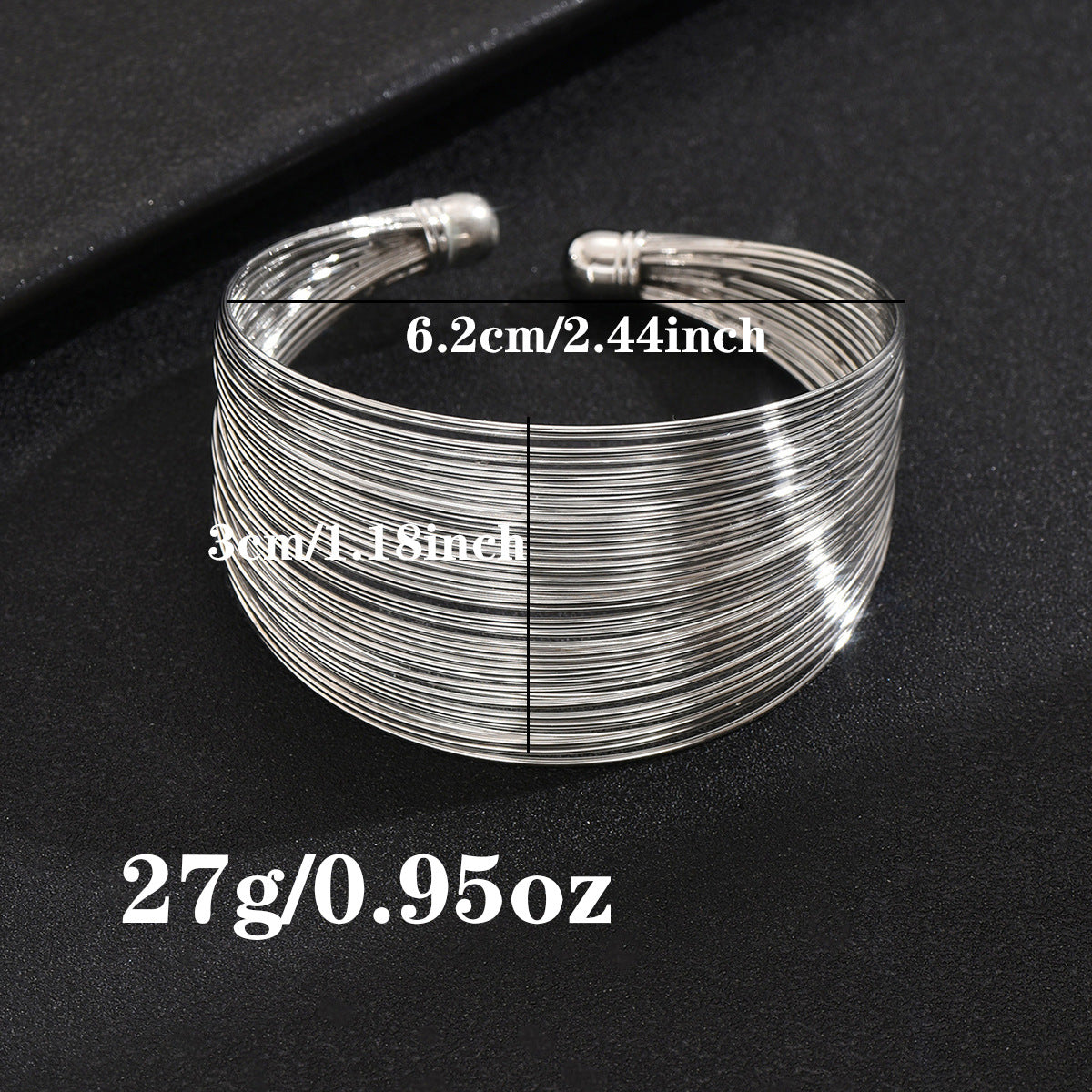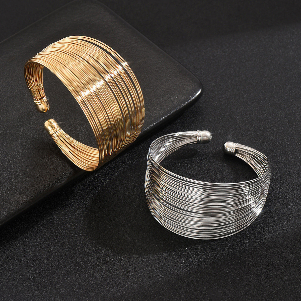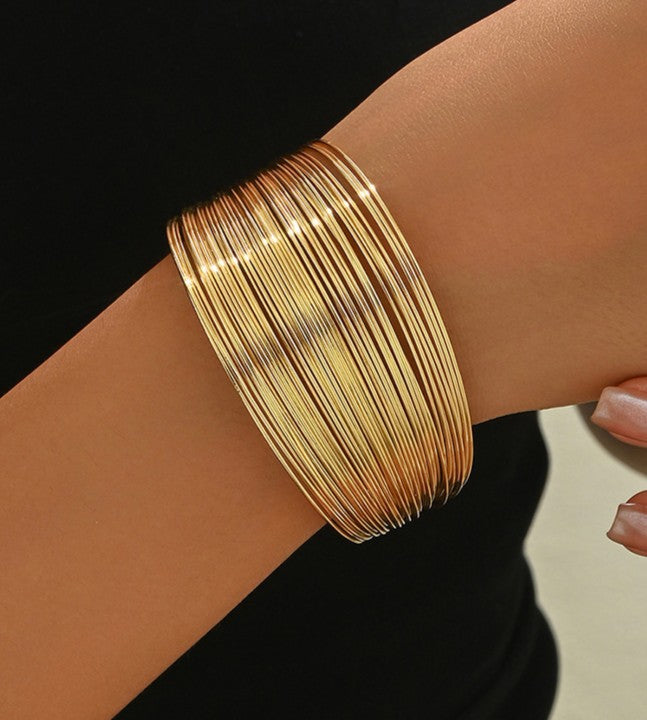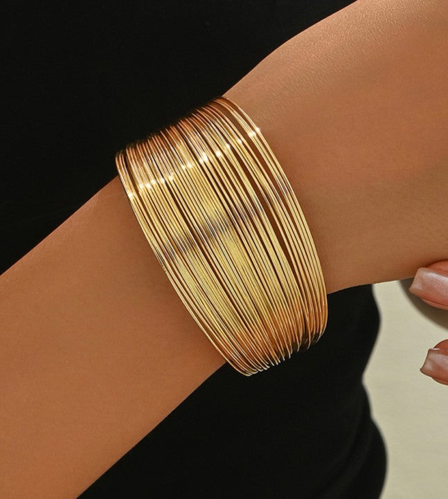 This Multi - Layered Open Wide Cuff Bracelet, available in gold and silver, features stacked metal wires for a bold, textured look. Perfect for making a statement, it pairs effortlessly with a crop top at a music festival, a silk maxi dress for a dinner party, or a denim jacket during a casual street stroll. Elevate your style with this eye - catching, versatile accessory.