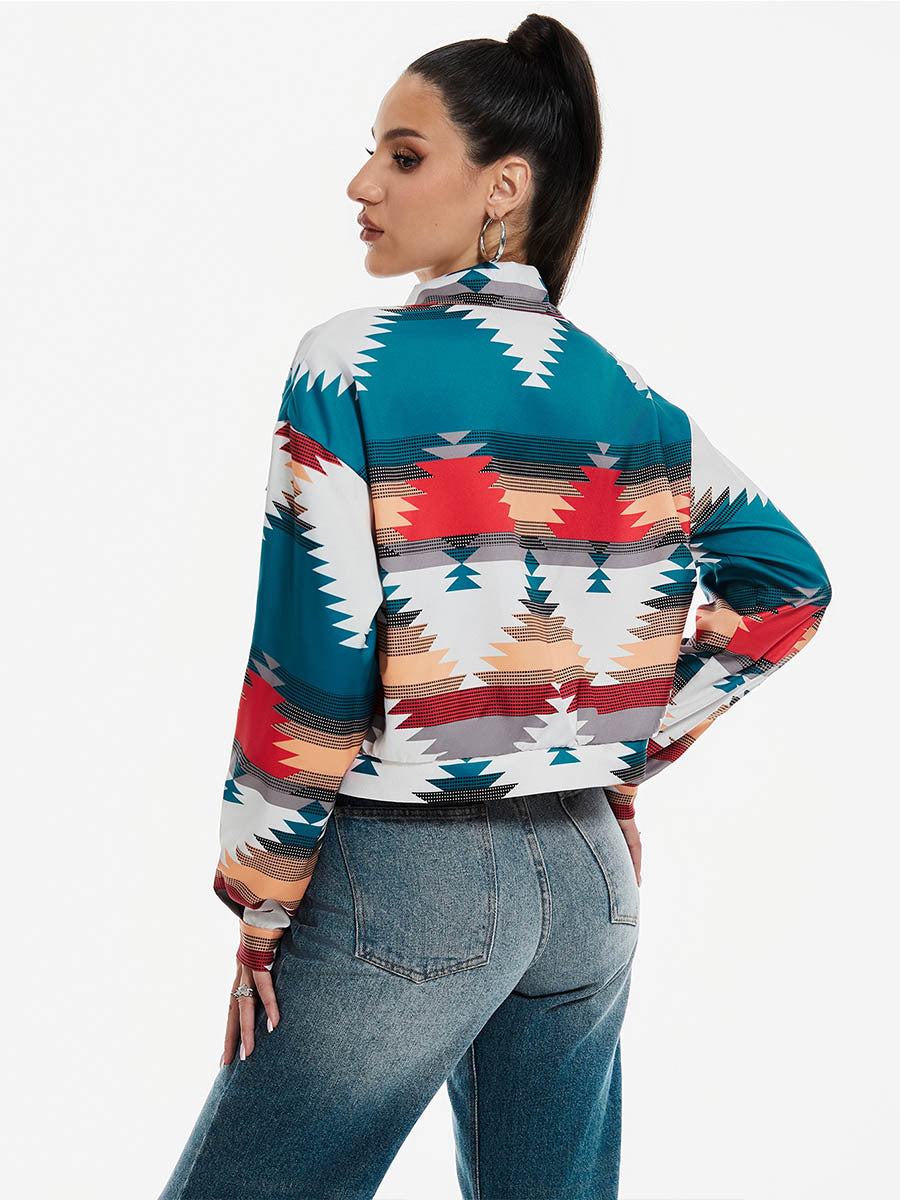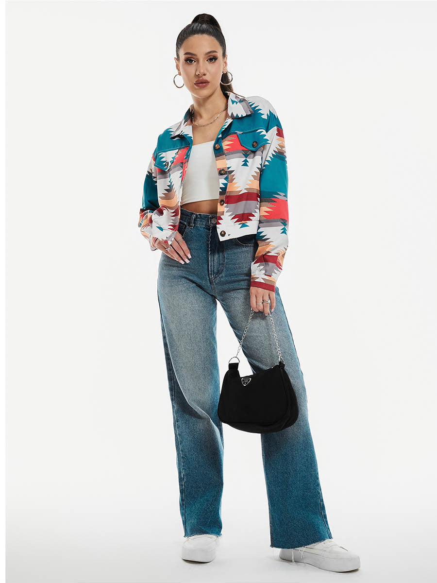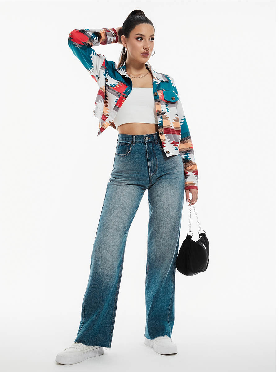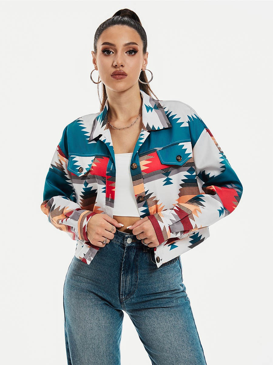Vibrant and bold, this cropped jacket redefines casual outerwear with its striking geometric print and saturated palette. Cut in a flattering short silhouette, it features sharp lapels and functional front pockets that add both form and utility. The lightweight fabric drapes with ease, offering comfort without sacrificing structure. It's a piece that captures attention instantly—dynamic, modern, and unapologetically expressive.