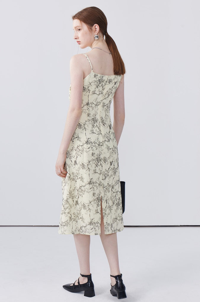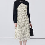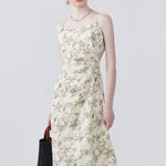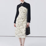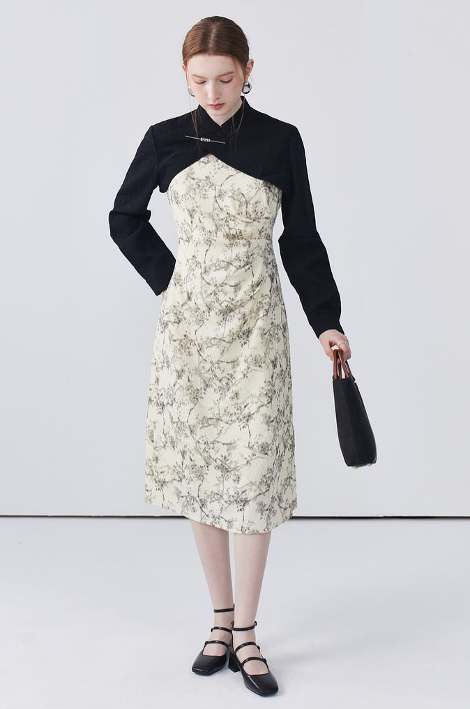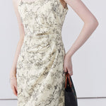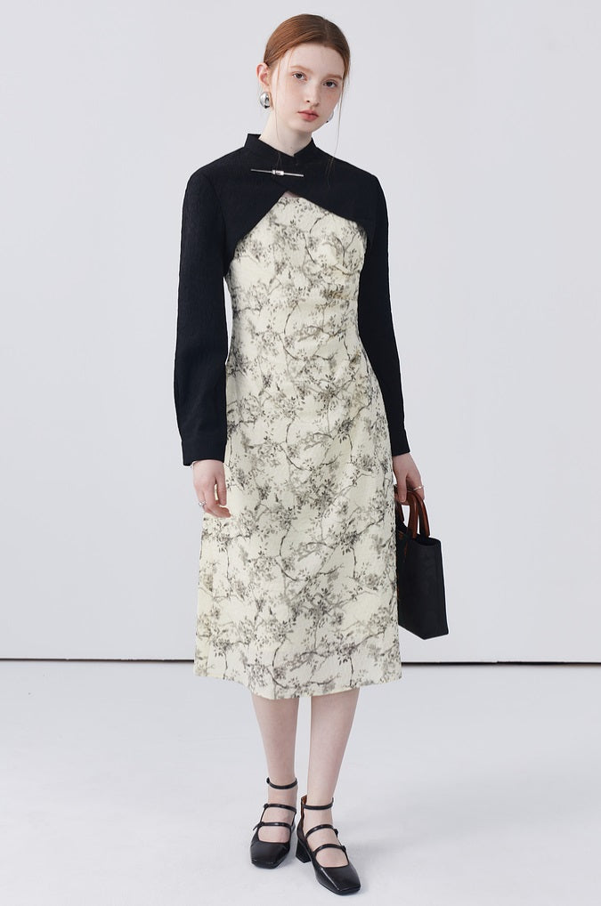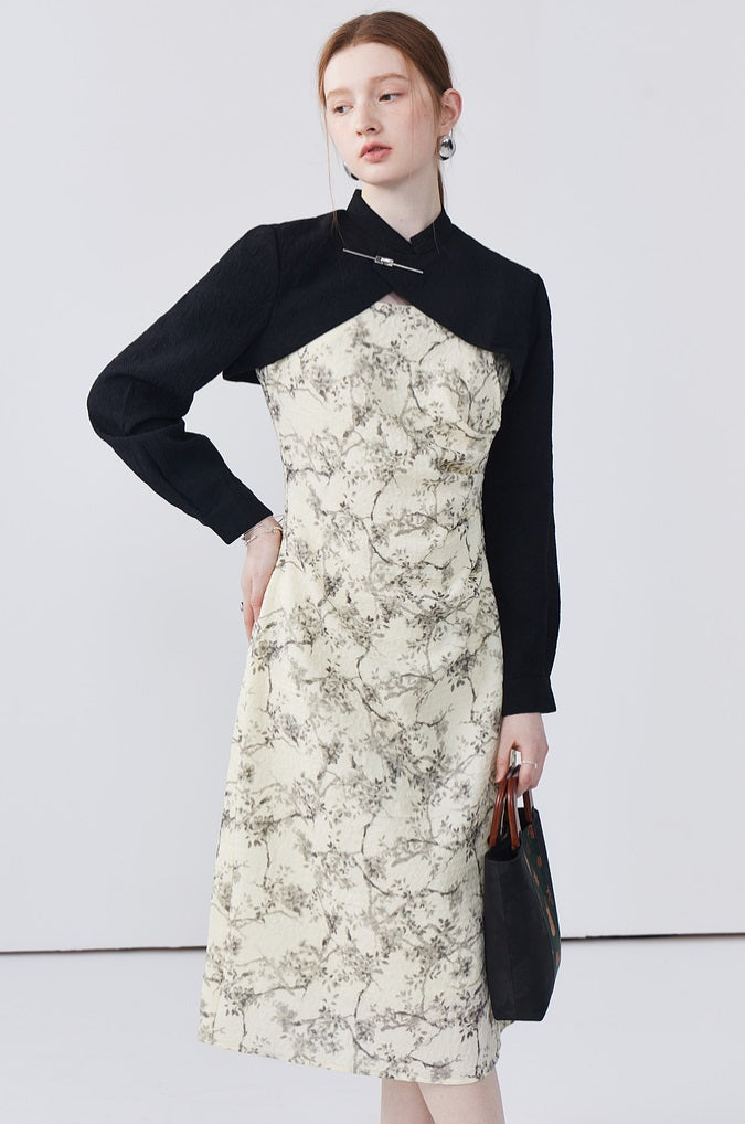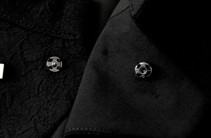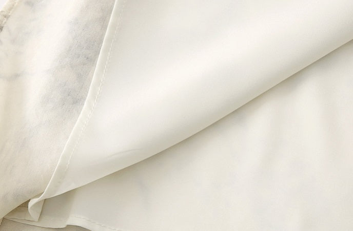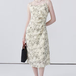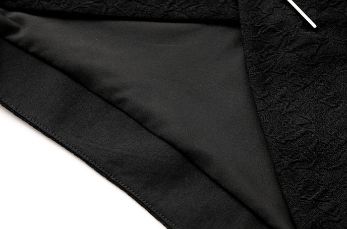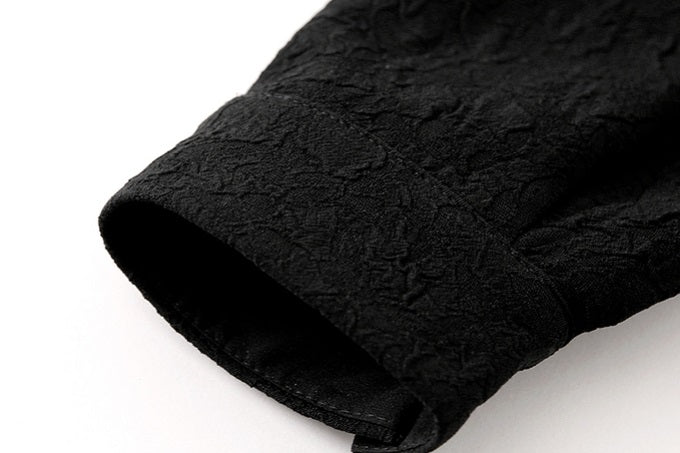 This dress features a unique button design that adds a distinctive touch, while the multi-layered pleating enhances its elegance, creating a graceful and sophisticated look. Ideal for those who appreciate detailed craftsmanship and refined style.