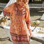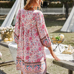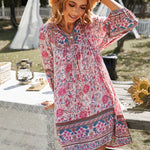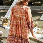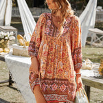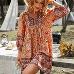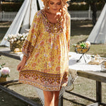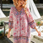A breezy bohemian-inspired mini dress designed for effortless elegance. Featuring a relaxed silhouette with a flattering V-neckline, soft gathering at the bust, and billowed sleeves finished with elastic cuffs, it offers both comfort and style. The lightweight fabric drapes naturally, while the intricate floral pattern enhances its free-spirited charm. Perfect for casual outings, weekend getaways, or adding a touch of boho flair to everyday wear.