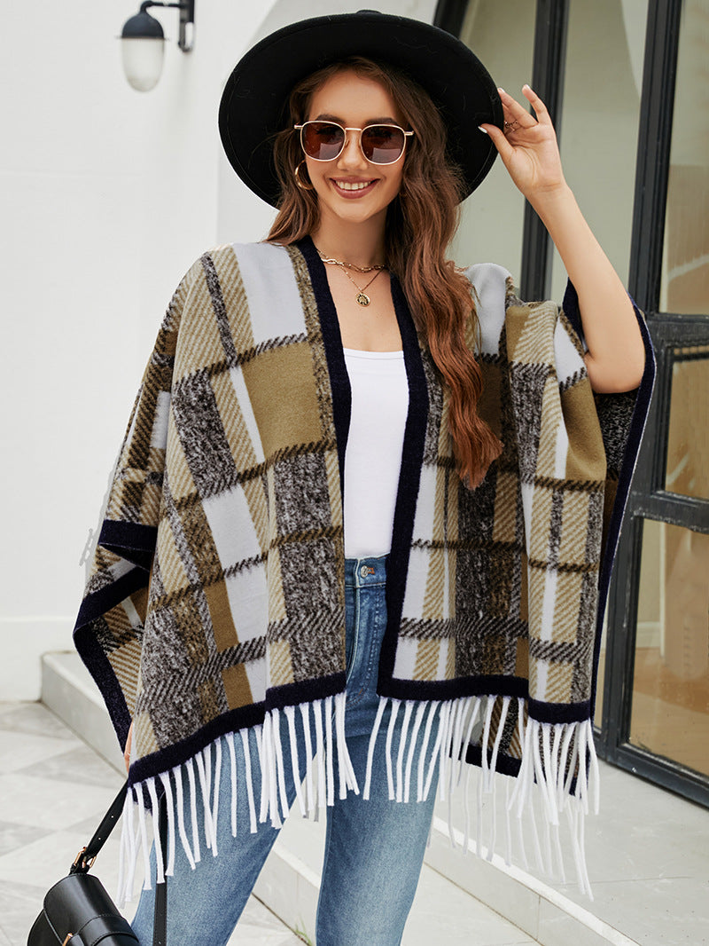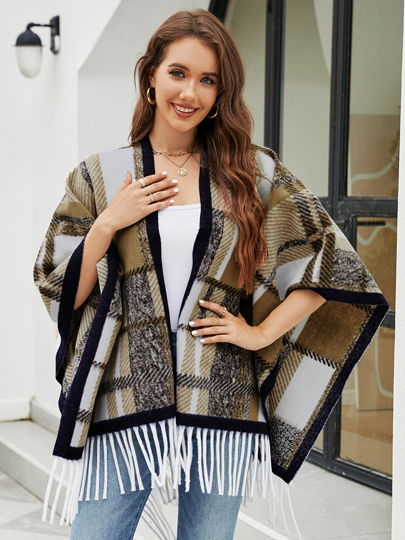 Checked Fringe Hem Cape