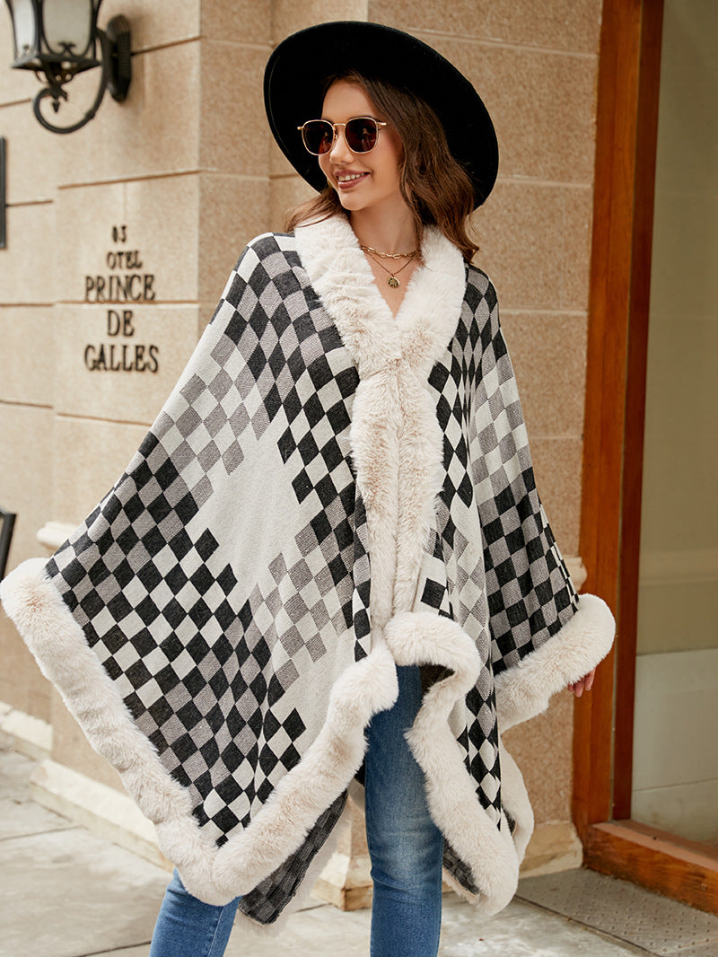 For those who appreciate refined layering, this cape makes a statement with its bold checkerboard pattern and sumptuous faux fur trim. The contrast between structured geometry and soft textures creates a visual harmony that’s both sophisticated and cozy. Crafted with a flowing silhouette and delicately finished fringe hem, it drapes effortlessly for an elegant, enveloping feel. Whether worn open or clasped at the neck, it adds instant polish to any ensemble—perfect for chilly mornings or refined evenings out.