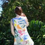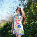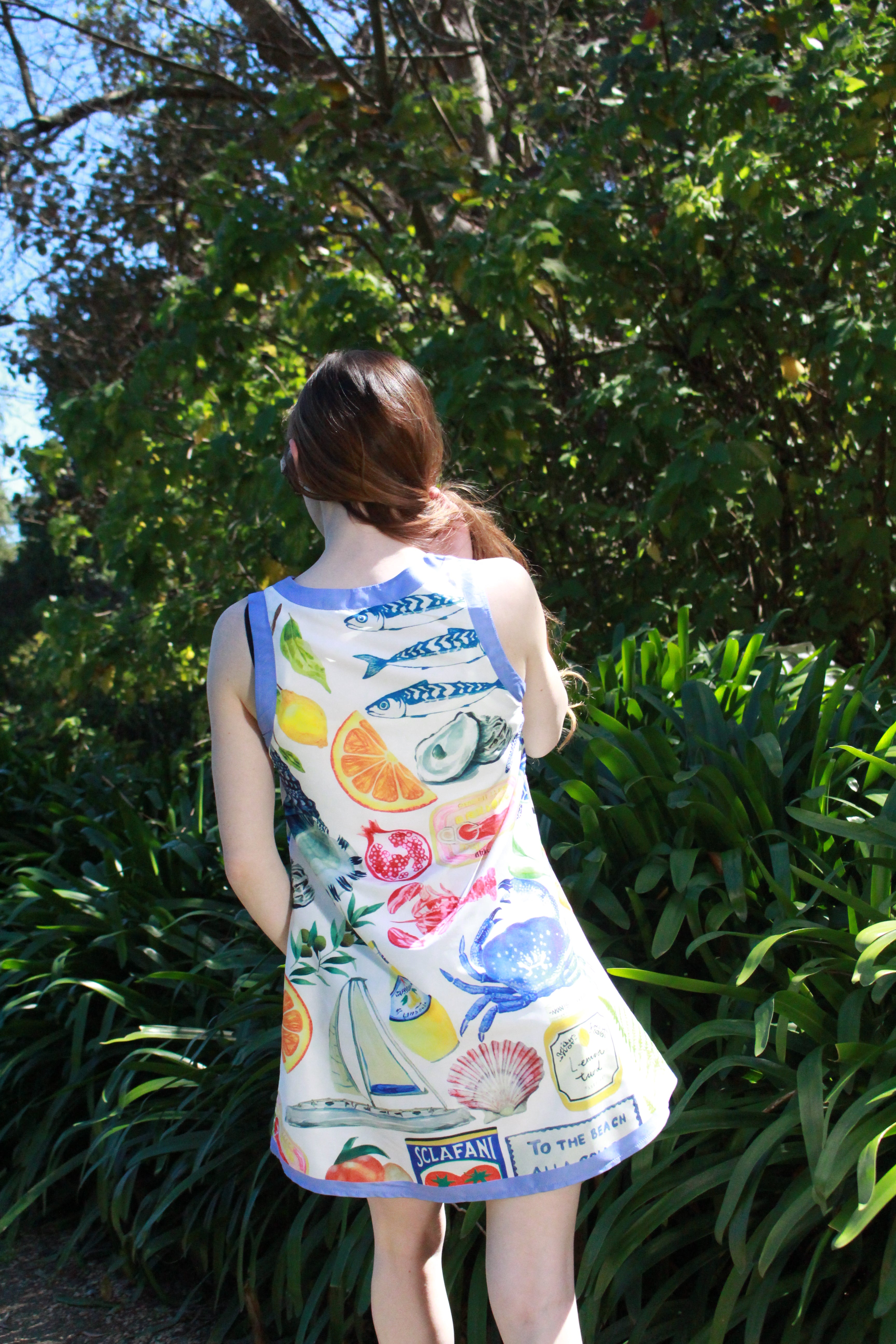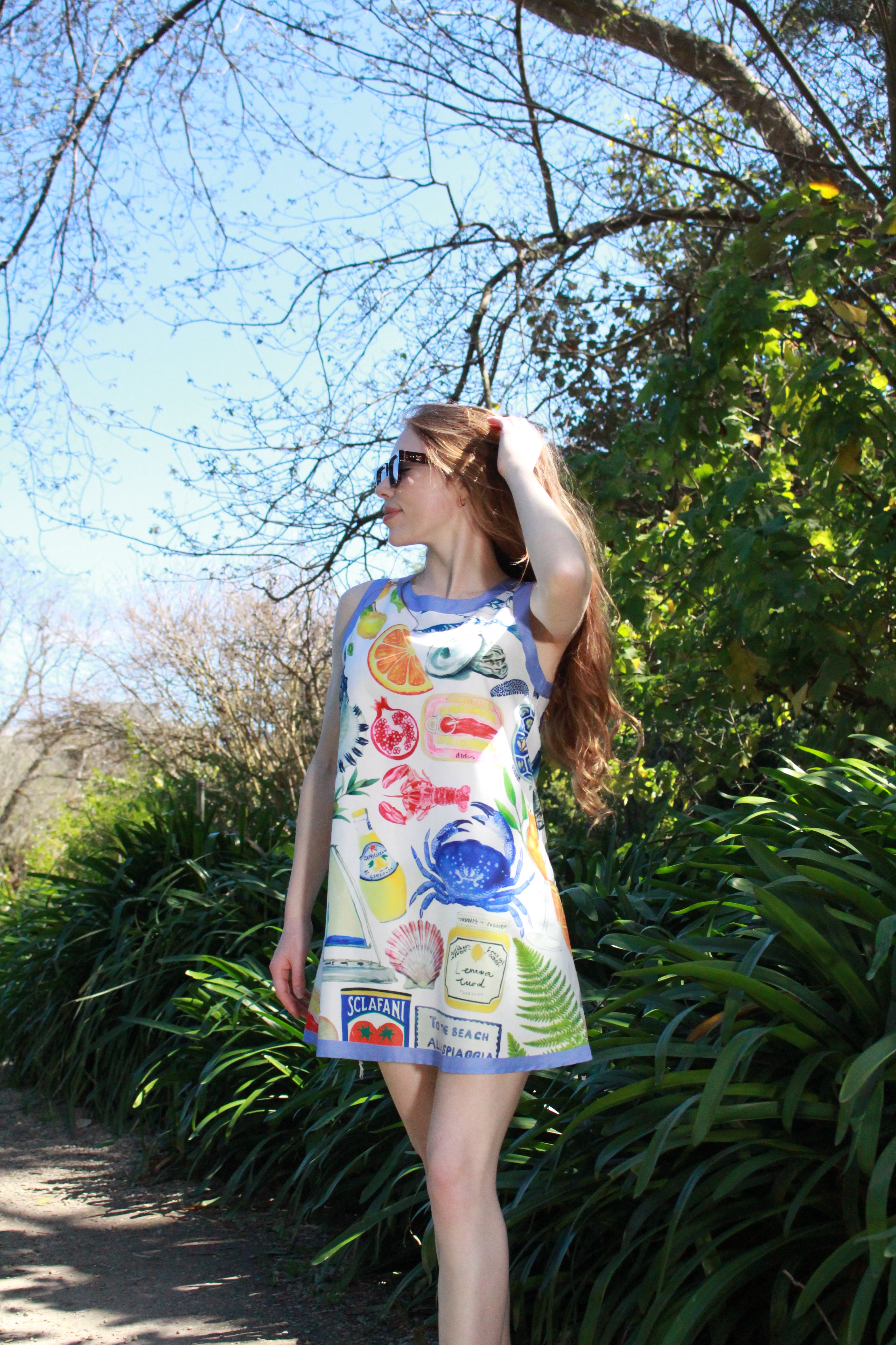 Bring a splash of coastal charm to your wardrobe with this vibrant sleeveless dress, featuring a whimsical collage of seaside icons—crabs, citrus slices, shells, and handwritten-style labels in painterly strokes. Crafted in a breezy A-line silhouette, it offers a relaxed fit and playful flair, ideal for sunny weekends, beach strolls, or vacation getaways. The soft neckline is trimmed in a refreshing cornflower blue for a crisp finish, while the all-over print adds joyful character without compromising on elegance. Pair it with sandals or espadrilles for effortless summer styling.