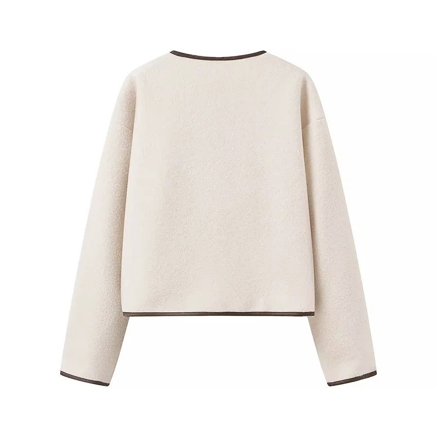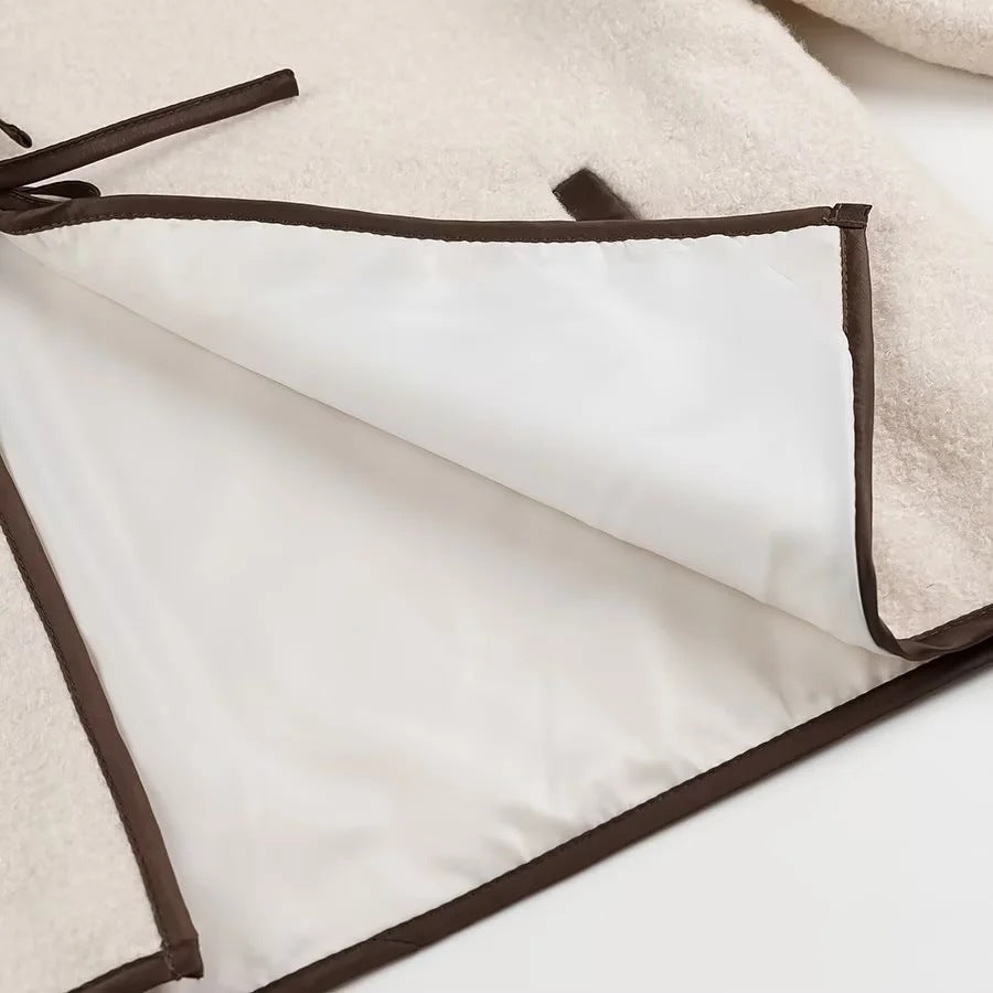 Elevated simplicity meets delicate detailing in this minimalist jacket. The clean round neckline is adorned with dual ribbon ties, adding a touch of romantic charm. Crafted from a soft-touch fabric with subtle texture, it’s designed for both comfort and understated style. Contrast binding along the edges and pockets adds visual interest while maintaining a refined silhouette. Ideal for effortless layering, this piece transitions seamlessly from day to evening.