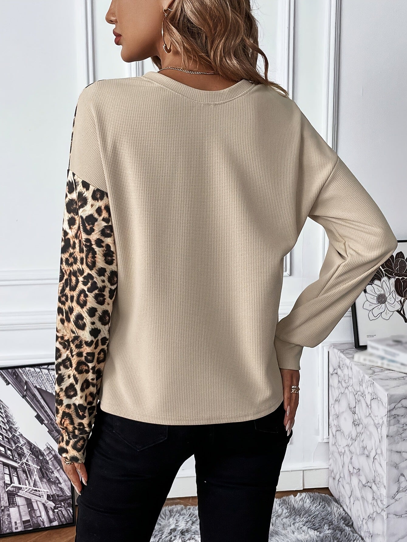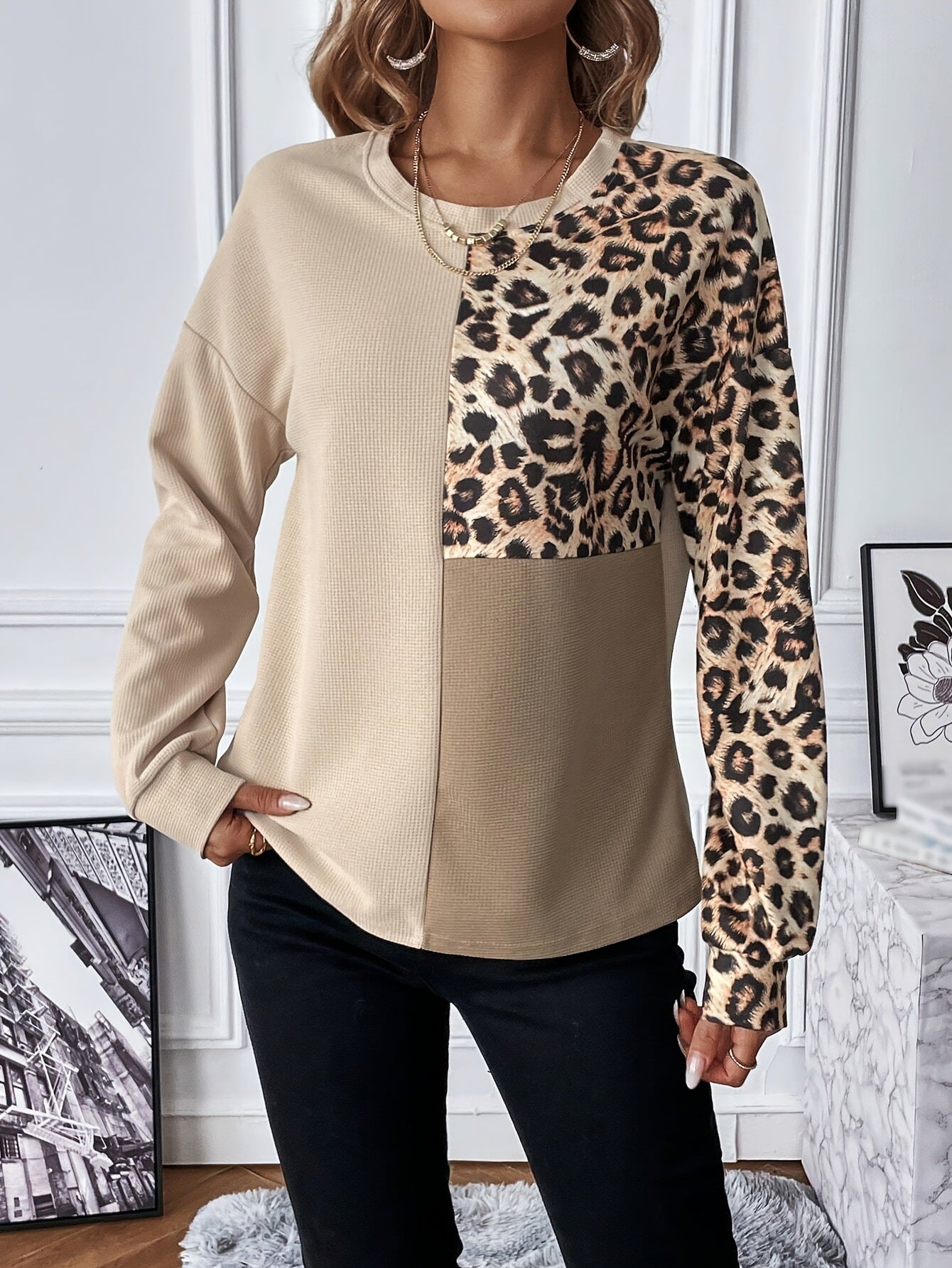 Blending bold style with everyday comfort, this crewneck knit top stands out through its striking contrast of classic neutrals and a vivid leopard print. The dual-texture patchwork design gives it a modern, editorial feel, while the soft, waffle-knit fabric offers a cozy and flattering fit. Carefully tailored with a relaxed silhouette and dropped shoulders, it's a versatile piece that can elevate both casual and polished looks. Ideal for those who appreciate statement details in timeless silhouettes.