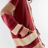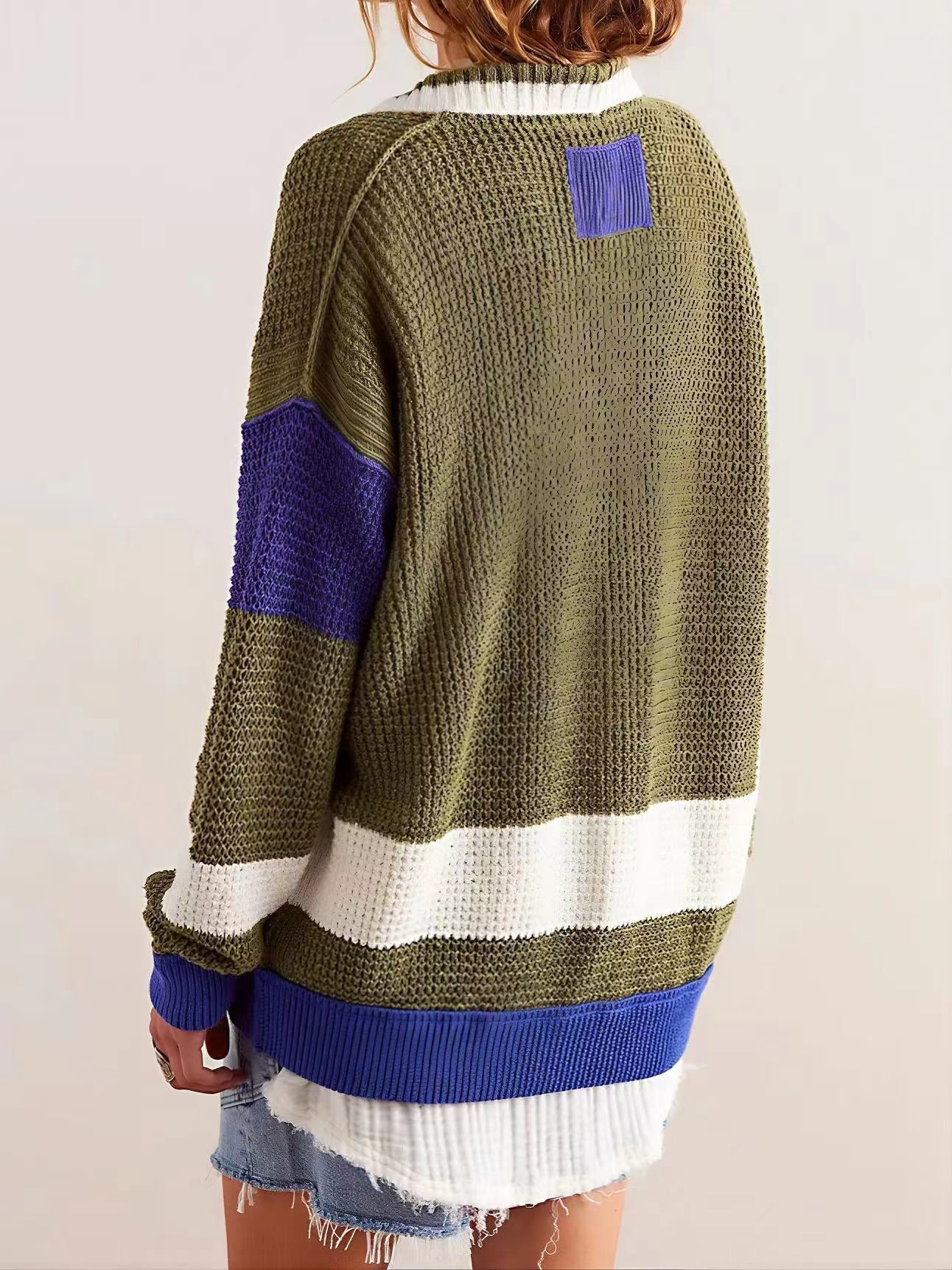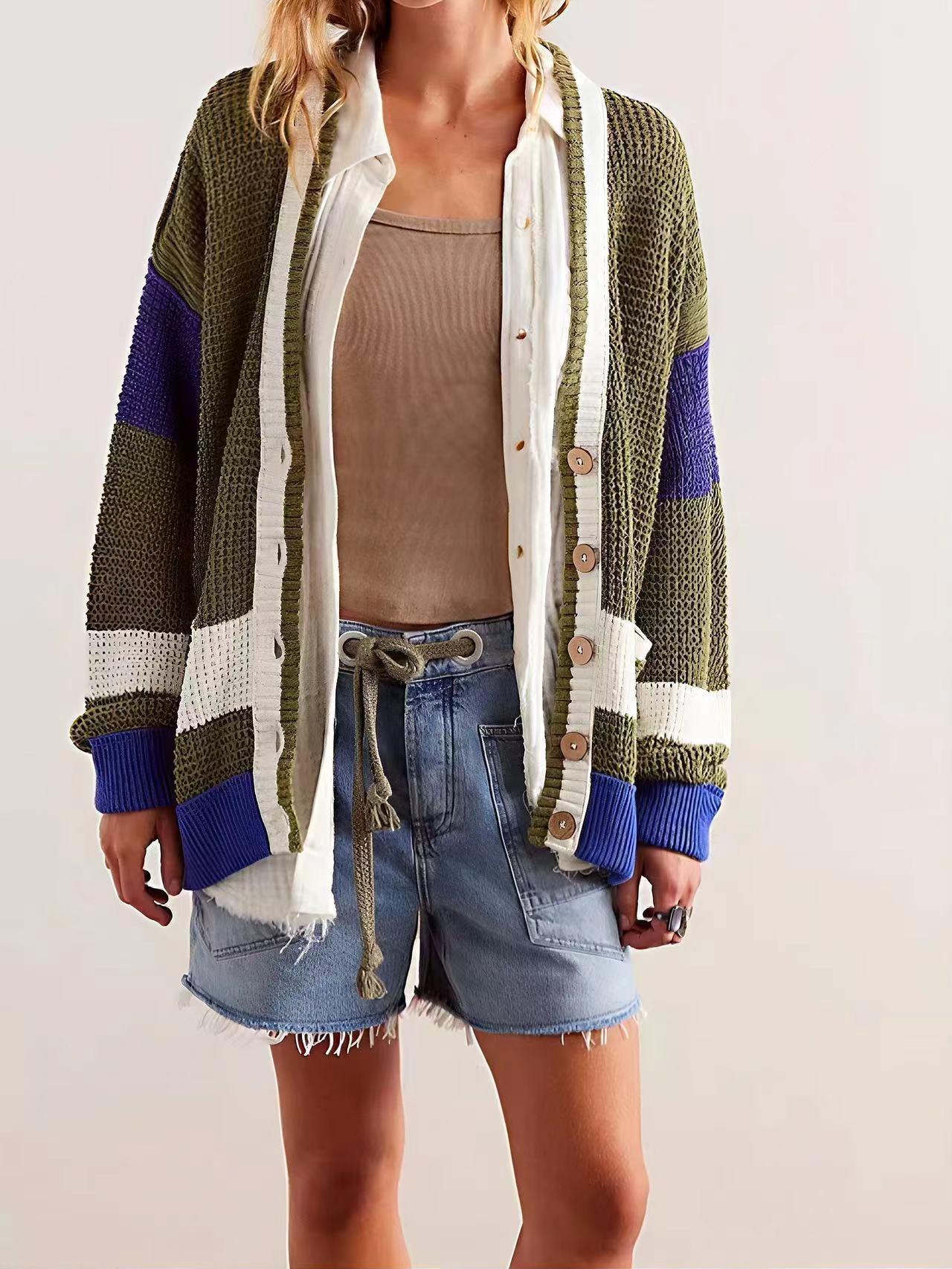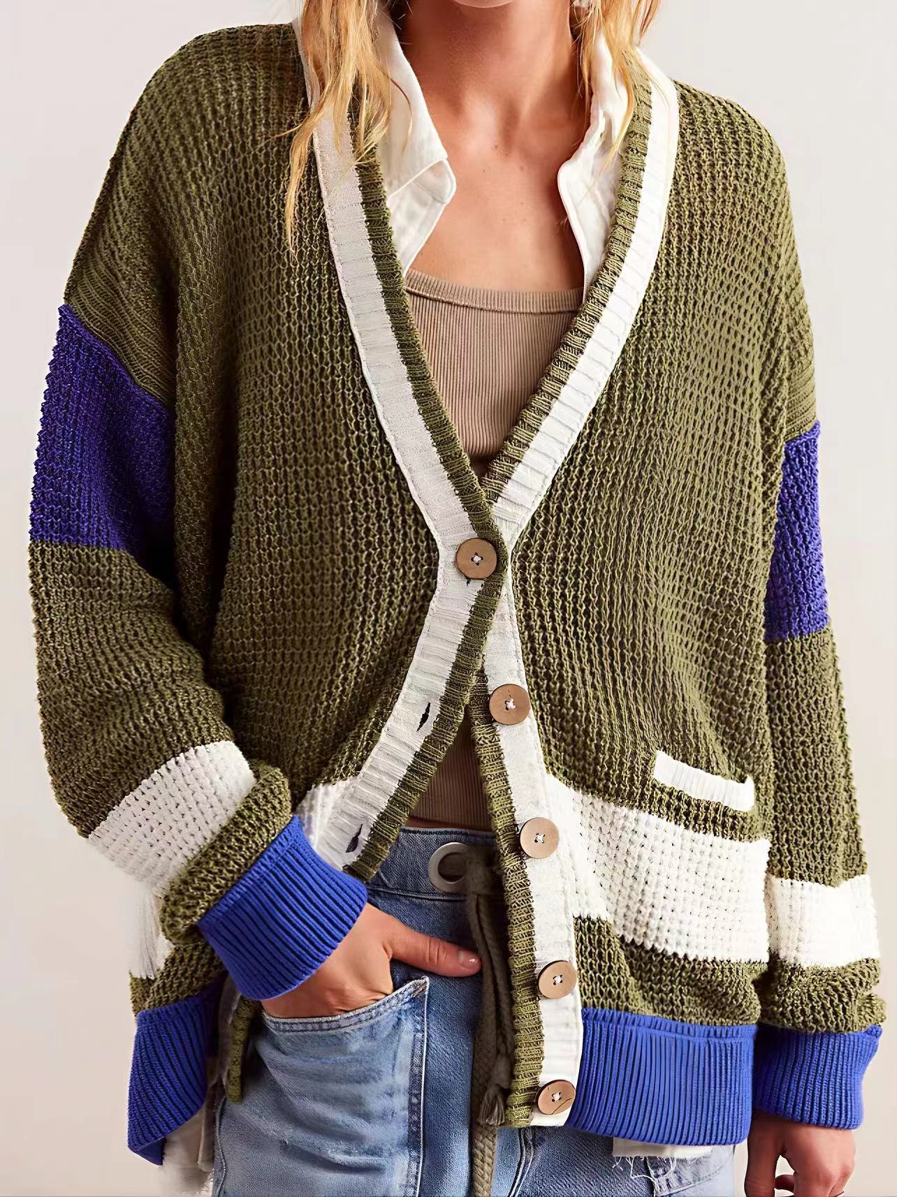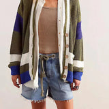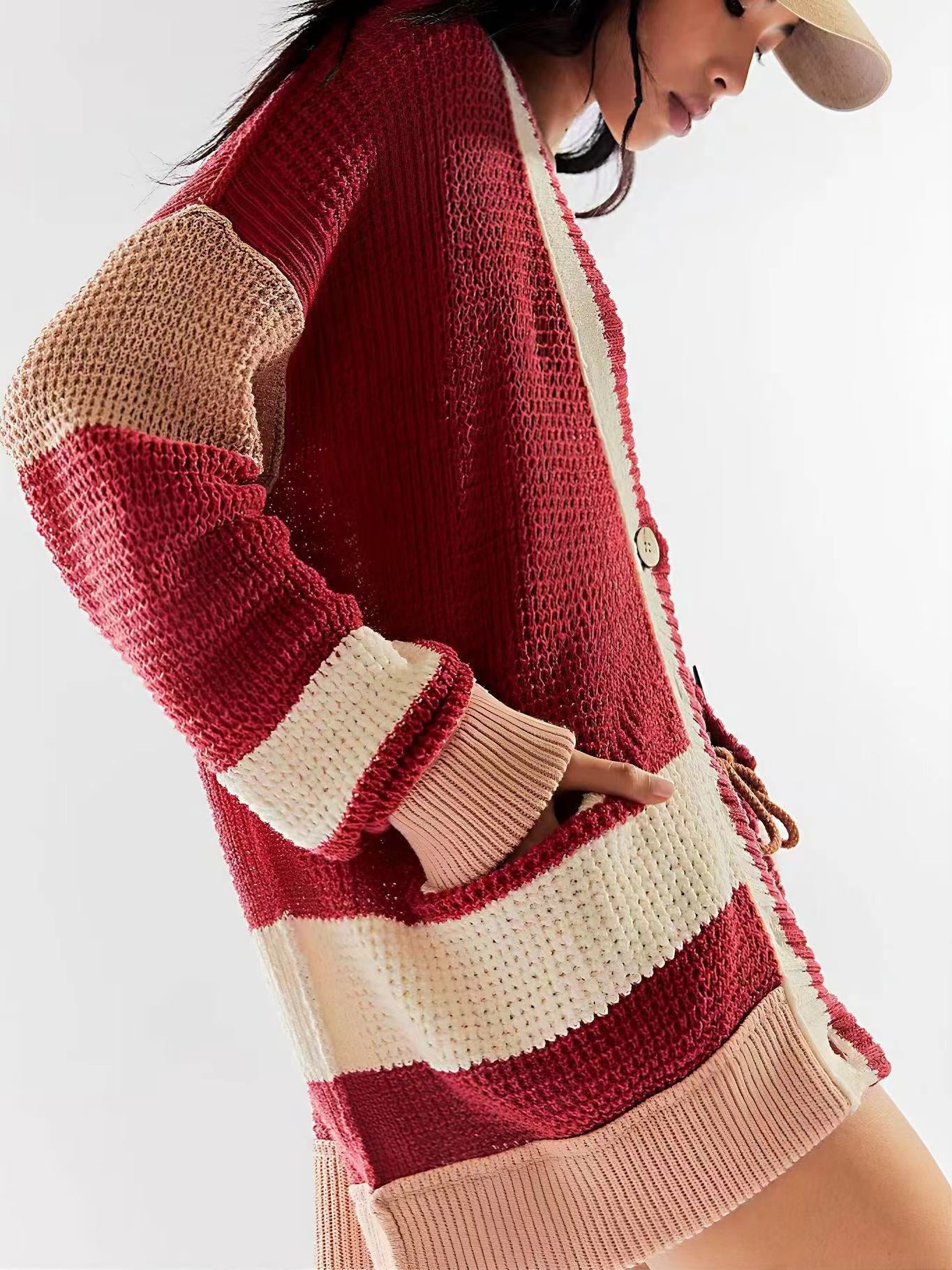 This oversized cardigan brings a refreshing twist to everyday layering. Designed with a deep V-neckline and bold colorblock stripes, it exudes laid-back elegance with a playful edge. The textured knit provides warmth without weight, while the relaxed silhouette makes it perfect for styling over tanks or button-downs. Detailed with functional pockets and chunky buttons, it strikes a balance between cozy and refined—a statement piece for transitional weather or casual days with a touch of flair.