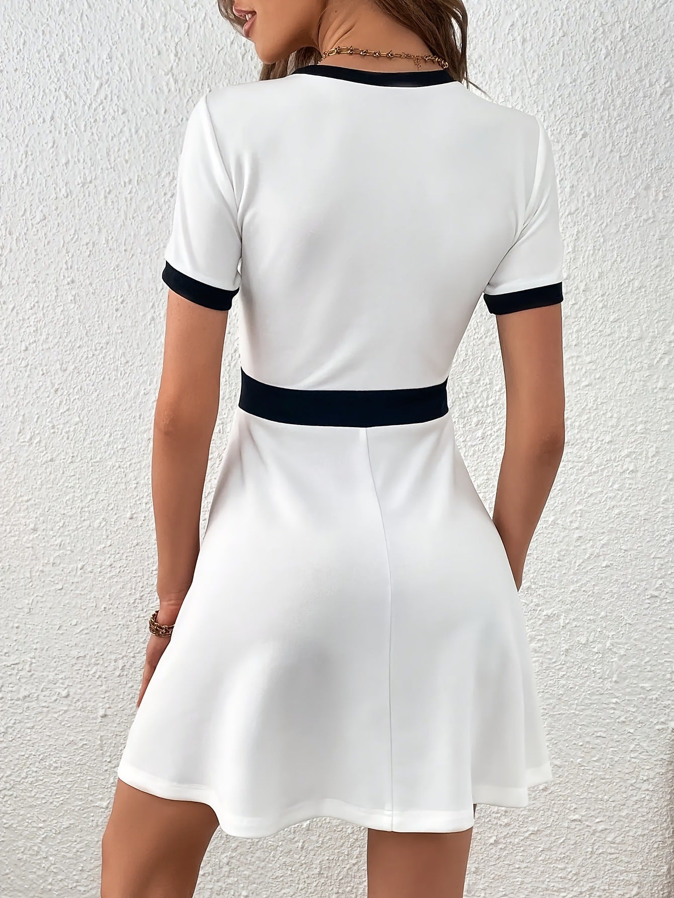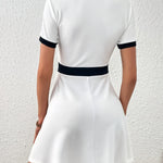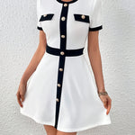 This Contrast Trim Buttoned A-Line Dress combines timeless elegance with a refined modern touch. Featuring a round neckline, short sleeves, and a fitted waist that flows into a gentle A-line skirt, it offers both structure and femininity. The contrasting trim and decorative gold-tone buttons add a tailored, polished finish that enhances its chic appeal. Made from a smooth, comfortable fabric, it’s an effortless piece that transitions from daytime sophistication to evening elegance. Perfect for women seeking a refined, versatile dress with a hint of Parisian charm.