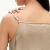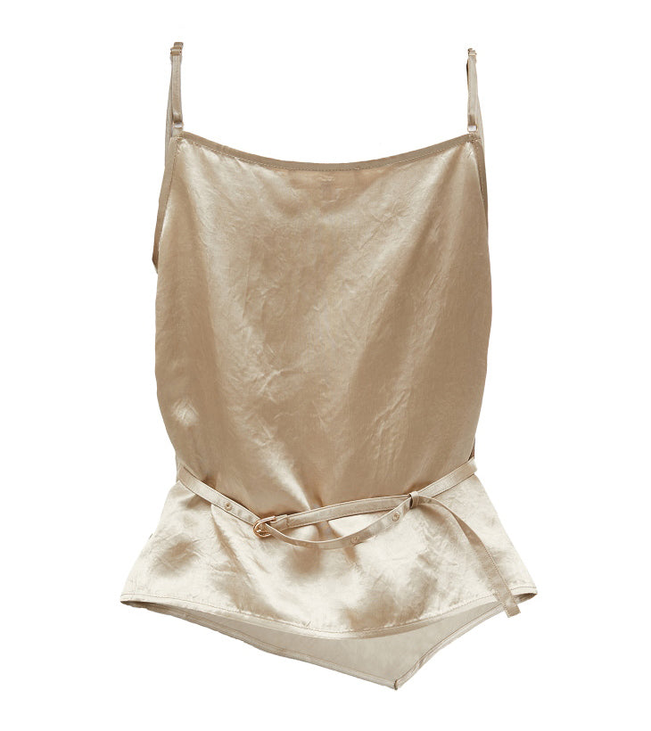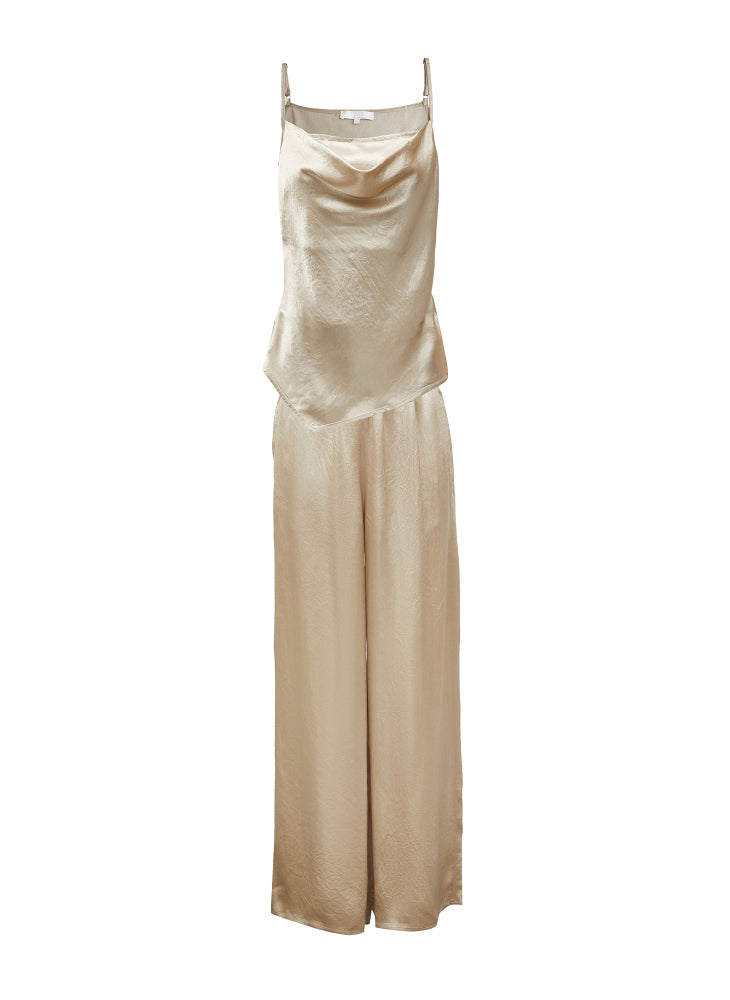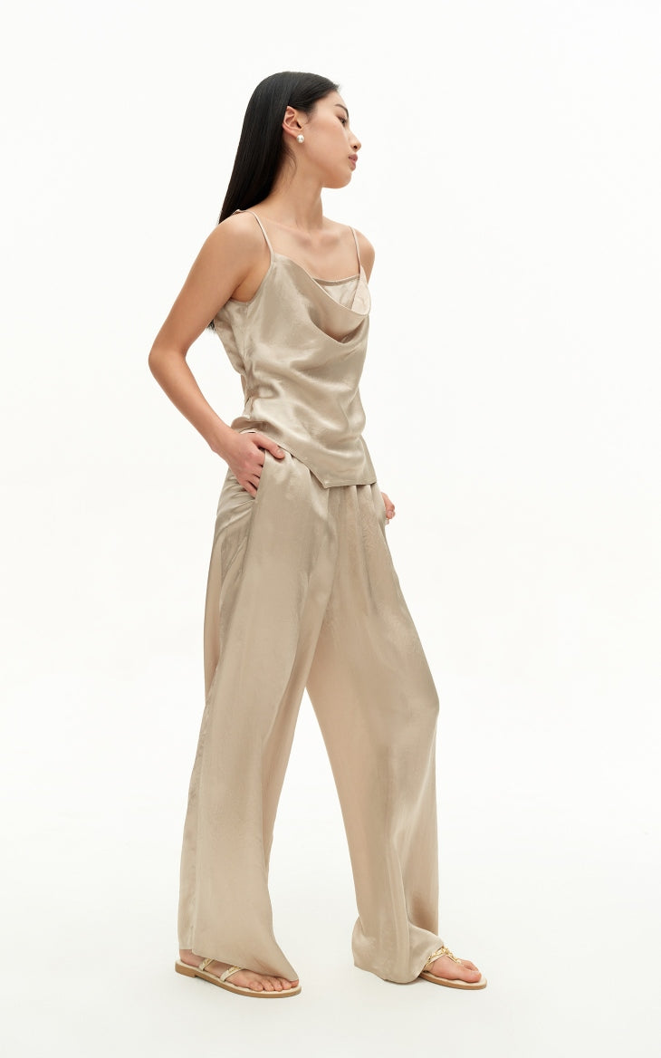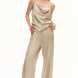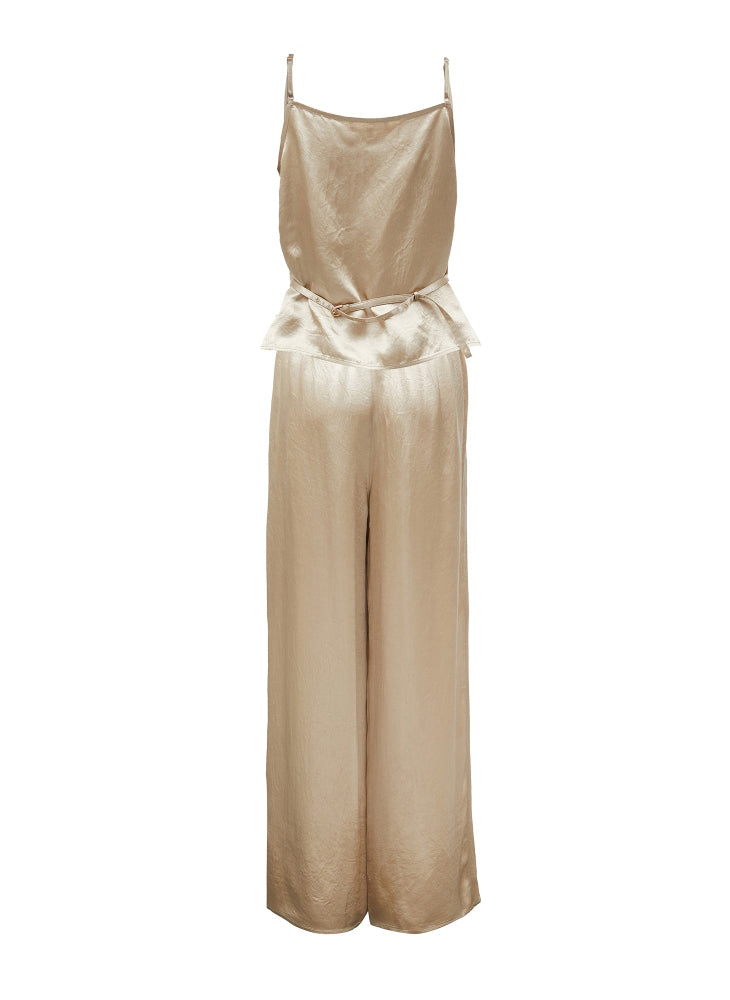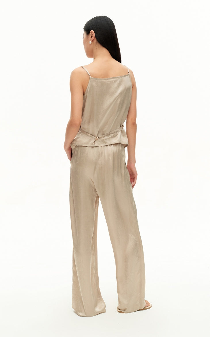 This outfit features a sling collar with an adjustable length for a customizable fit. Paired with stretch pants for comfort and ease of movement, it is completed with a decorative belt at the waist, adding a stylish and polished touch.