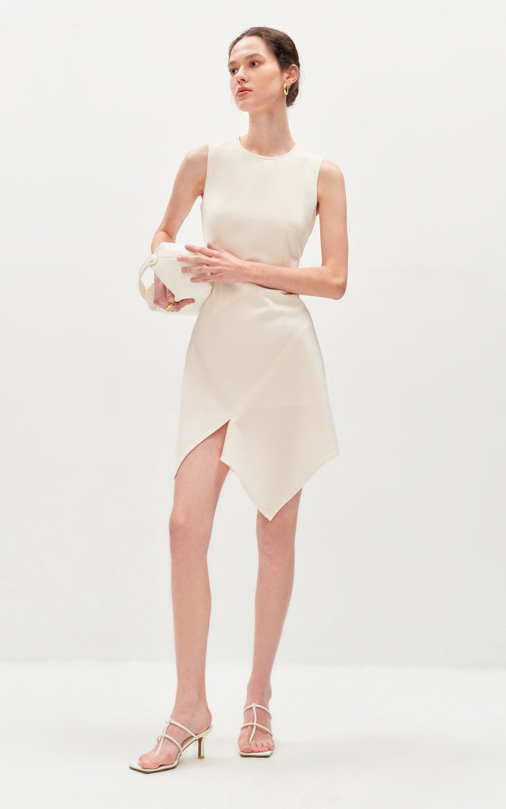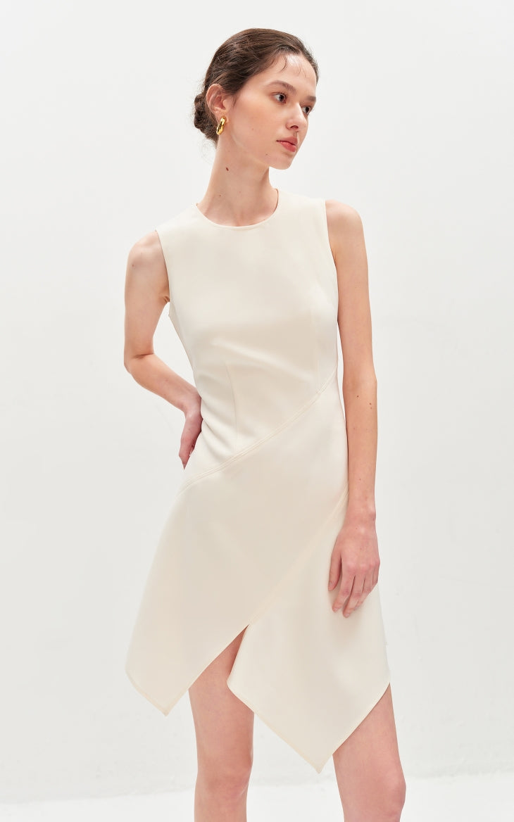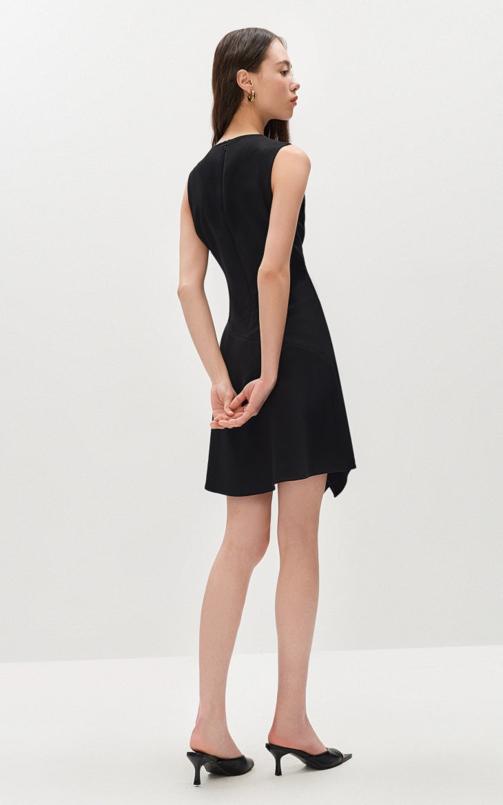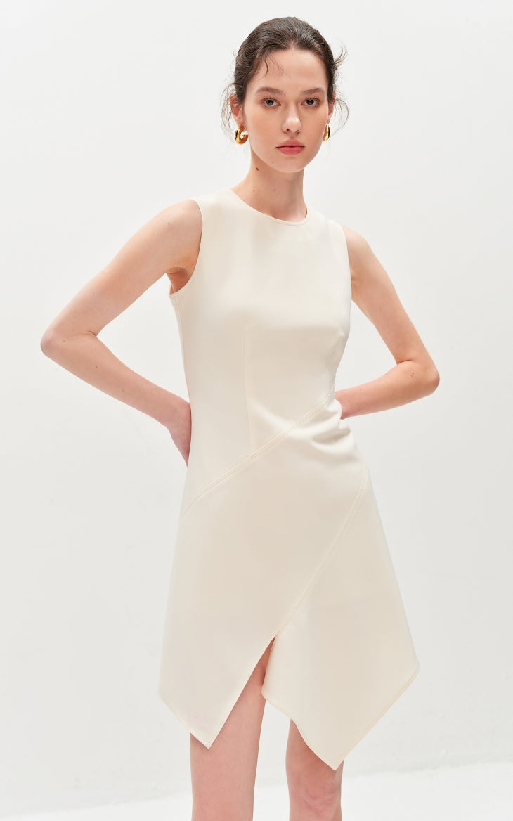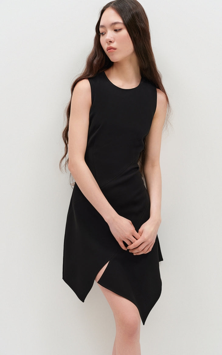 This dress features slimming three-dimensional tailoring that enhances the silhouette beautifully. The irregular tank top design adds a modern edge, complemented by an asymmetrical hem for a dynamic look. The invisible zipper at the back ensures a seamless finish and easy wearability.