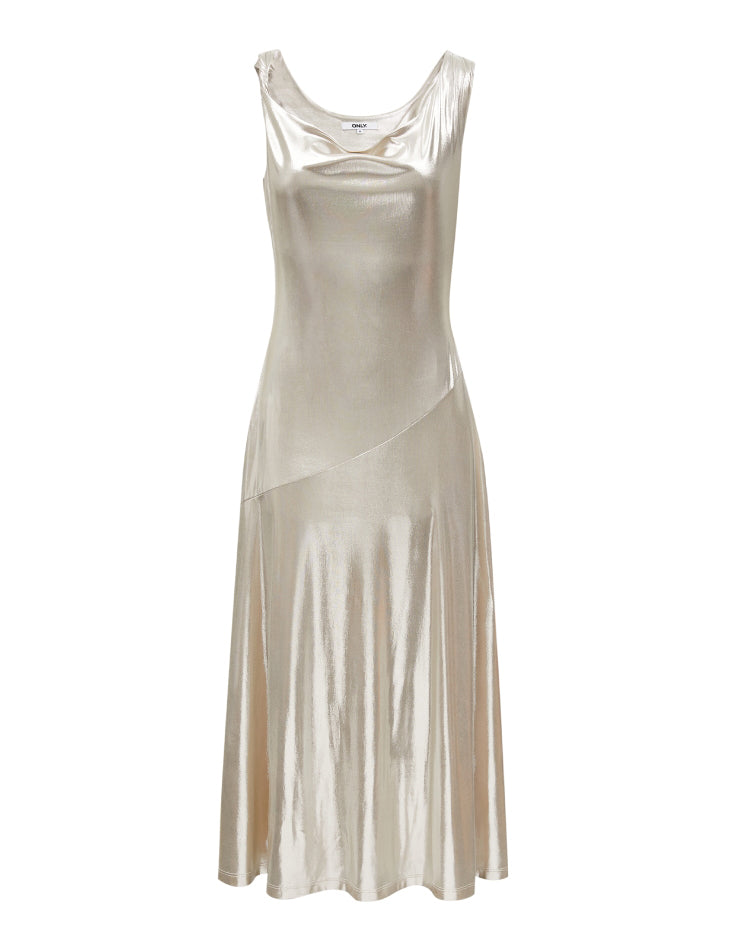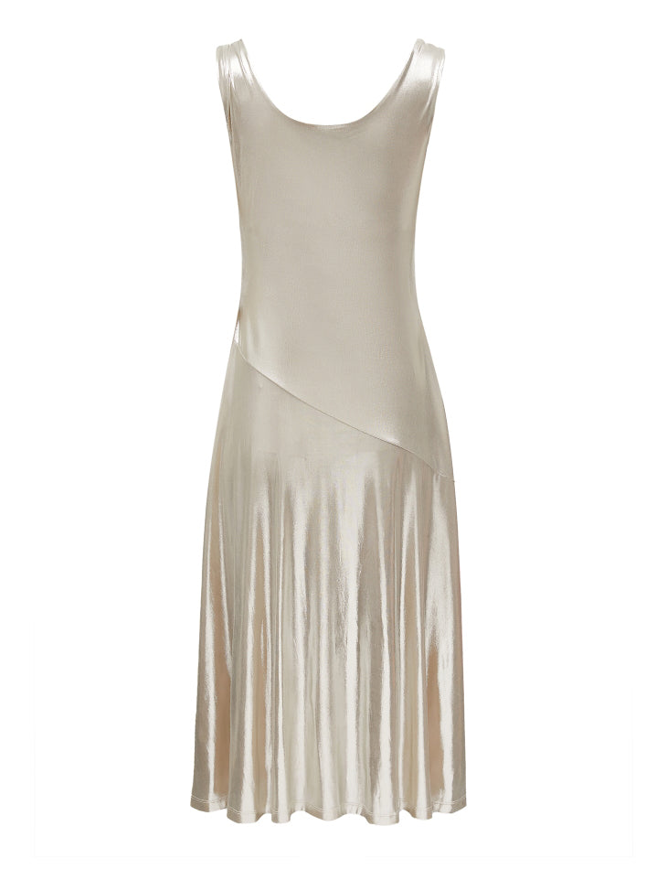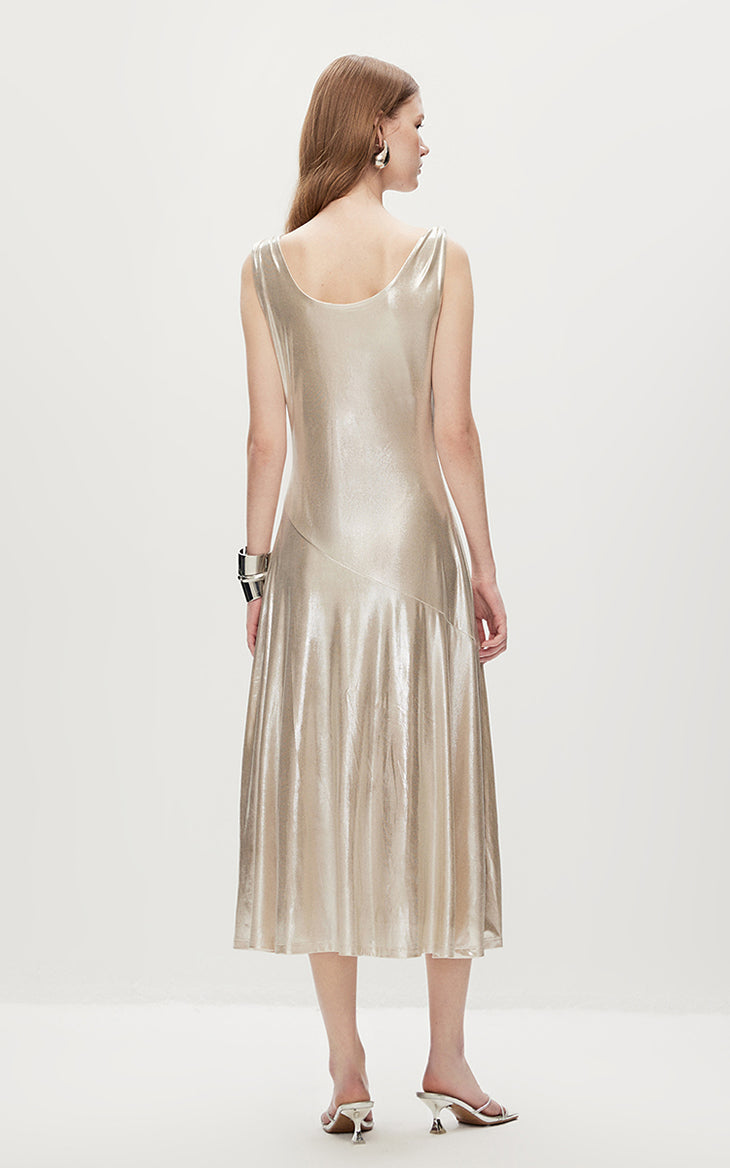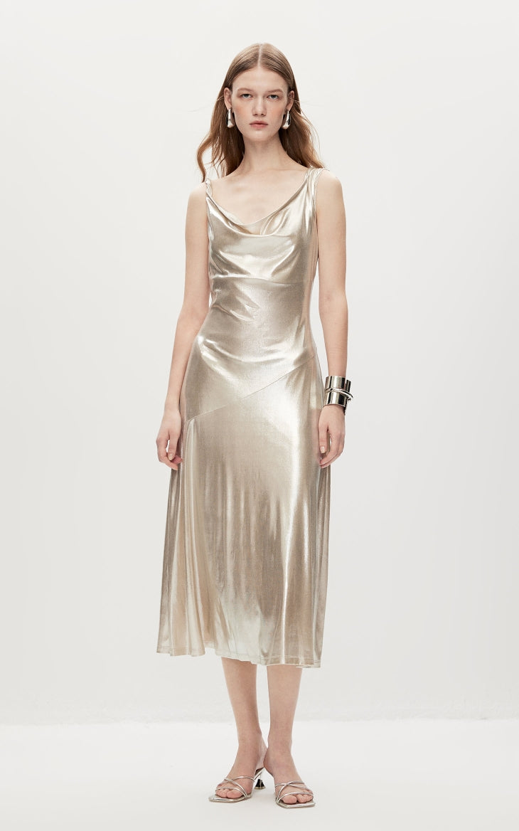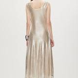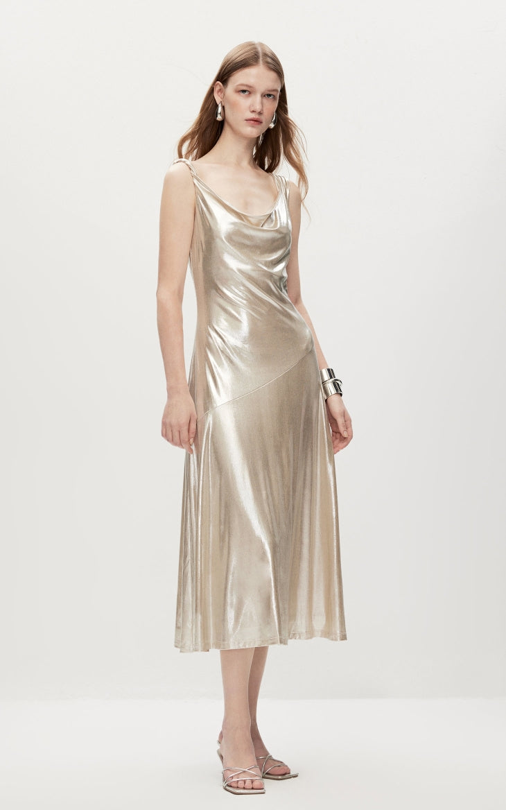 This dress is crafted from luxurious metallic polarized fabric that shimmers with sophistication. The bias-cut ruffled hem adds dynamic movement and a touch of playful elegance, while the refined neckline completes the design with a graceful and polished look.