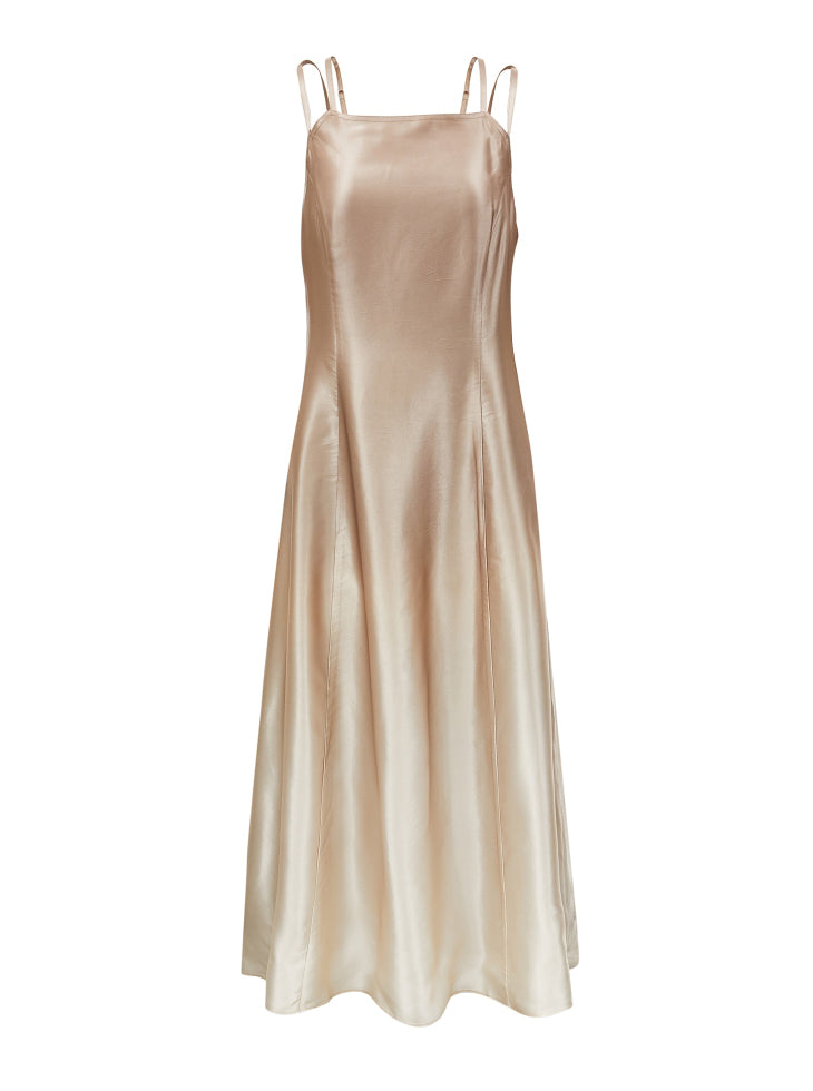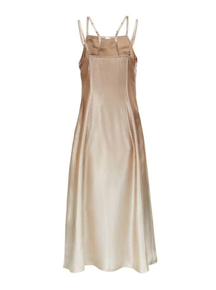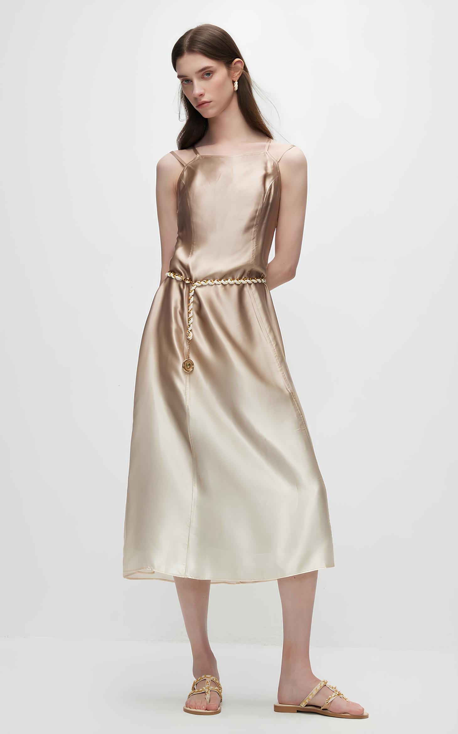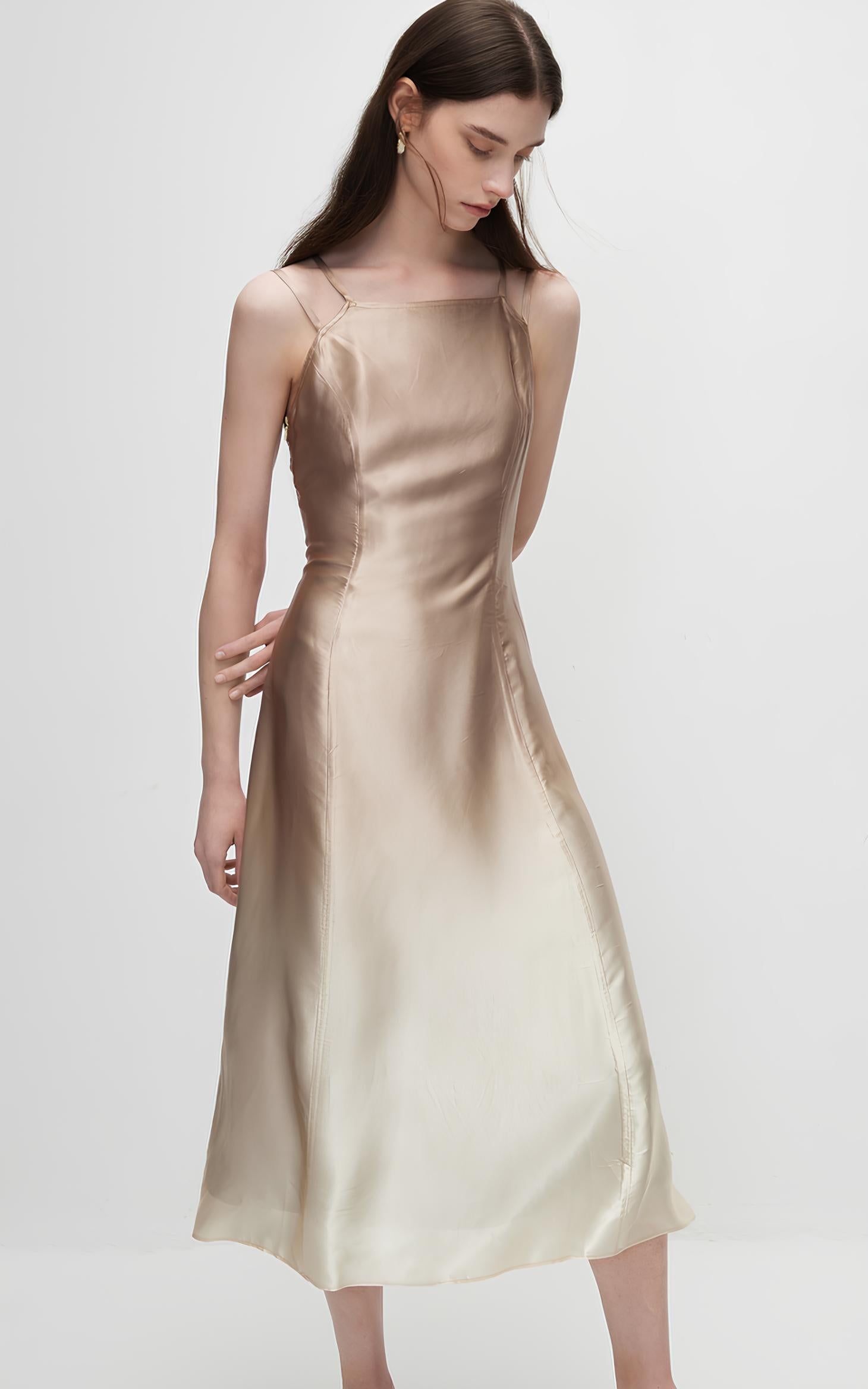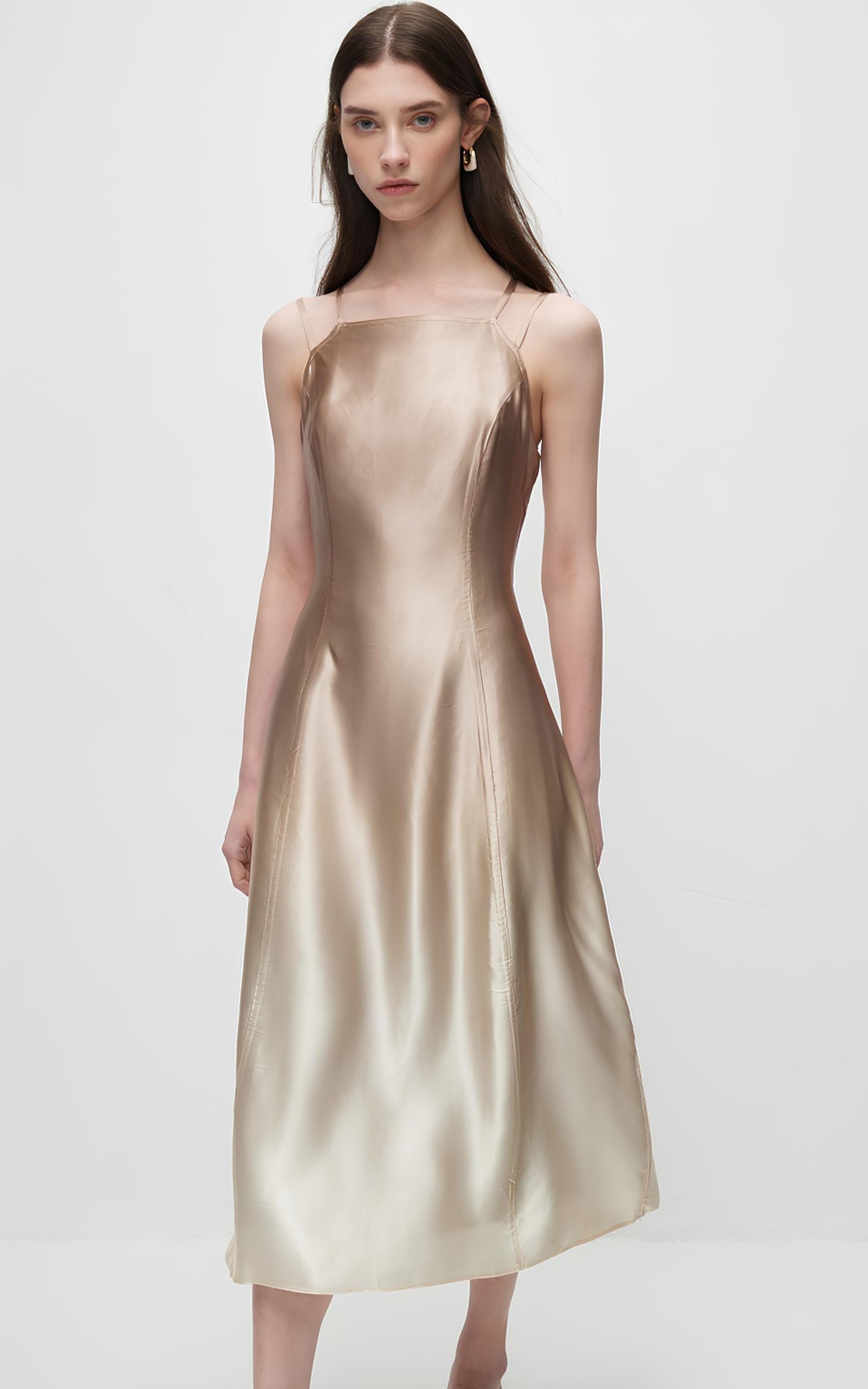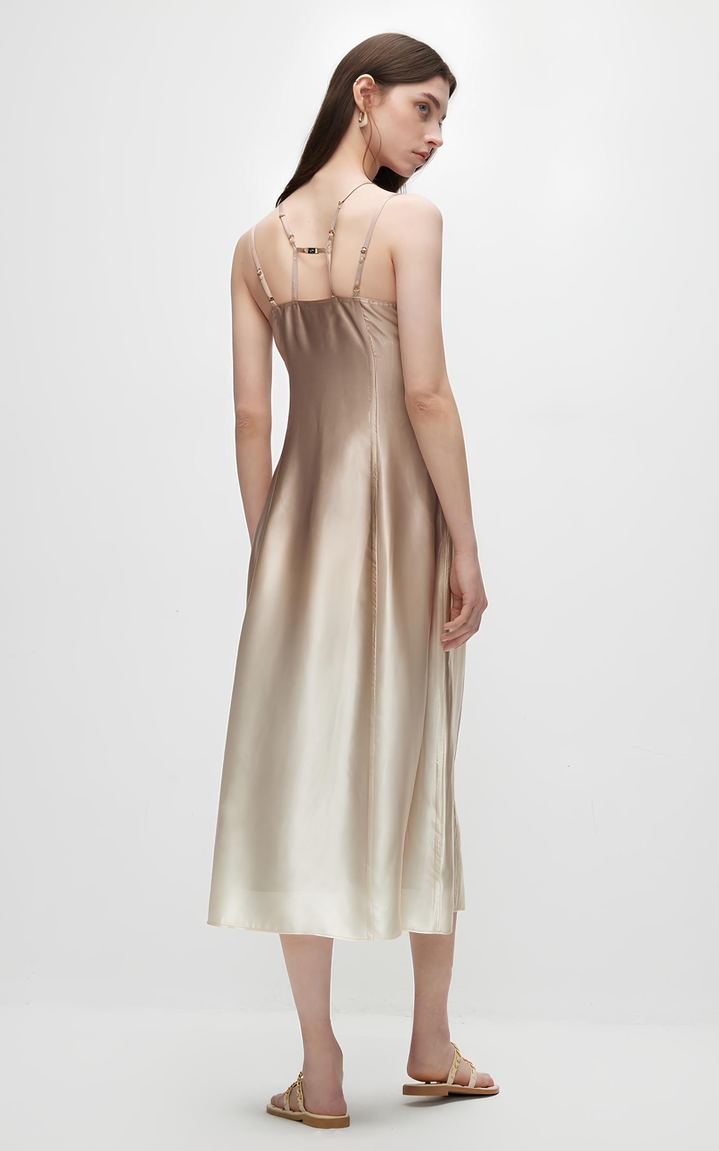 This dress features double lines that slim the waist, creating an elegant and slimming silhouette. The adjustable double shoulder straps offer a customizable fit, while the silky draped fabric adds a luxurious and flowing touch to the design.