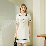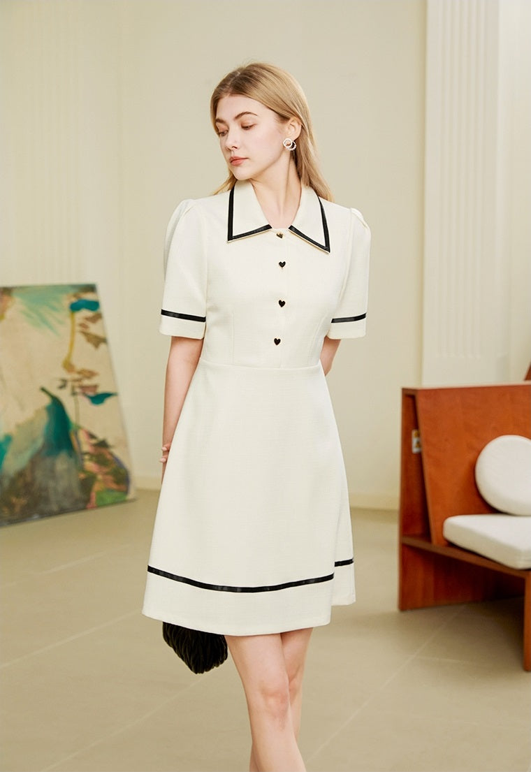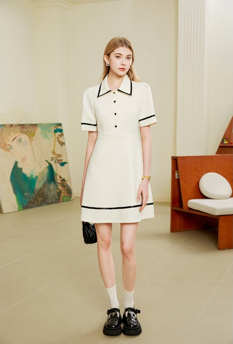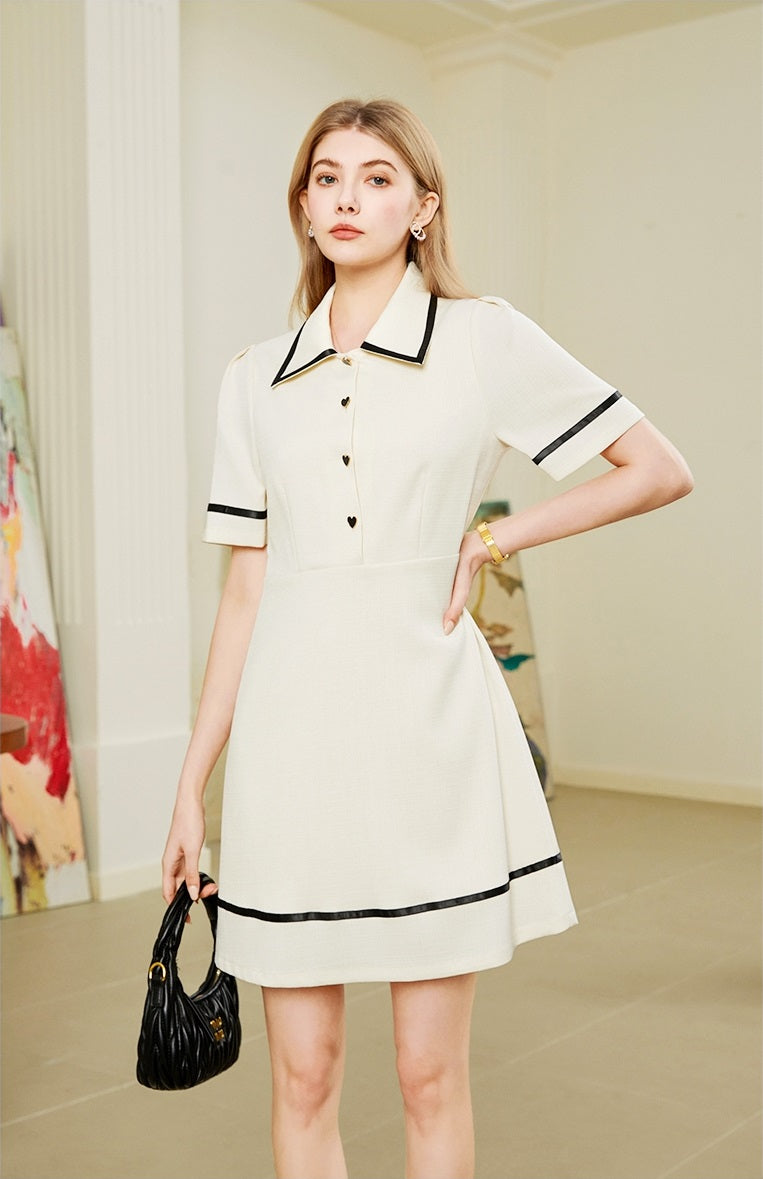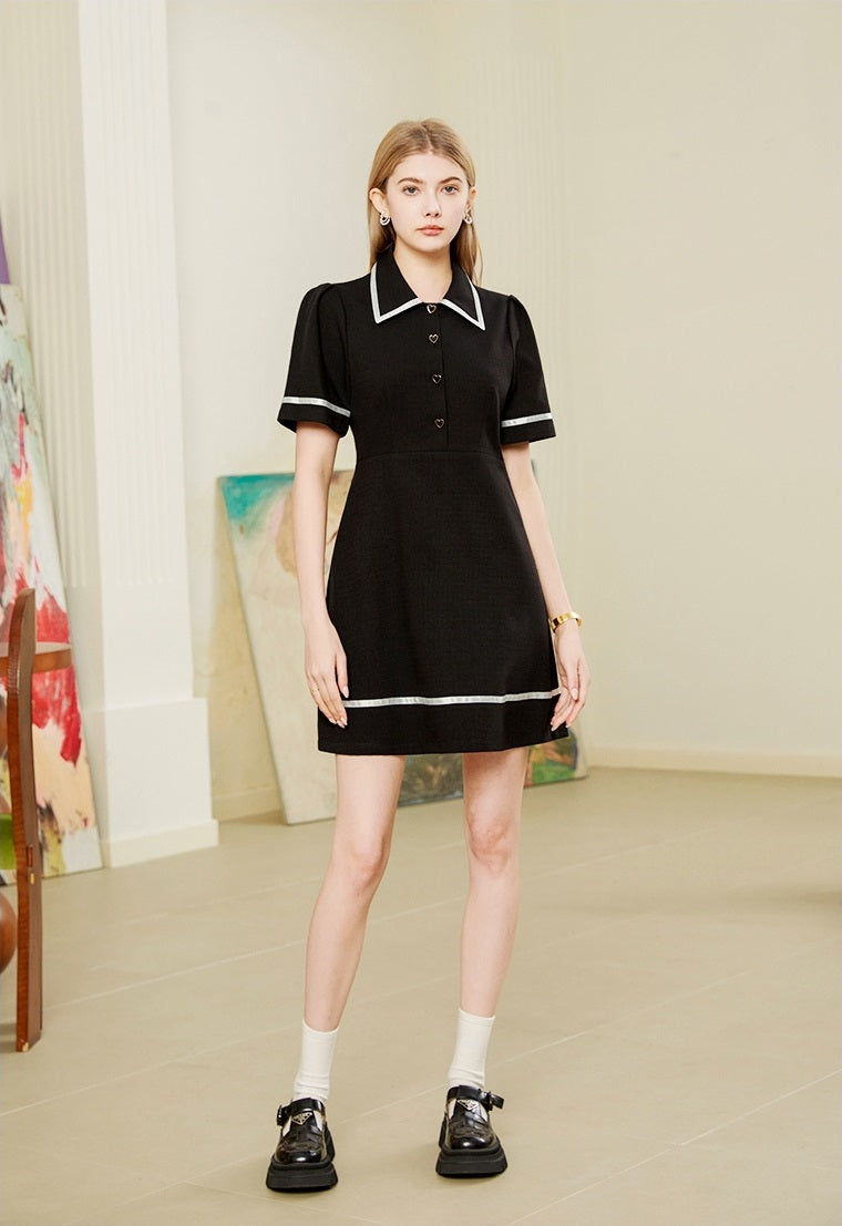 This charming dress is designed with a sophisticated collar and striking contrast stripes that add a fresh, youthful touch to the classic style. The soft, structured fabric is enhanced with heart-shaped buttons, creating a subtle yet eye-catching focal point. Perfect for both casual outings and semi-formal occasions, the dress is versatile, flattering, and comfortable. The gentle puffed sleeves and A-line silhouette create a balanced and elegant look that complements various body types, making it a perfect addition to your wardrobe.
