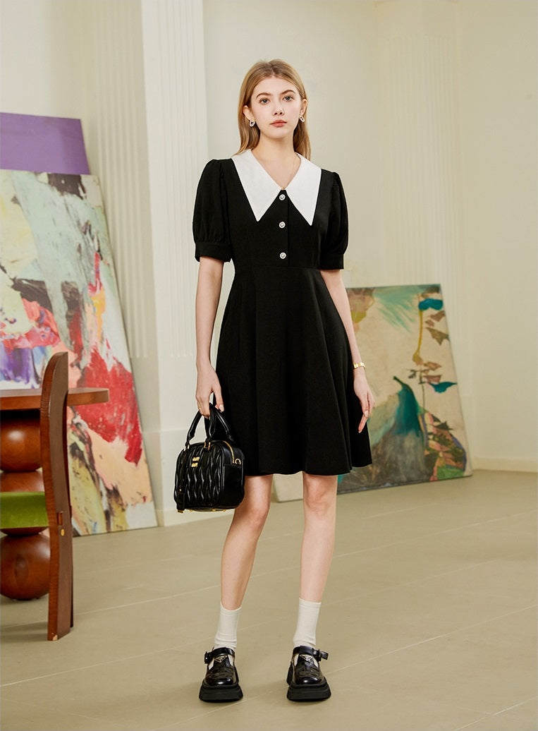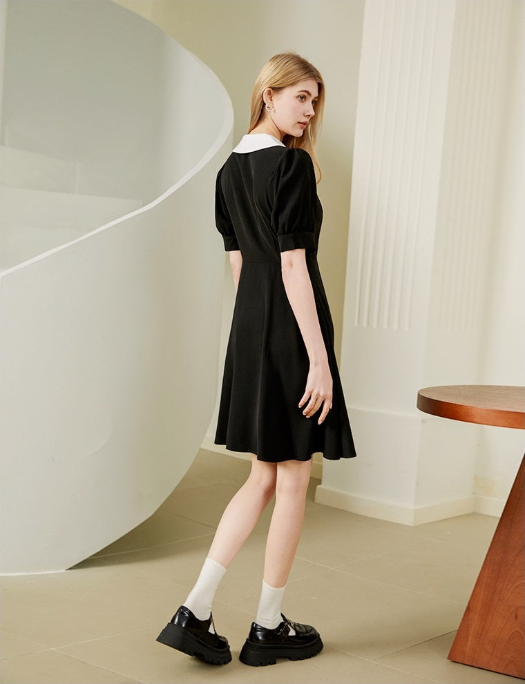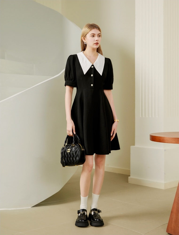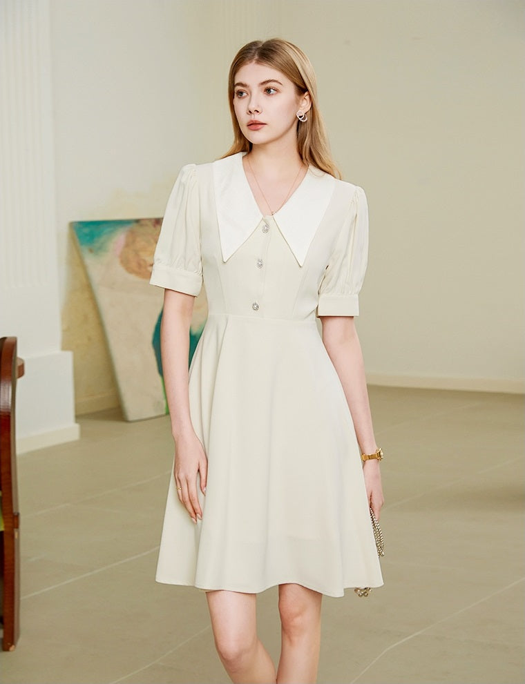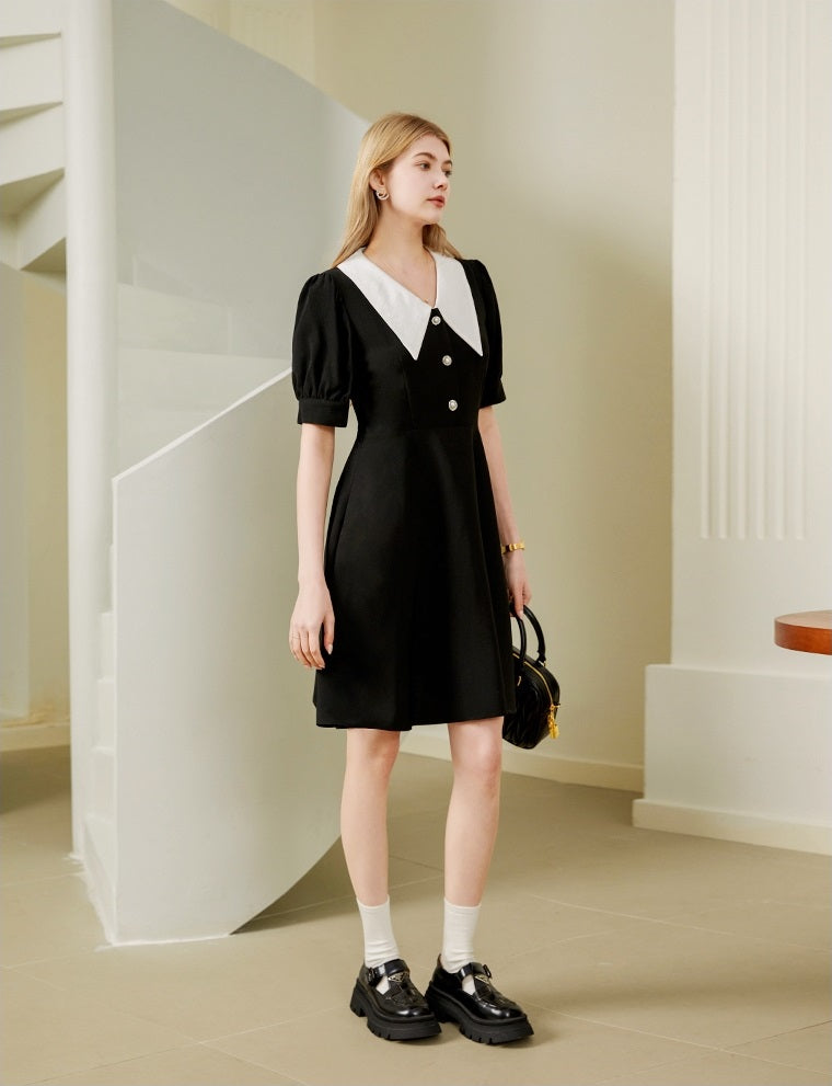 This dress features a flattering high-waisted, tailored design that perfectly balances style and comfort. With its mid-length cut, it is ideal for both professional and casual settings. The elegant construction is complemented by a sleek silhouette that enhances the figure, while the carefully selected fabric ensures a luxurious feel and appearance. The crisp lines and simple detailing make this piece versatile, offering a timeless yet modern look. Ideal for those seeking a polished, refined outfit with a touch of sophistication.