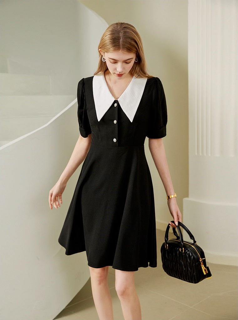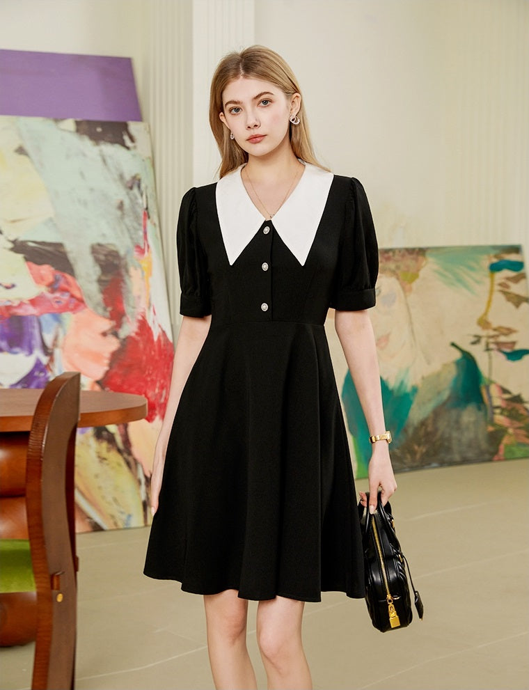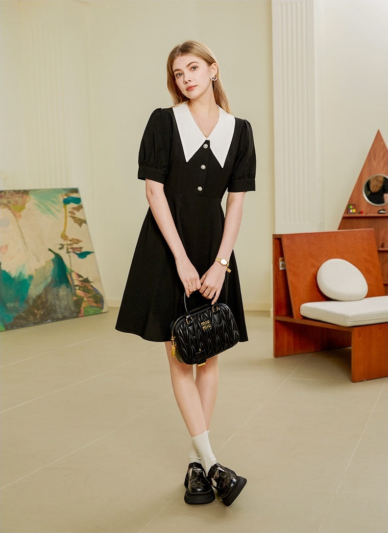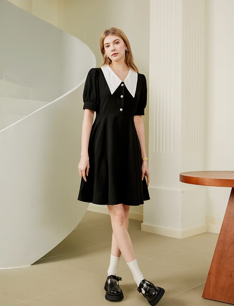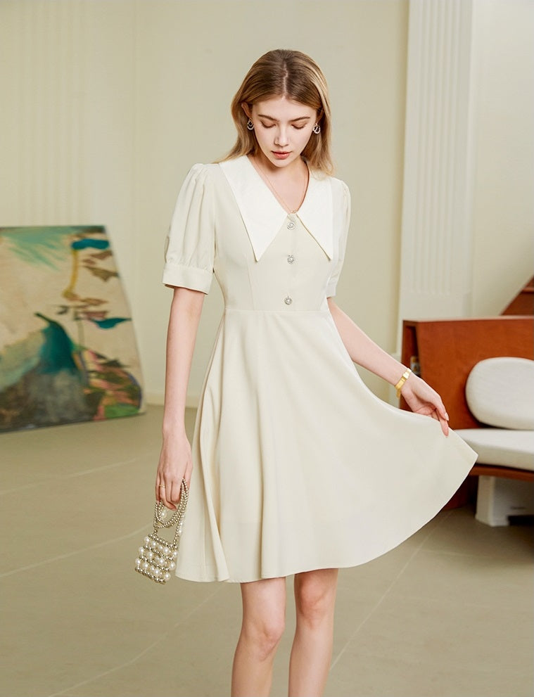 This dress features a flattering high-waisted, tailored design that perfectly balances style and comfort. With its mid-length cut, it is ideal for both professional and casual settings. The elegant construction is complemented by a sleek silhouette that enhances the figure, while the carefully selected fabric ensures a luxurious feel and appearance. The crisp lines and simple detailing make this piece versatile, offering a timeless yet modern look. Ideal for those seeking a polished, refined outfit with a touch of sophistication.