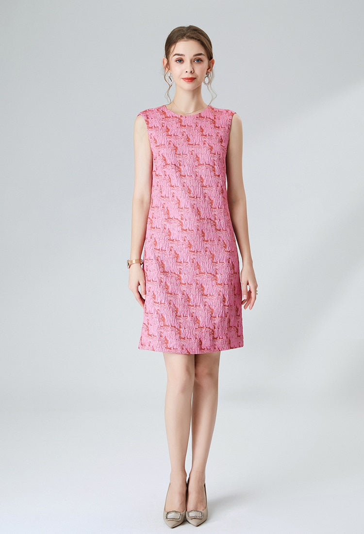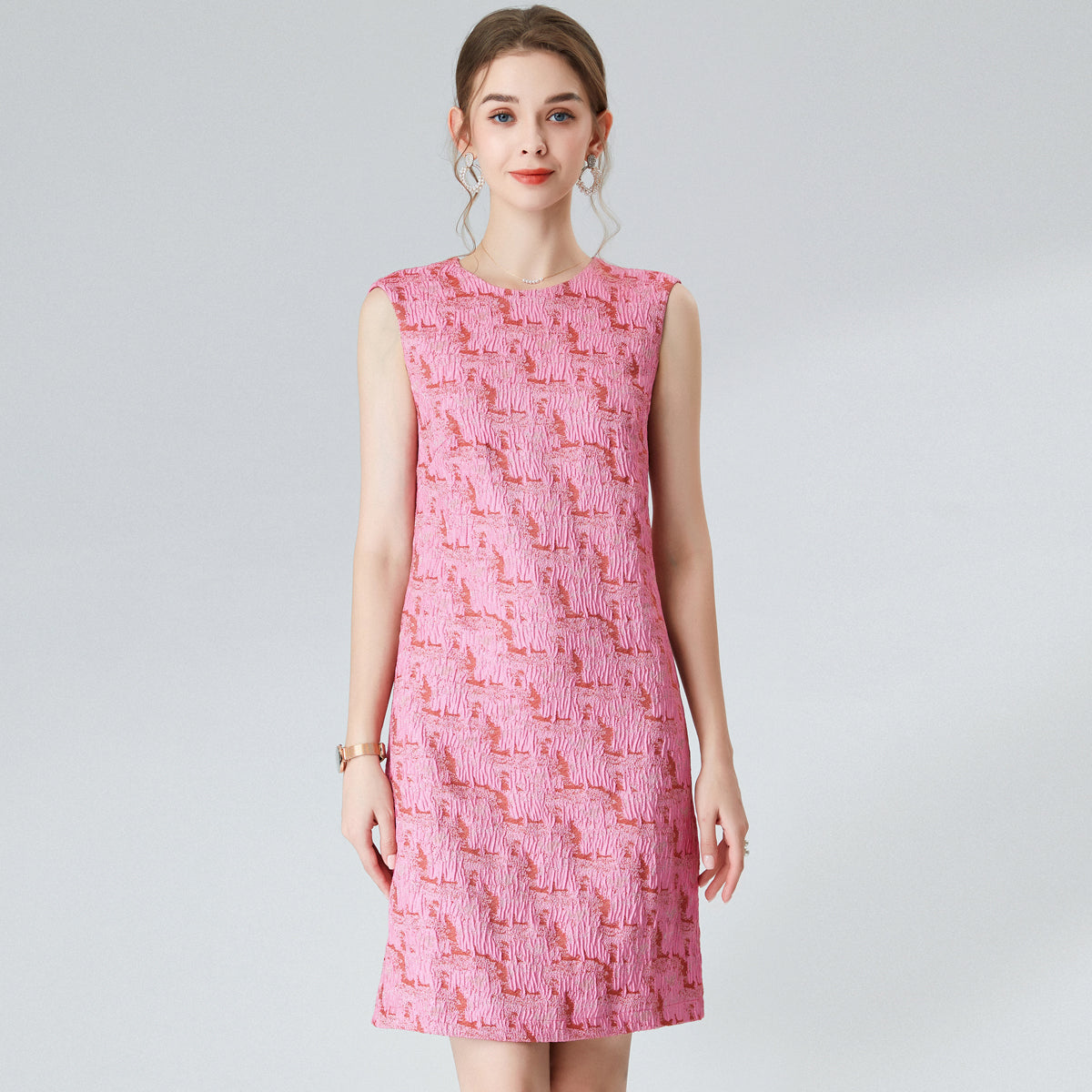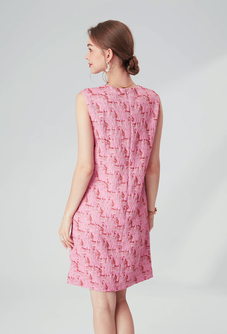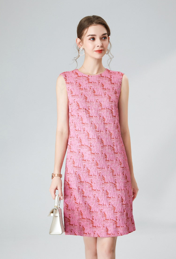 This pink patterned dress features an elegant and sophisticated hem design, adding a refined touch to its overall look. The pattern enhances the dress's charm, making it perfect for a chic and stylish appearance.