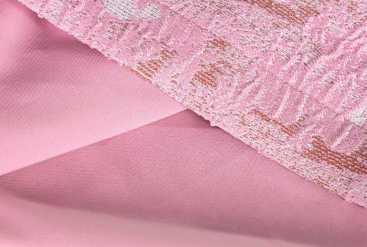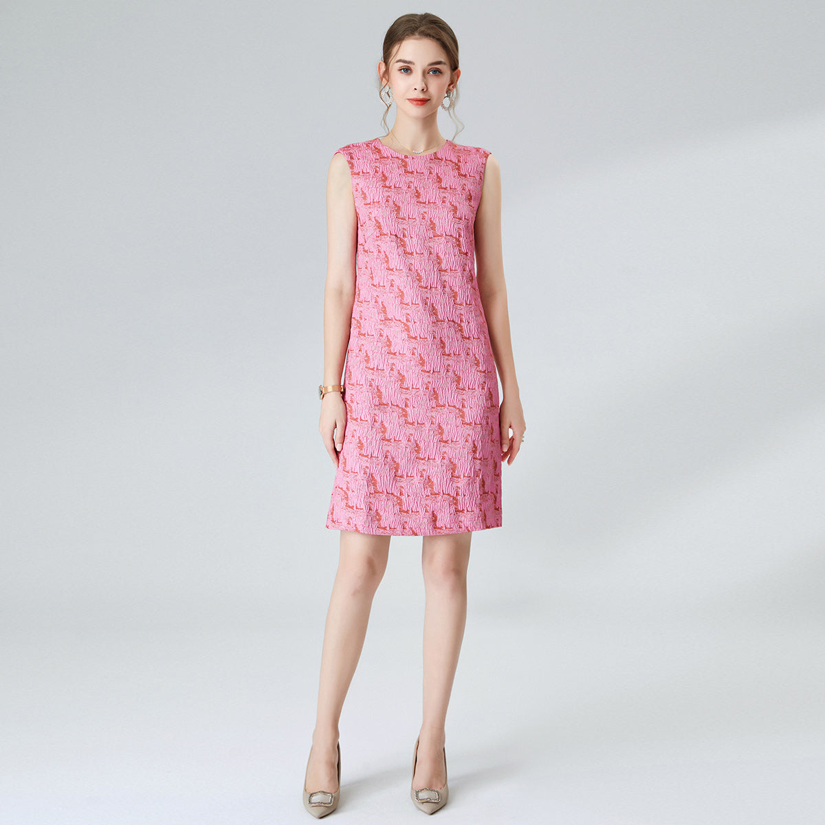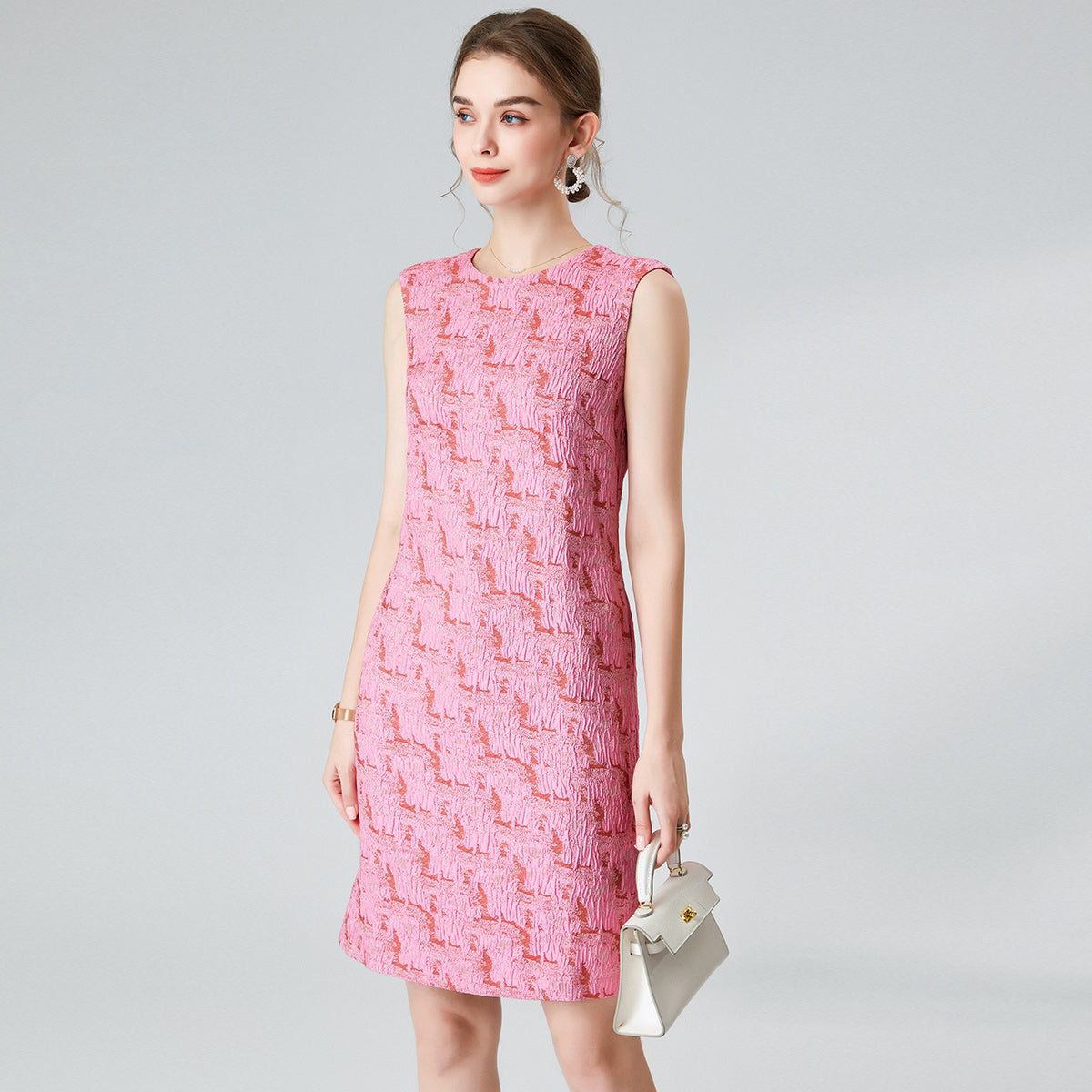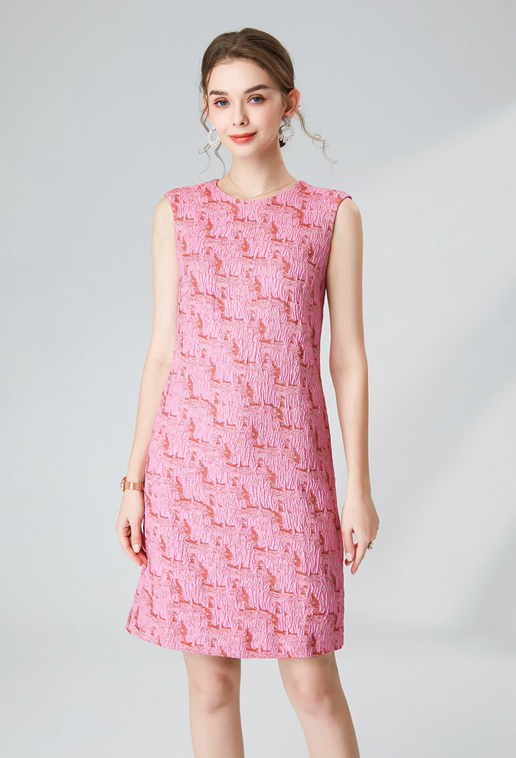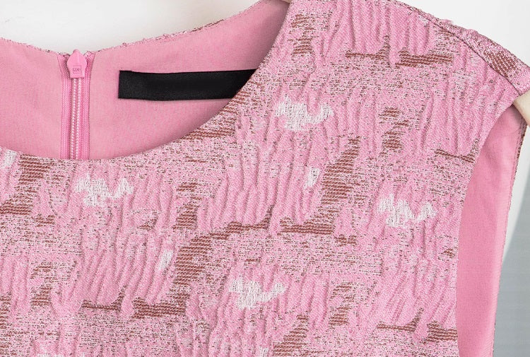 This pink patterned dress features an elegant and sophisticated hem design, adding a refined touch to its overall look. The pattern enhances the dress's charm, making it perfect for a chic and stylish appearance.