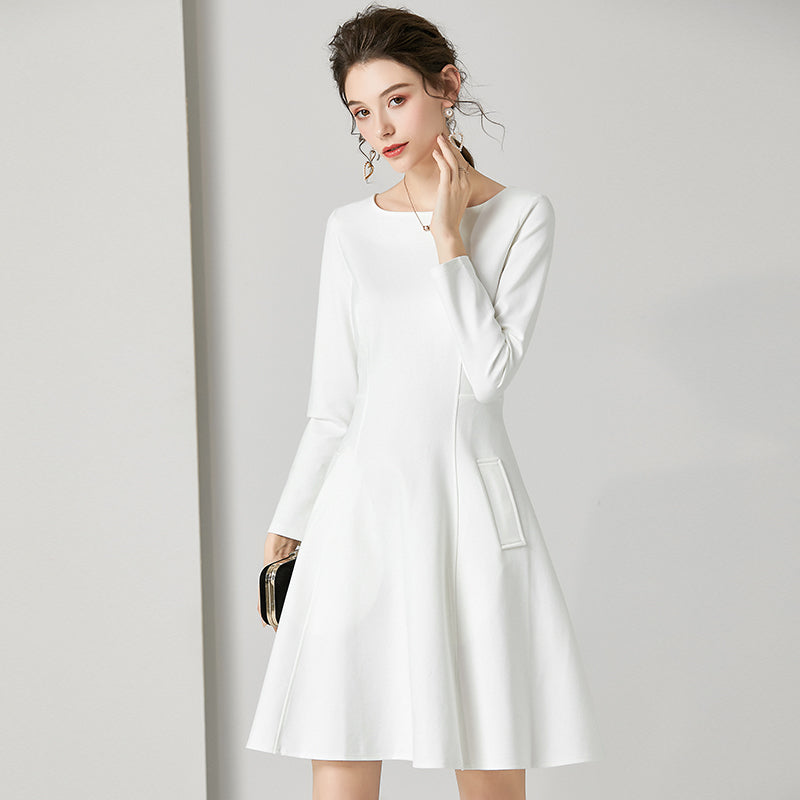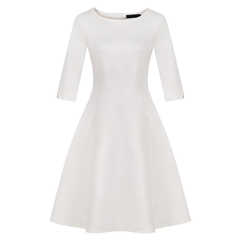 This dress features a stylish round neck design that reveals charming collarbones, adding a delicate touch. The loose sleeves provide comfort and ease, while the elegant A-line skirt creates a flattering and timeless silhouette.