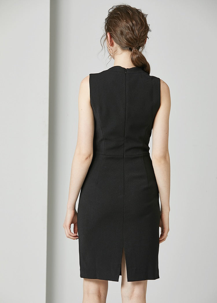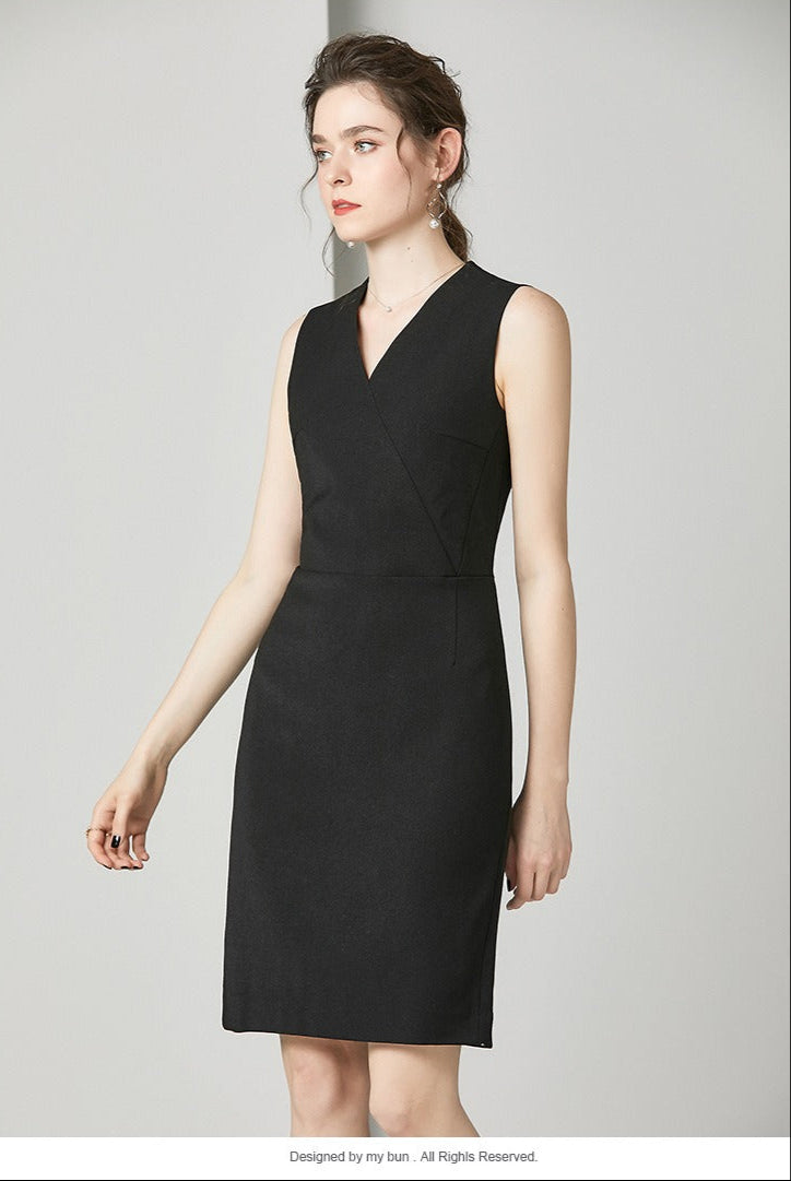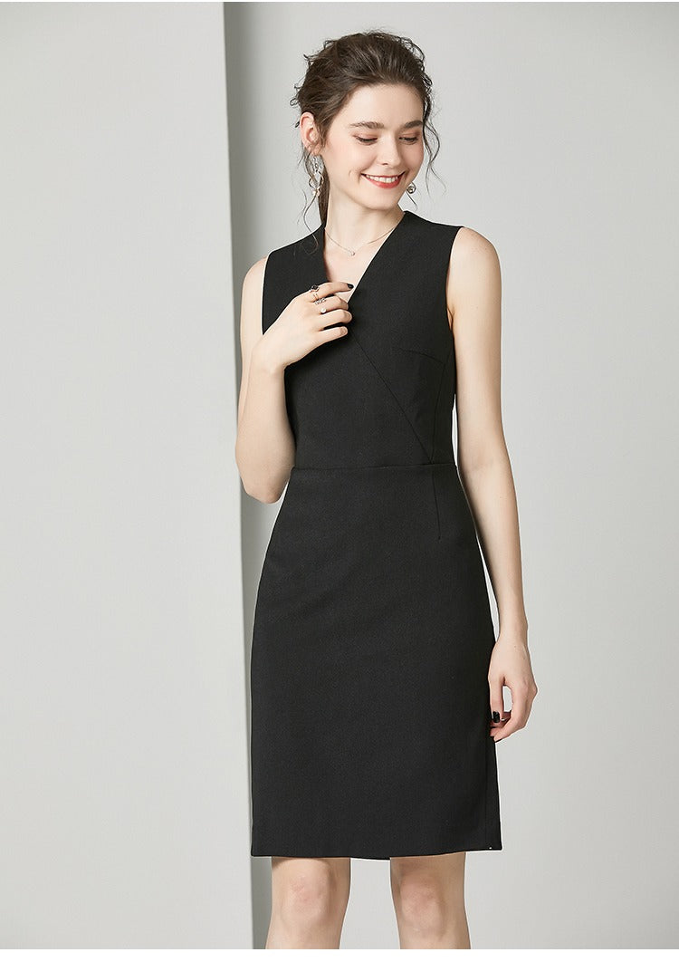 This black dress features a simple yet elegant design with a V-shaped neckline that adds a touch of sophistication. Made from silky fabric, it offers a smooth, luxurious feel and a flattering fit.
