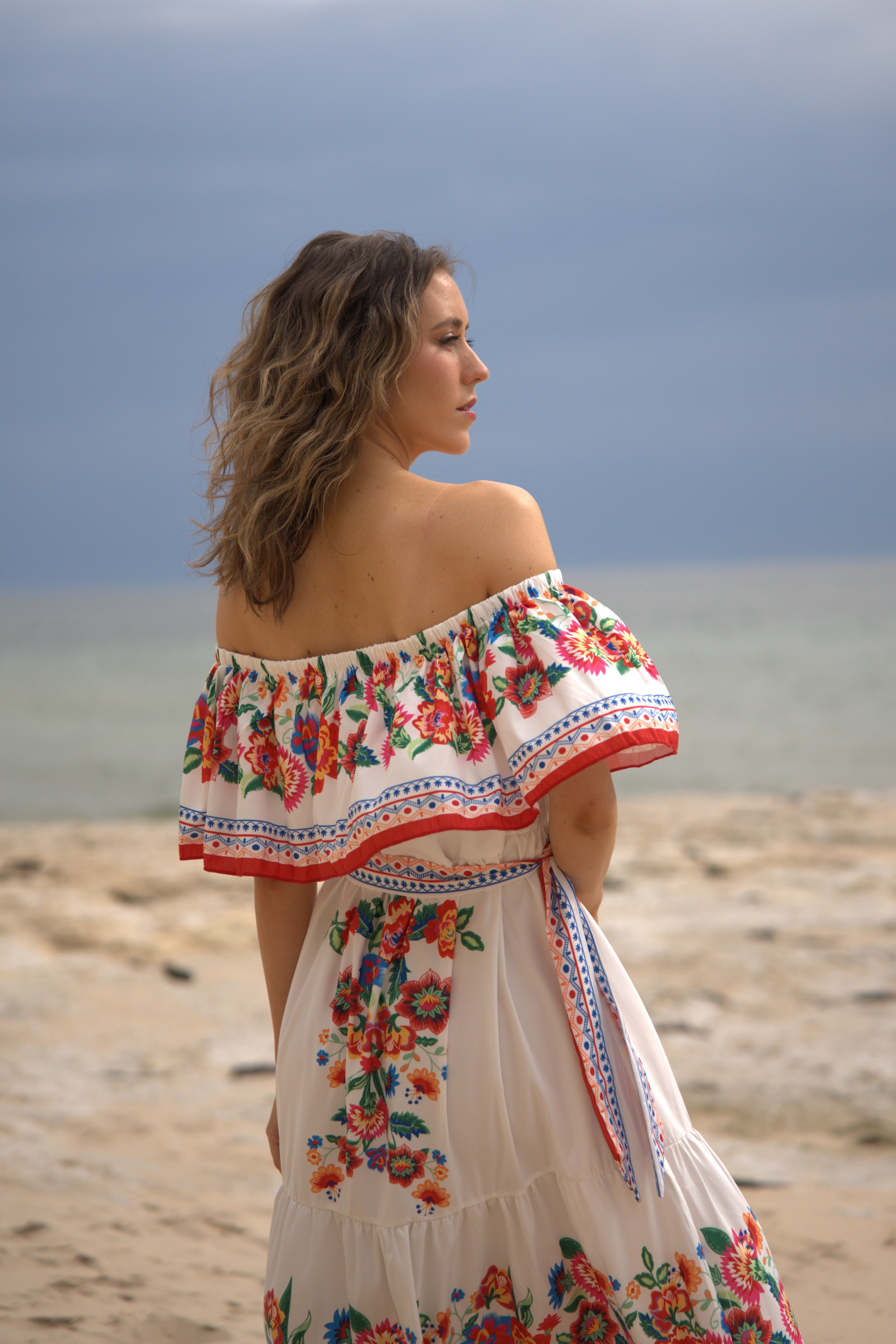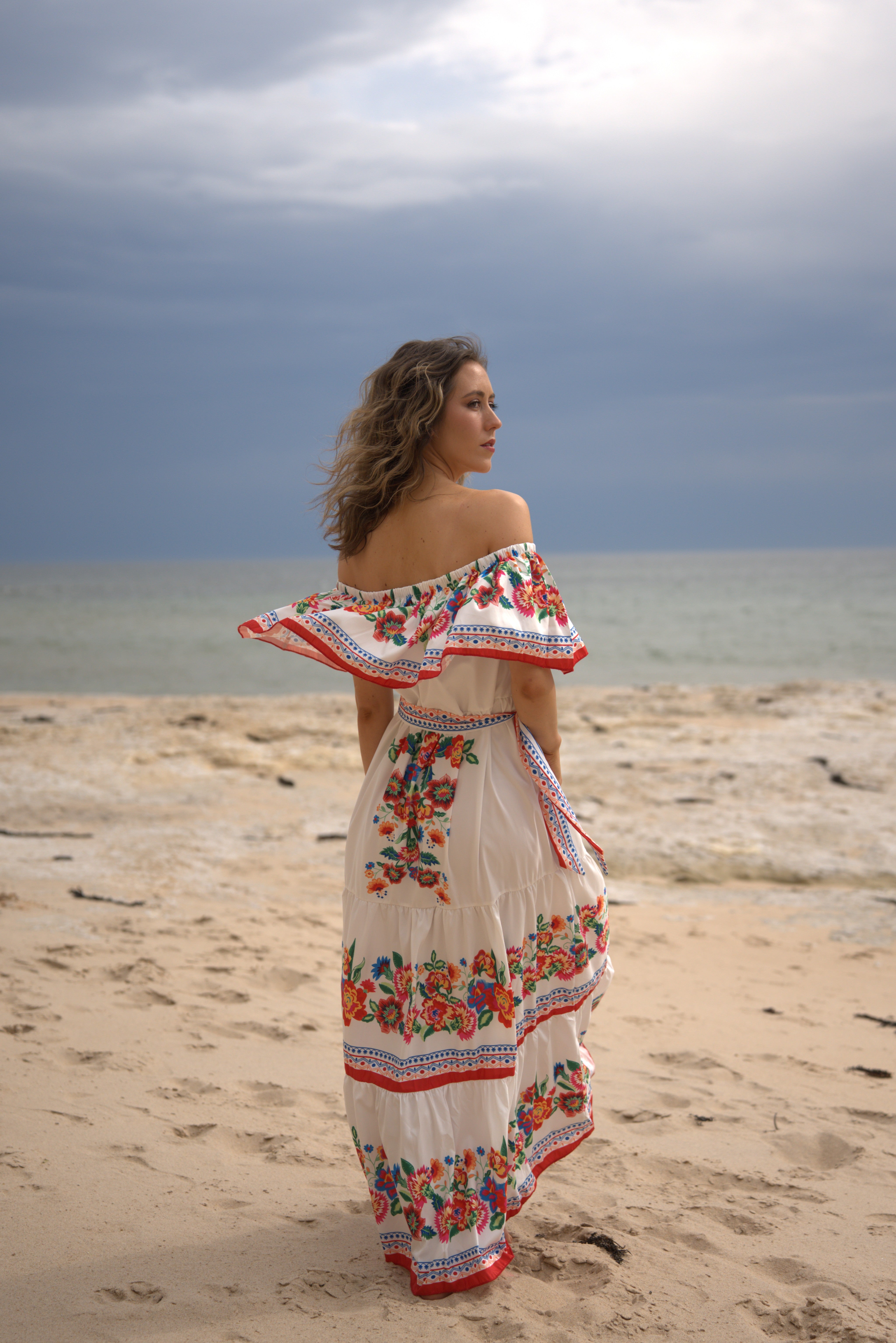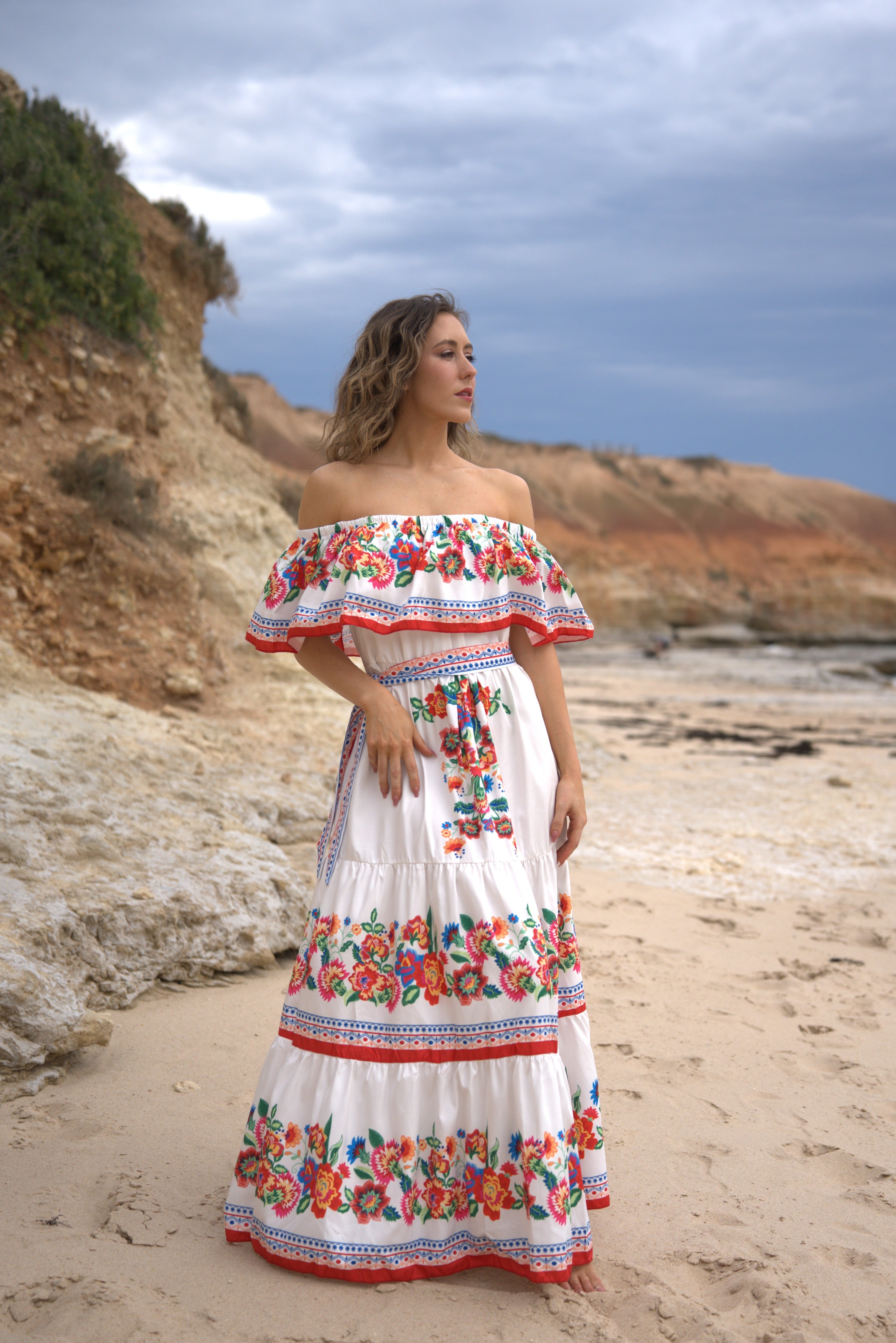 This embroidered floral off-shoulder maxi dress is designed with a bold folkloric touch, blending vivid blooms and artisanal details into a free-spirited silhouette. The off-shoulder neckline and layered ruffle accents highlight a feminine charm, while the flowing full-length cut brings graceful movement. Crafted for effortless elegance, it captures the essence of bohemian artistry in a refined way.