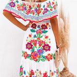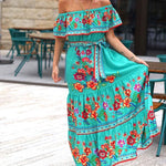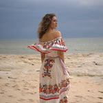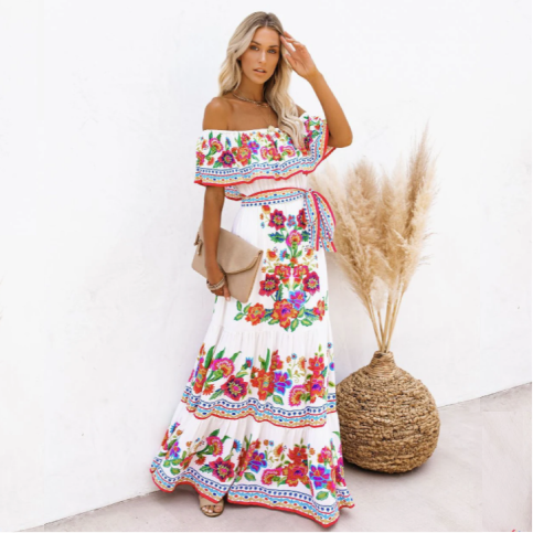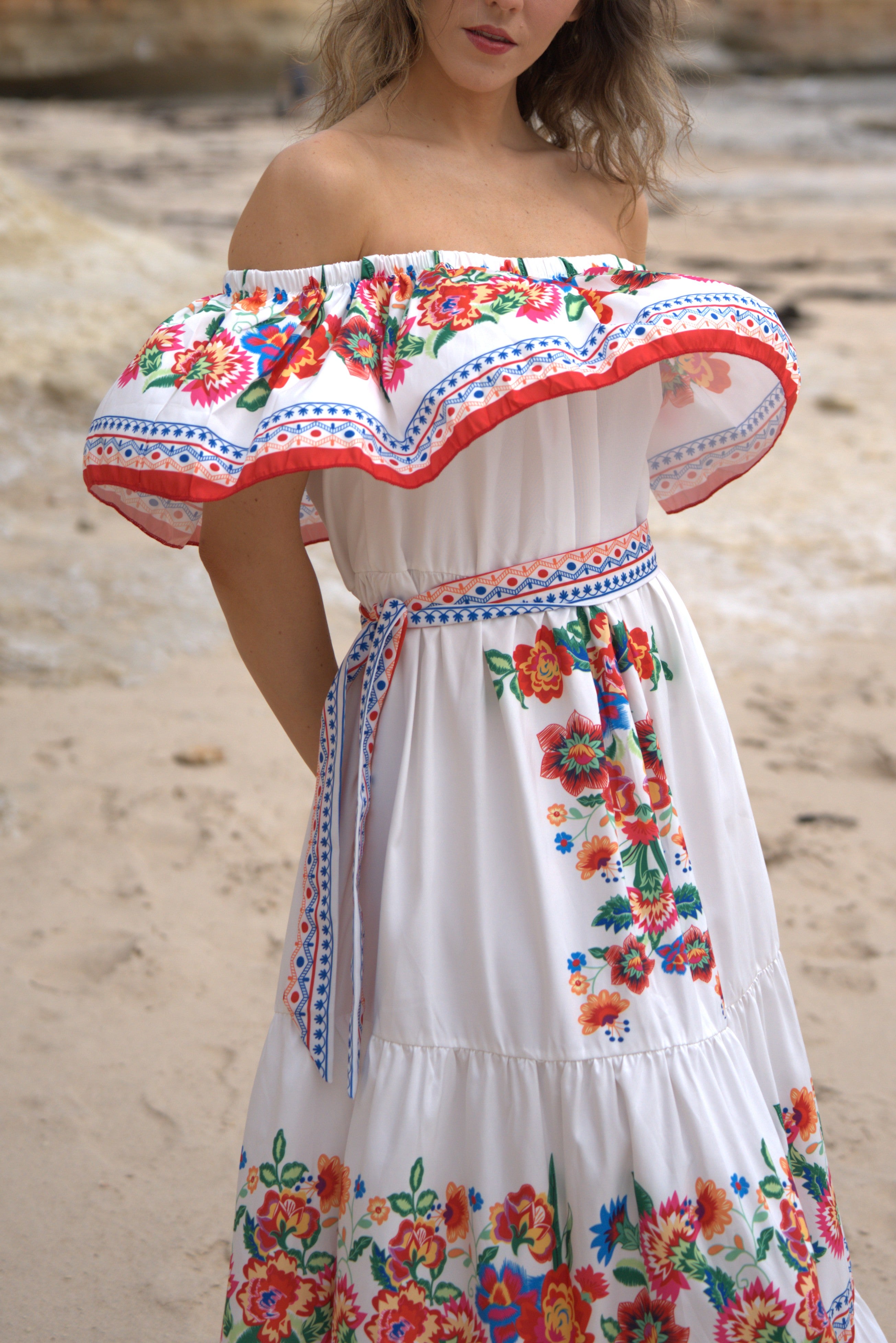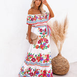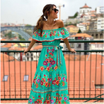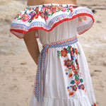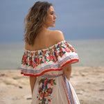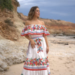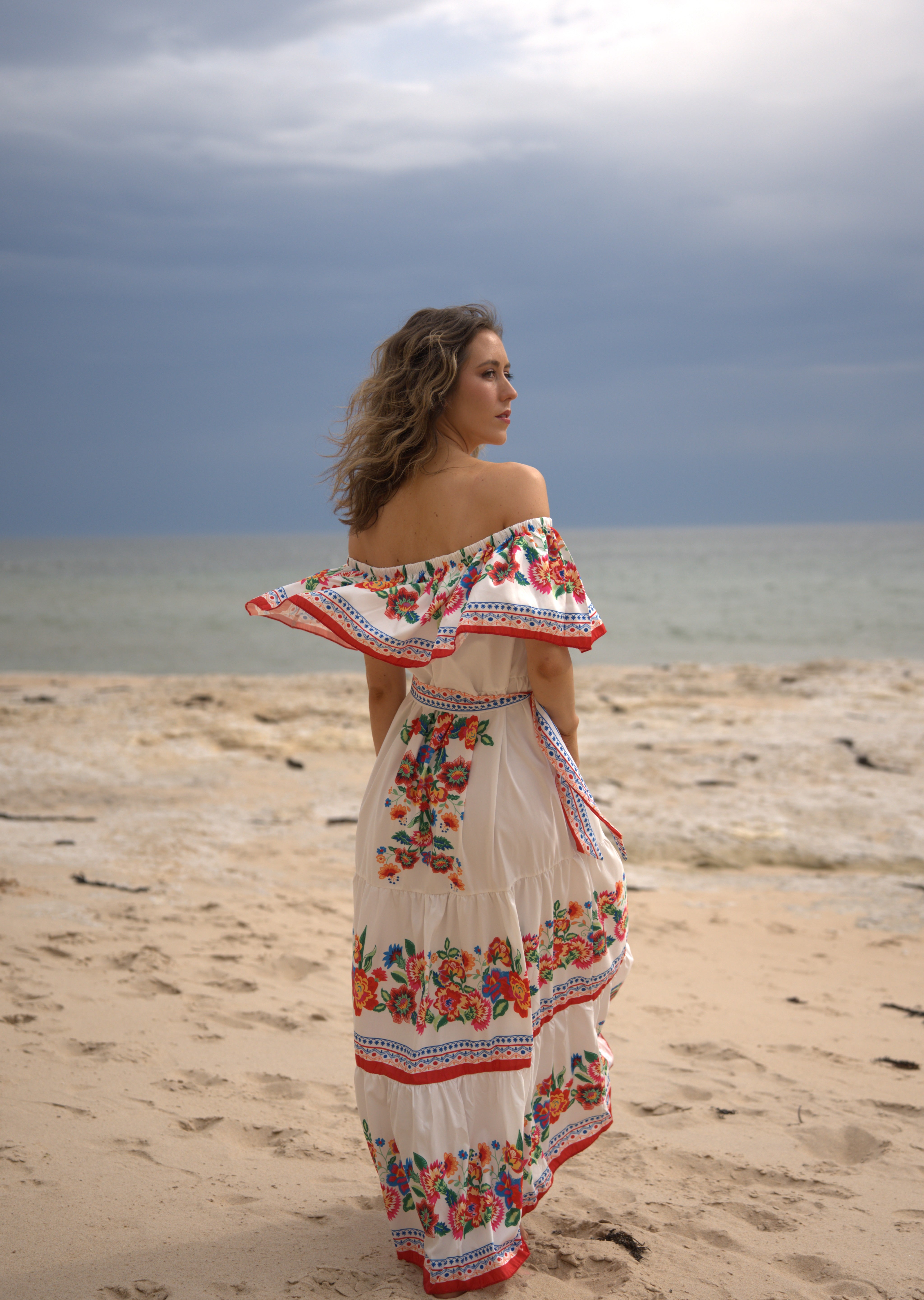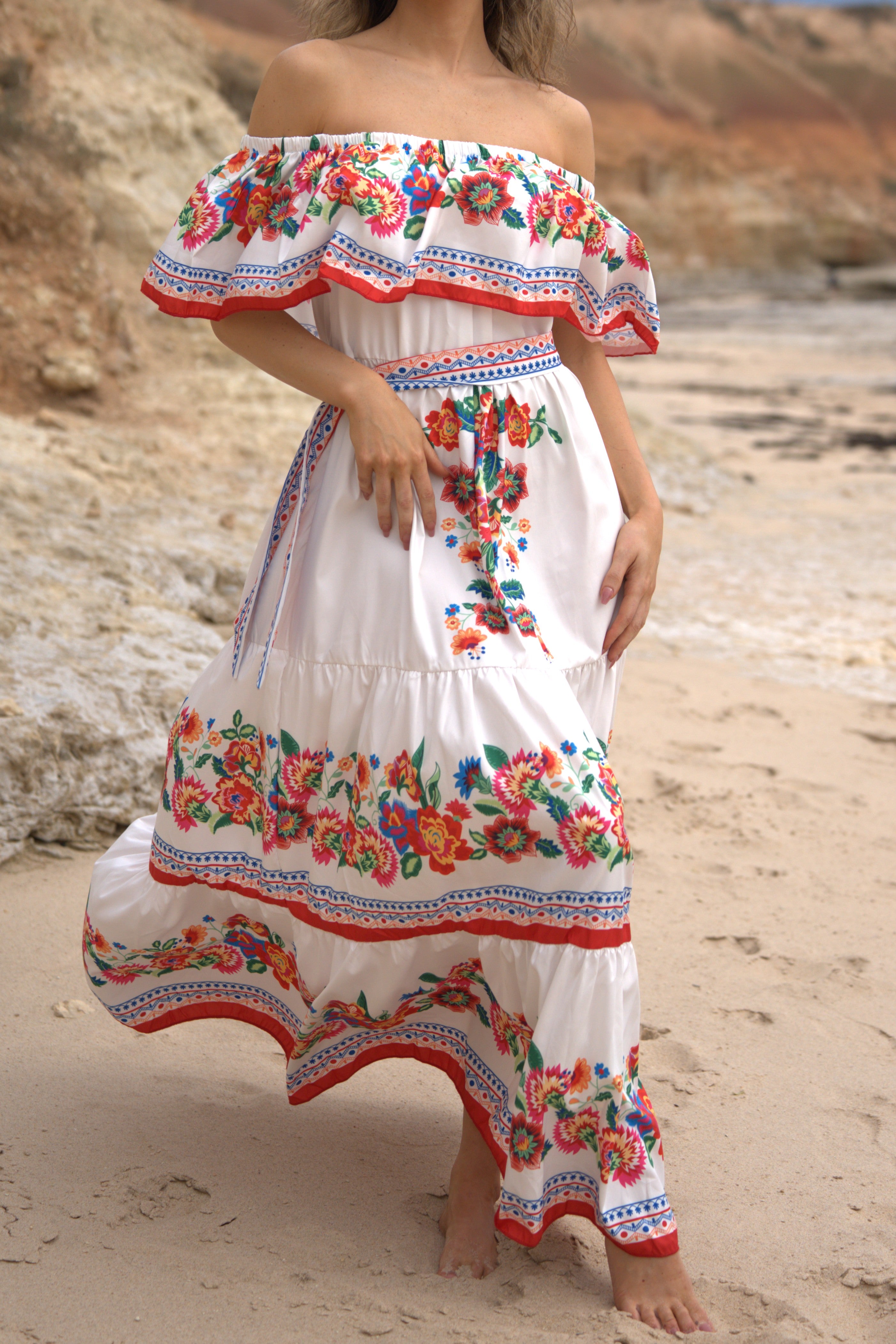 This embroidered floral off-shoulder maxi dress is designed with a bold folkloric touch, blending vivid blooms and artisanal details into a free-spirited silhouette. The off-shoulder neckline and layered ruffle accents highlight a feminine charm, while the flowing full-length cut brings graceful movement. Crafted for effortless elegance, it captures the essence of bohemian artistry in a refined way.