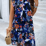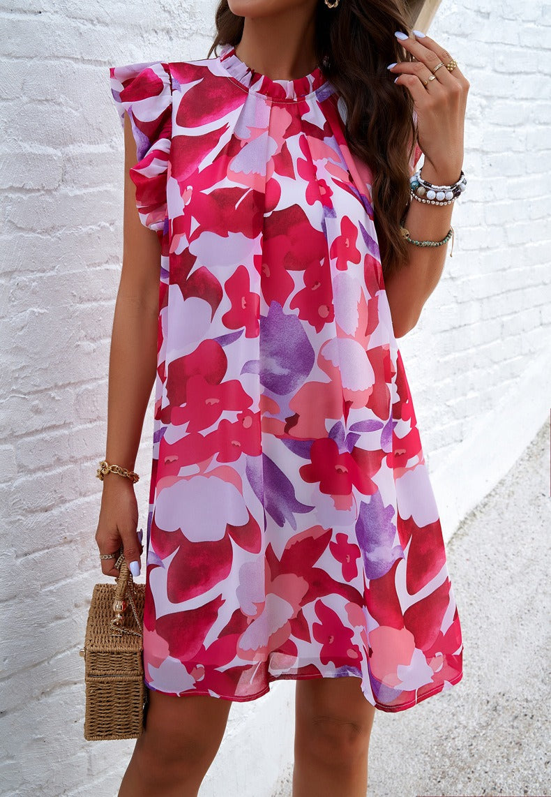 Step into effortless elegance with our Midnight Garden Flutter Sleeve Dress. Featuring a striking floral print on a deep navy base, this A-line mini dress offers a relaxed yet refined silhouette. Delicate ruffled sleeves and a softly gathered high neckline add a feminine touch, while the lightweight chiffon-like fabric ensures comfort and flow. Perfect for sunny getaways, weekend brunches, or casual evenings out.