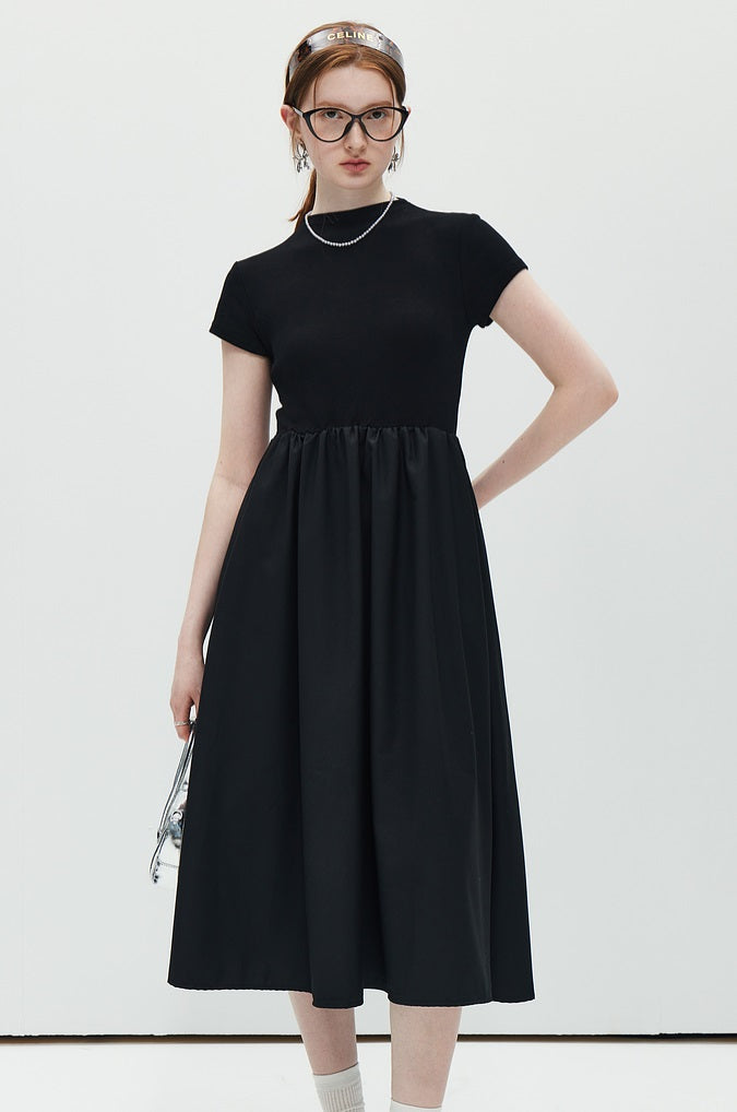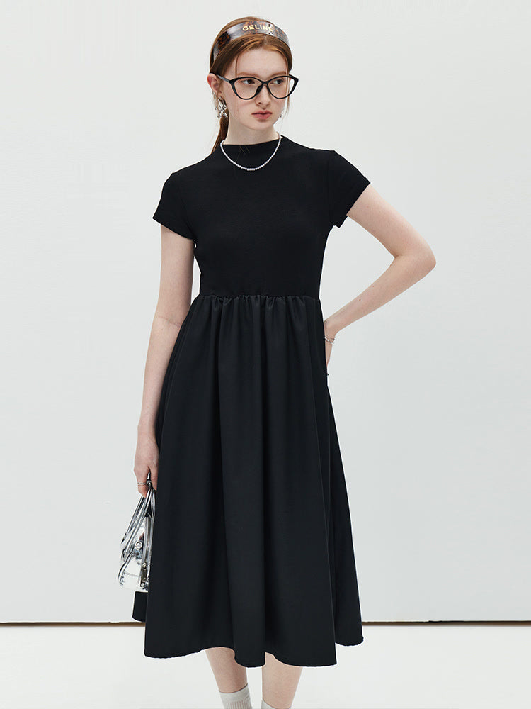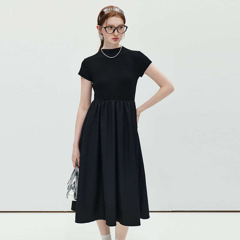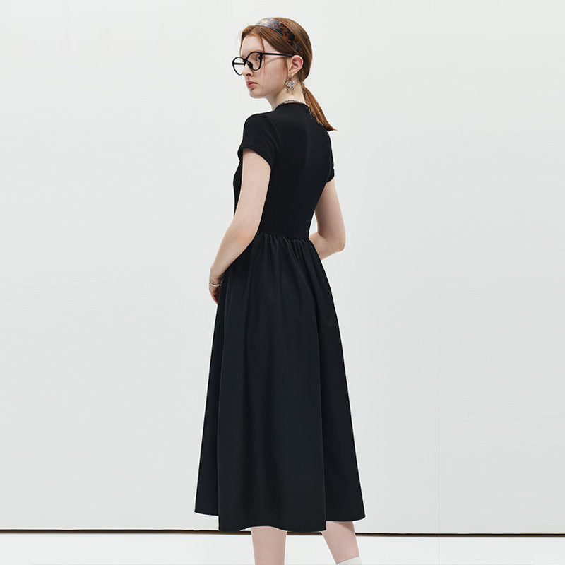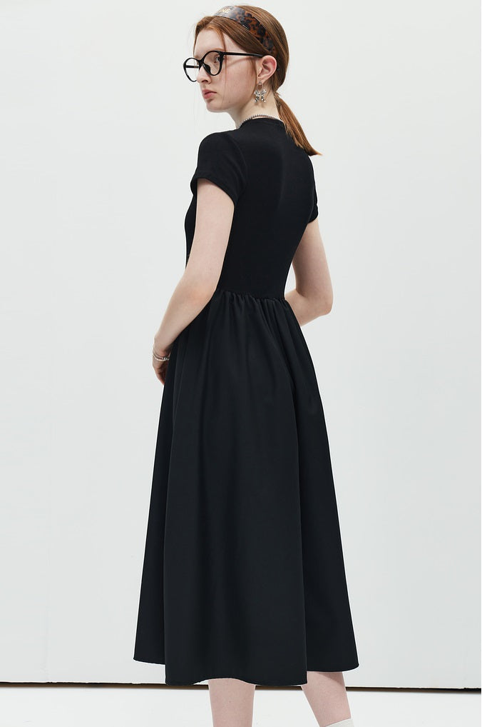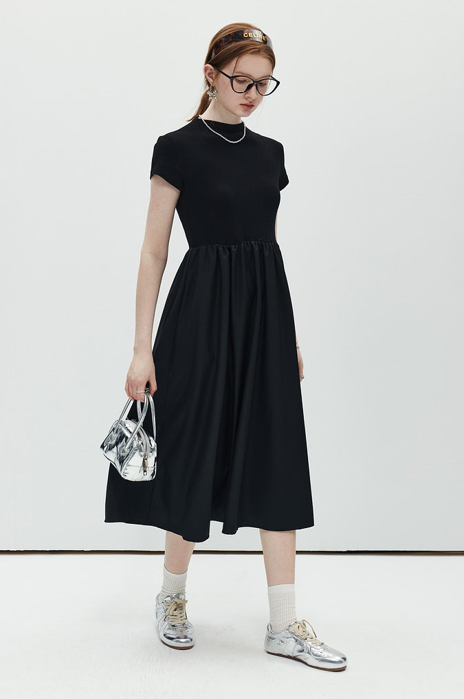 This dress combines smart elegance with a relaxed, casual vibe. The half-high collar design offers comfort, while the spliced materials enhance the waistline and elongate the proportions, creating a flattering and stylish silhouette.