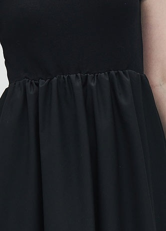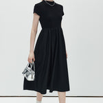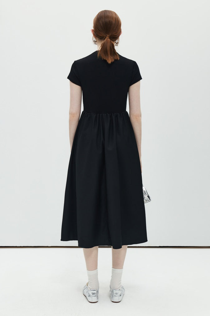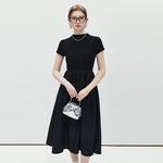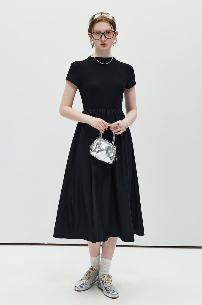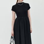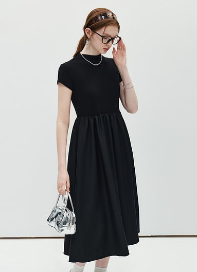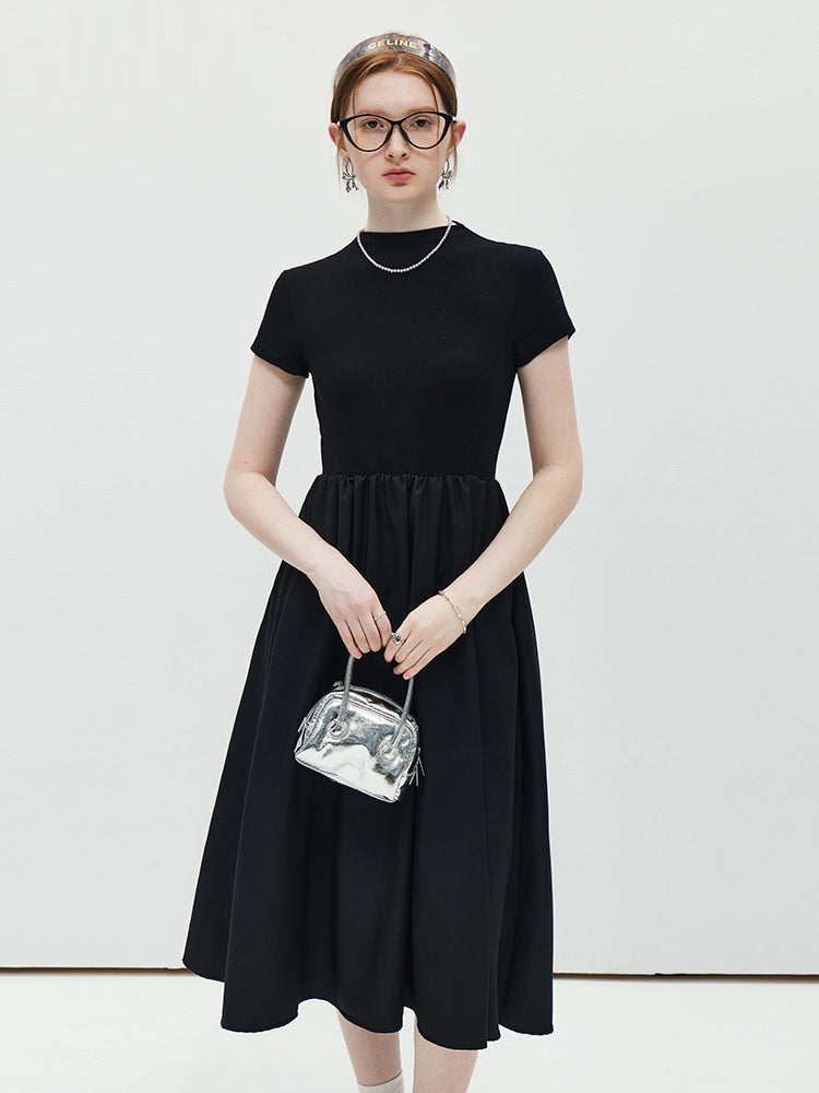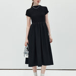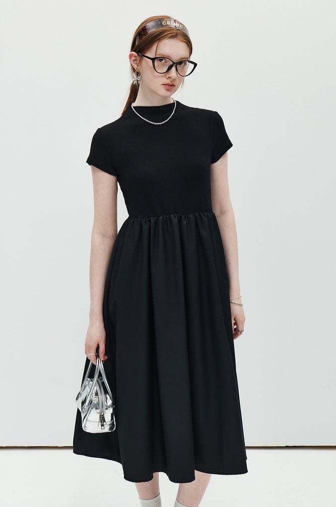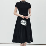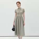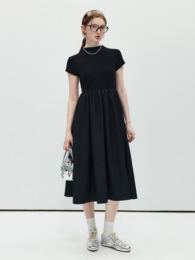 This dress combines smart elegance with a relaxed, casual vibe. The half-high collar design offers comfort, while the spliced materials enhance the waistline and elongate the proportions, creating a flattering and stylish silhouette.