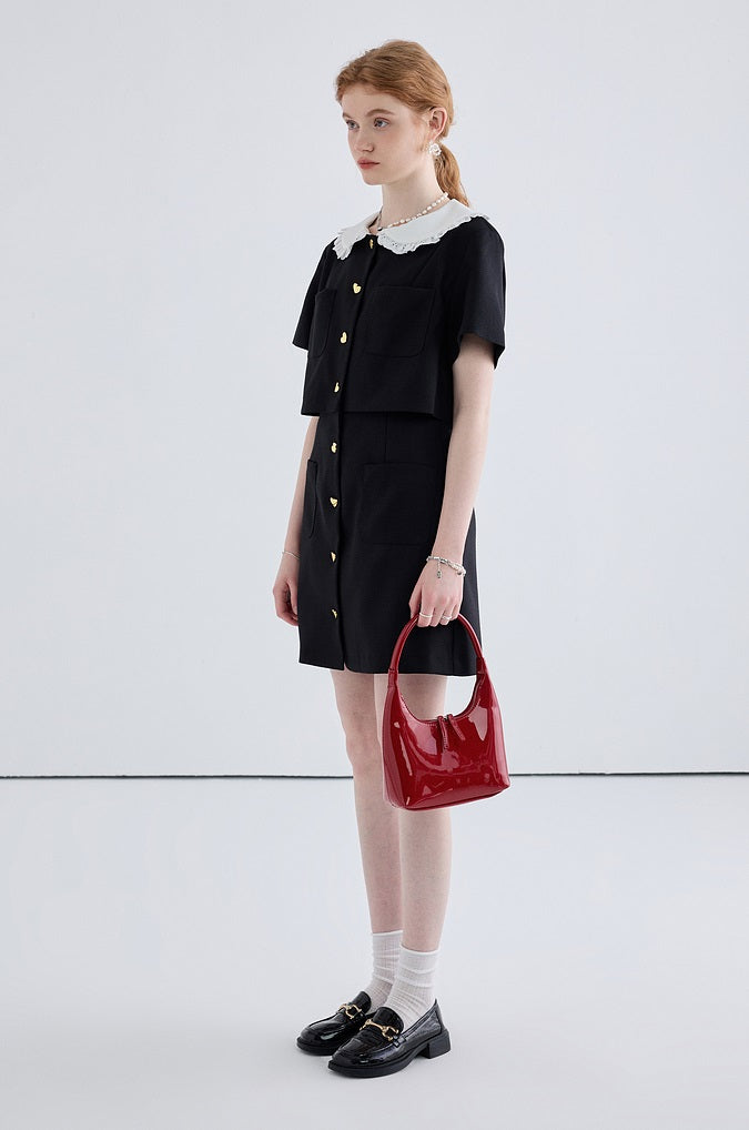 This dress features a doll collar shape, embodying elegance and sweetness in its design. The heart-shaped metal buckle adds a fresh and playful touch, injecting new ideas into your outfit for a stylish, unique look.
