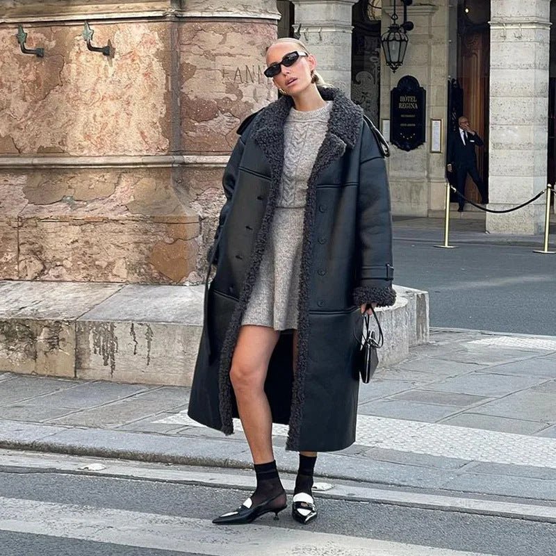 Elevating outerwear to new levels of refinement, this longline coat blends contemporary design with classic elements. Crafted with a sleek faux leather exterior and a plush, oversized shearling collar, it brings warmth without compromising on style. The structured silhouette is cinched at the waist with a tonal belt, adding definition and sophistication. Ideal for both urban walks and evening outings, this piece is a statement of confident, timeless elegance.