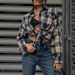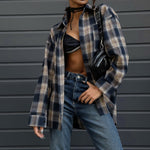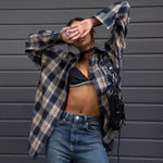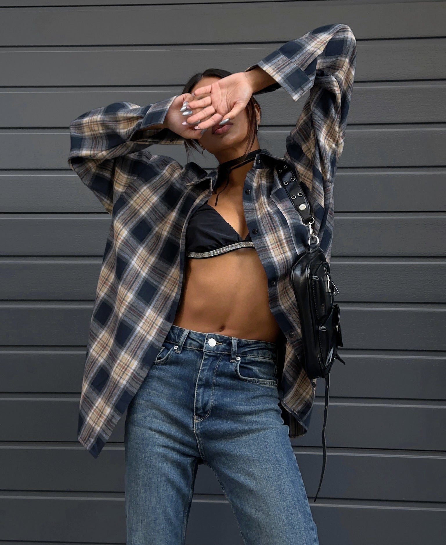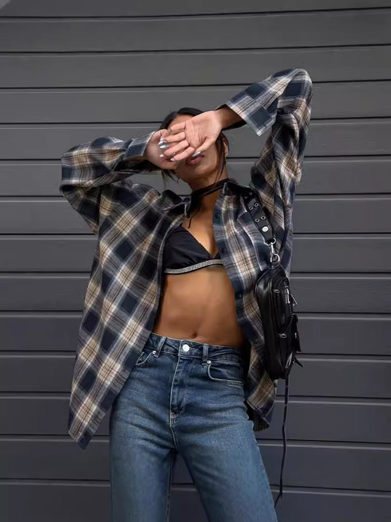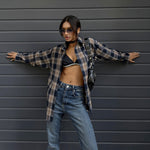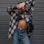 This oversized flannel shirt features a classic navy and beige plaid pattern, combining timeless appeal with a modern relaxed fit. The soft, brushed texture offers comfort and a premium feel, while the oversized cut enhances its effortless silhouette. Designed with a button-front closure and adjustable cuffs, it delivers both style and practicality. The structured collar and clean lines add a refined touch, making it a versatile piece for a confident, contemporary look.
