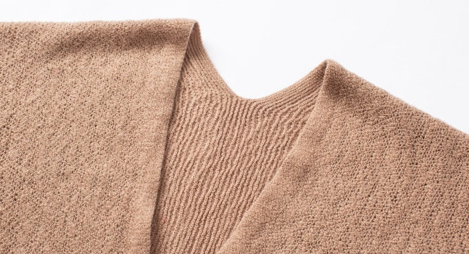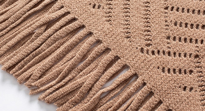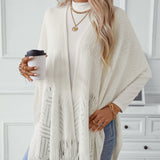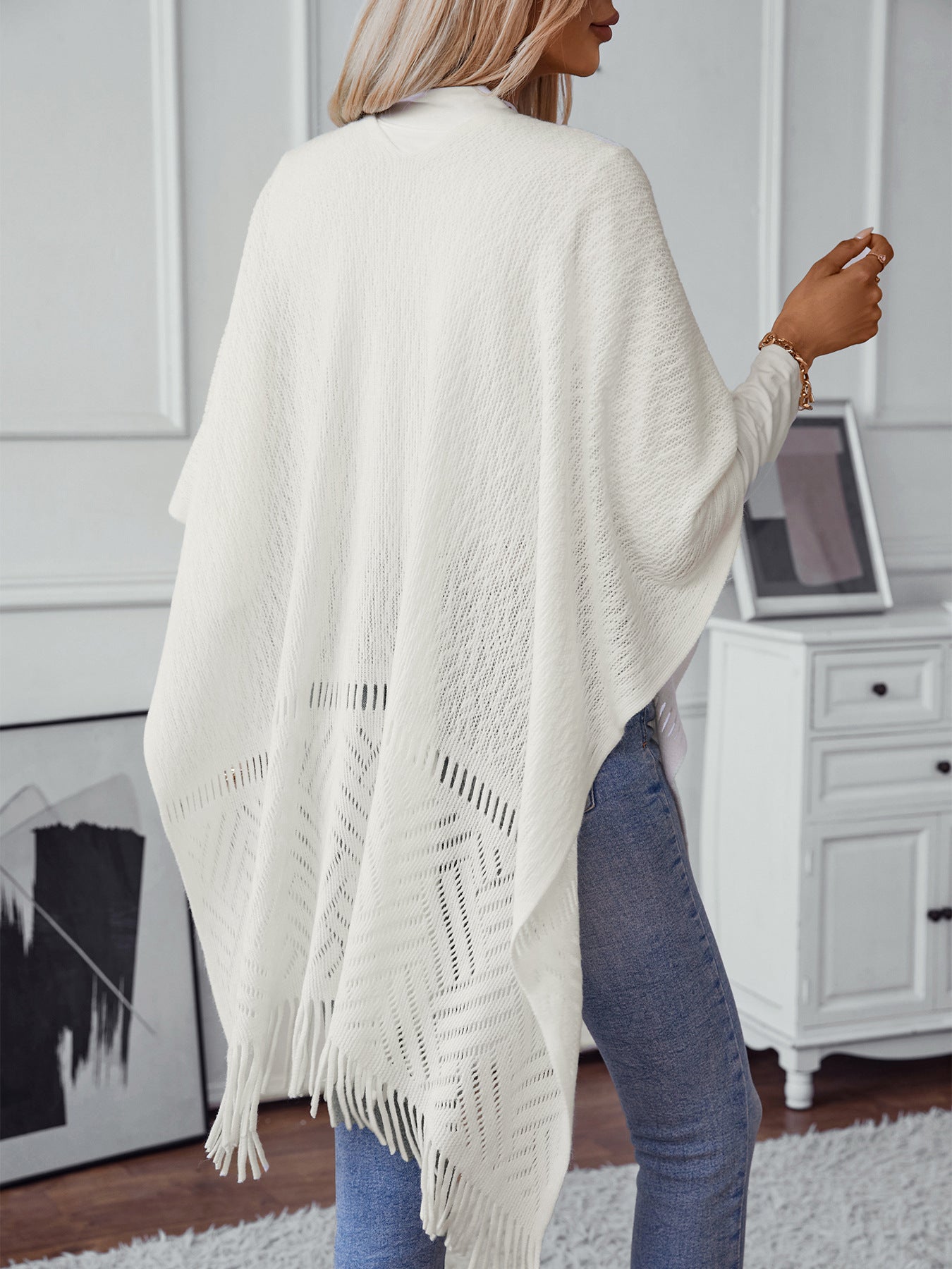 Delicate yet distinctive, this cape is crafted from a soft knit with intricate openwork patterns that bring depth and texture to the design. The clean, flowing silhouette is enhanced by a fringe-trimmed hem, offering movement with every step. Lightweight yet cozy, it strikes a refined balance between comfort and style. A versatile piece with an artisanal touch, perfect for elevating cold-weather ensembles without excess.