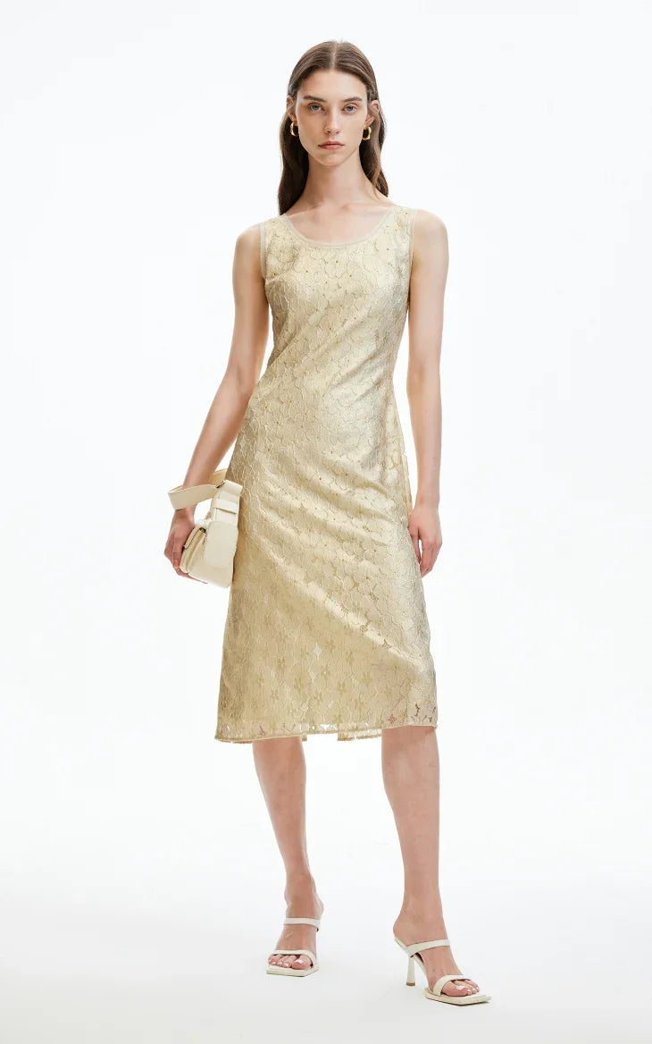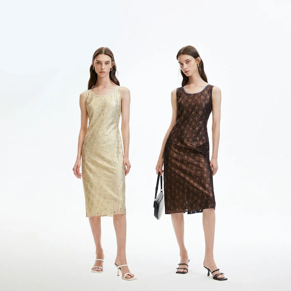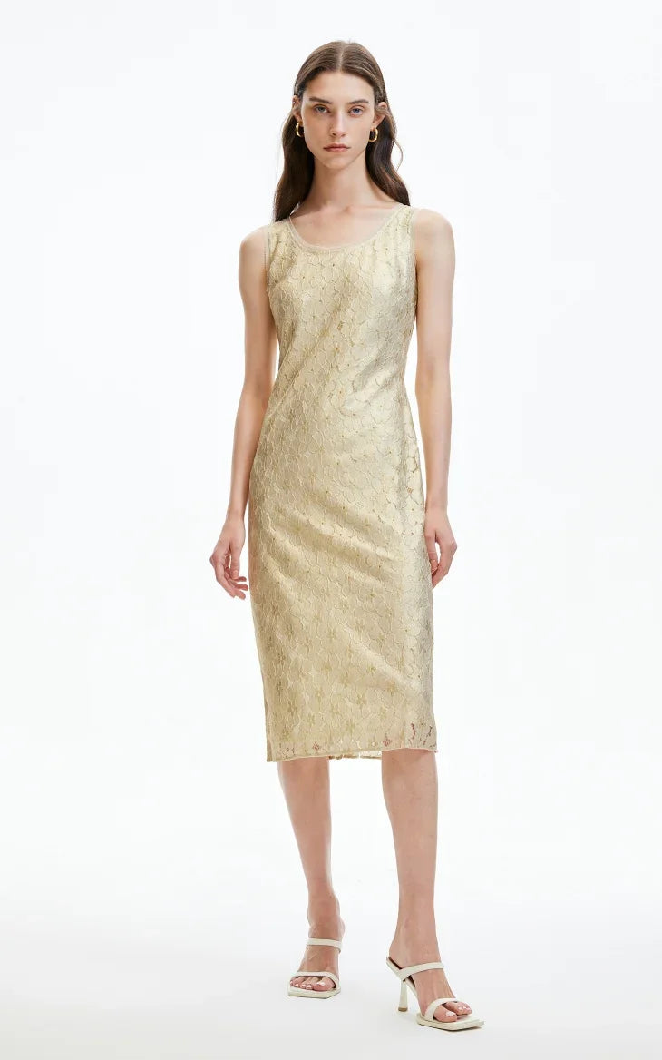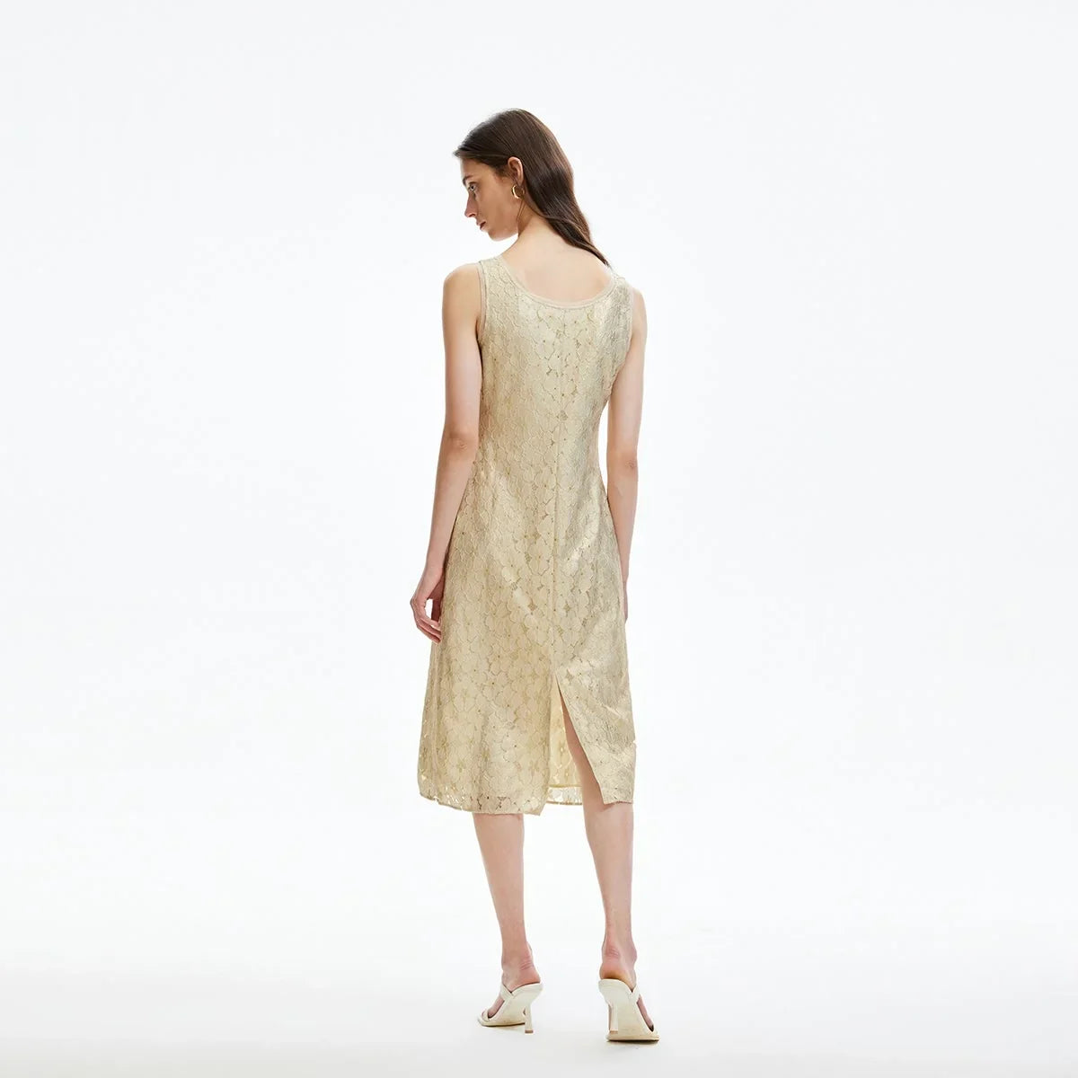 This dress features a stylish metallic hollow design that adds a unique touch, while the slim waist enhances the silhouette. The comfortable slit design allows for easy movement, blending fashion with practicality.