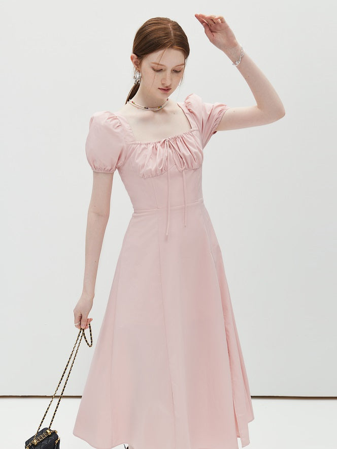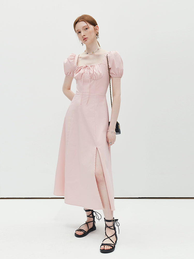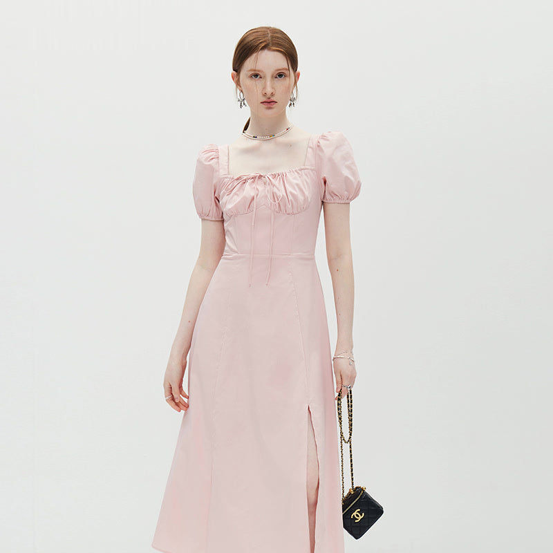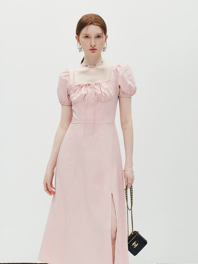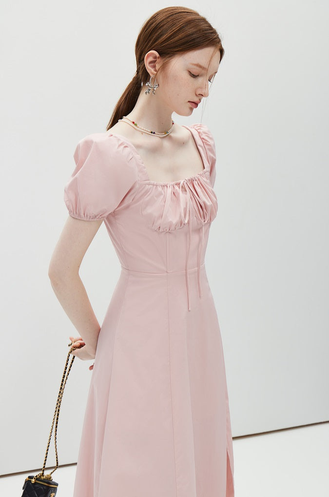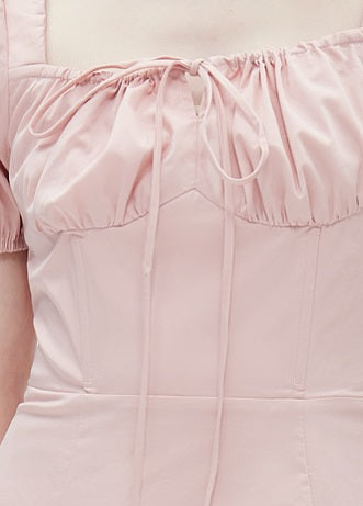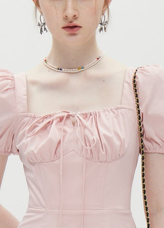 This dress features an elegant square collar that enhances the neckline. The adjustable tether design allows for a customizable fit, combining style and comfort effortlessly.