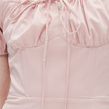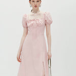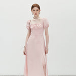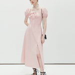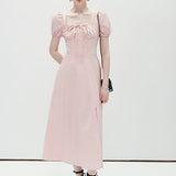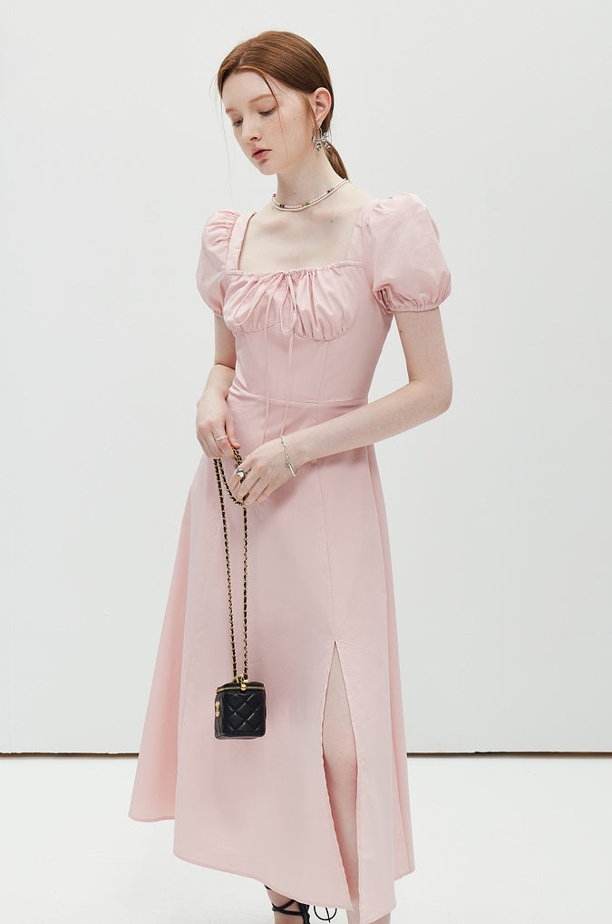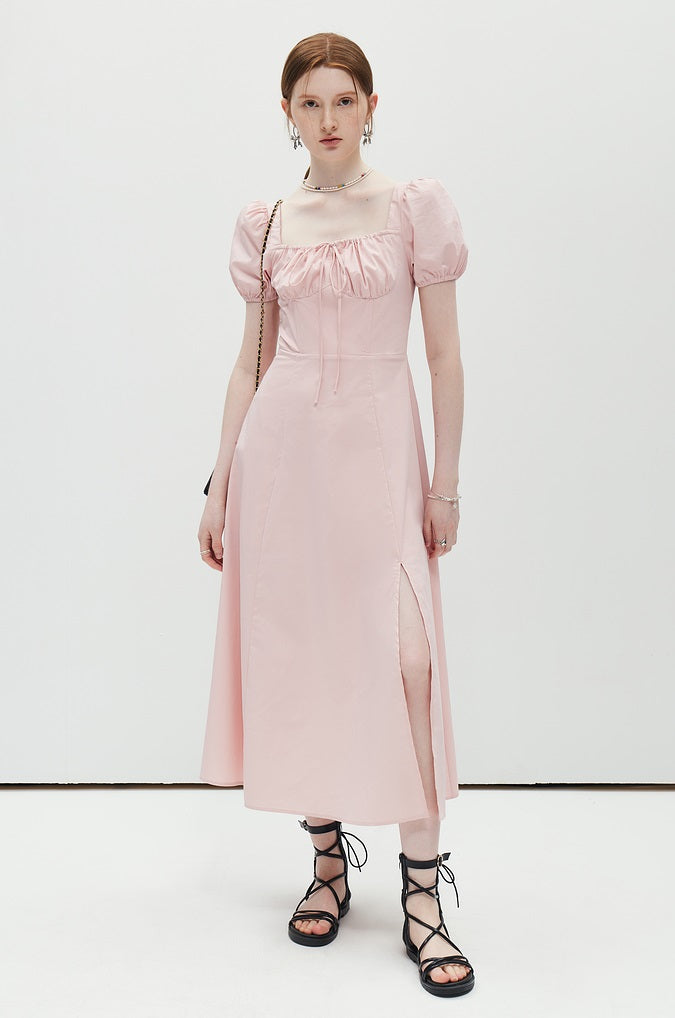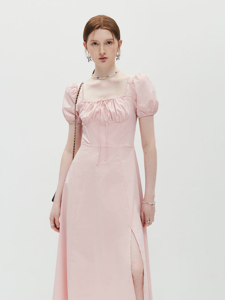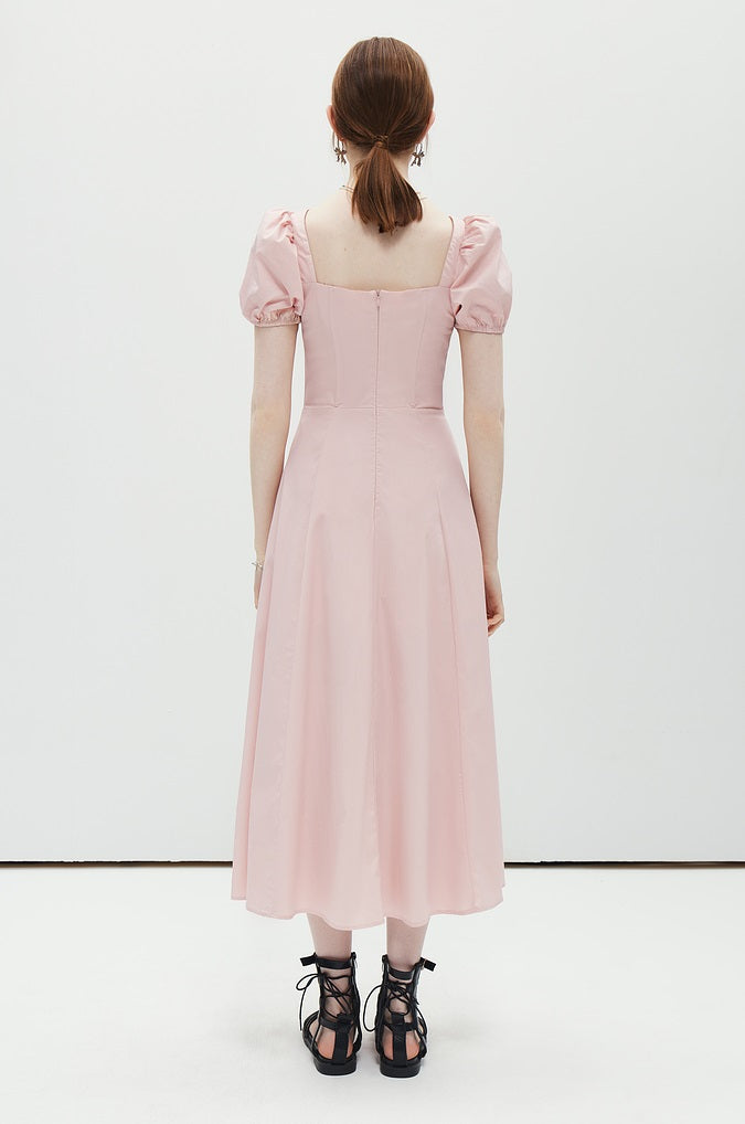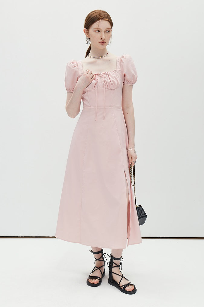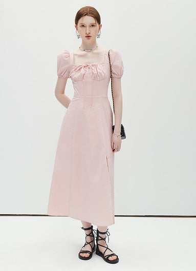 This dress features an elegant square collar that enhances the neckline. The adjustable tether design allows for a customizable fit, combining style and comfort effortlessly.