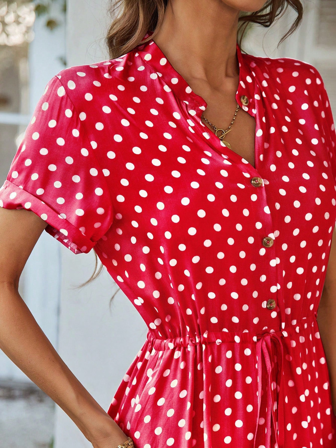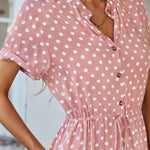 This midi dress brings a fresh take on timeless polka dots, featuring a relaxed silhouette enhanced by a drawstring waist for subtle definition. The button-down front and short sleeves add an effortless touch, while the lightweight fabric ensures comfort through the warmer seasons. A versatile piece that transitions easily from day to evening.