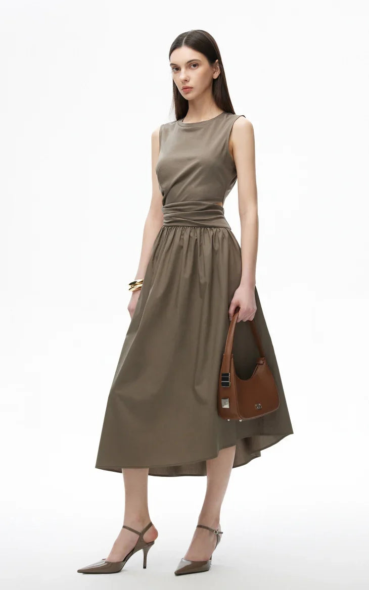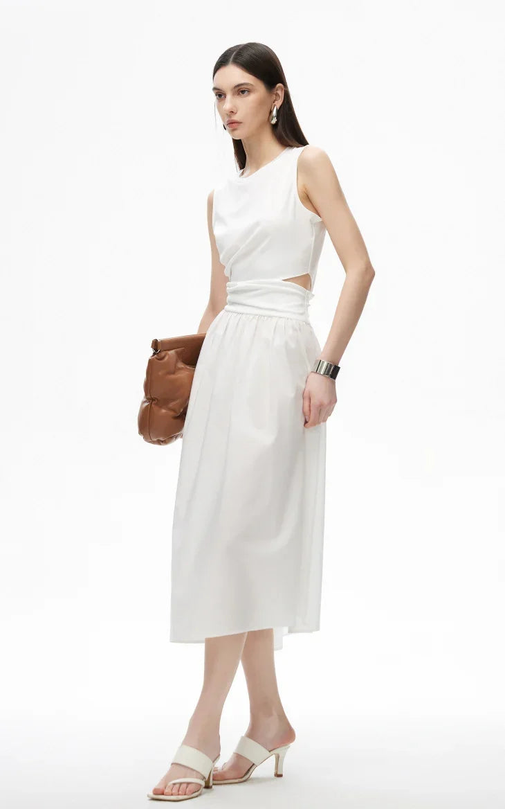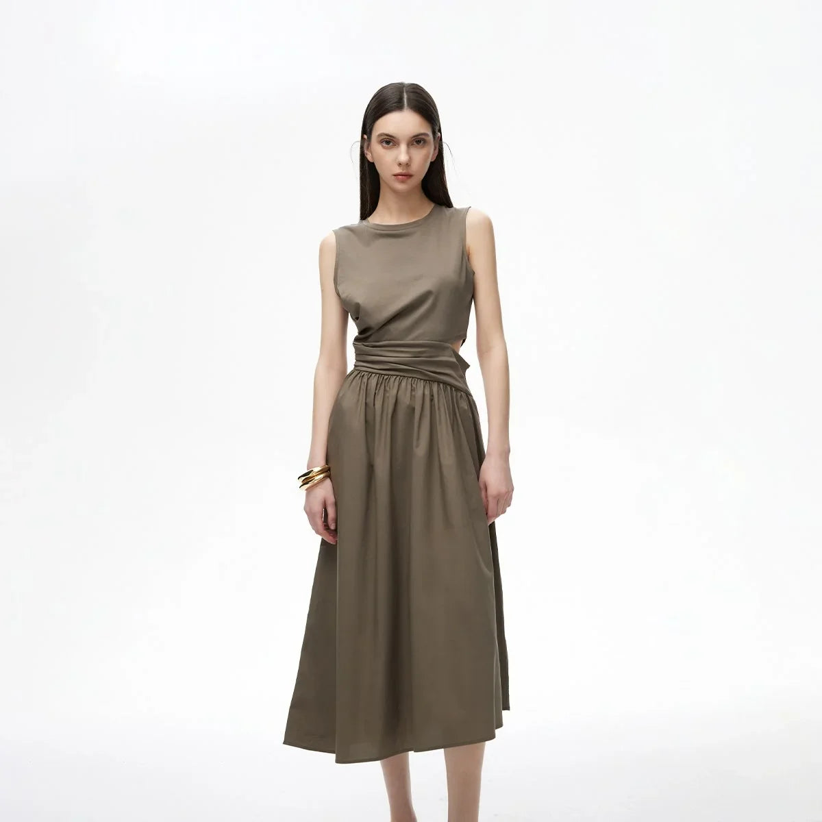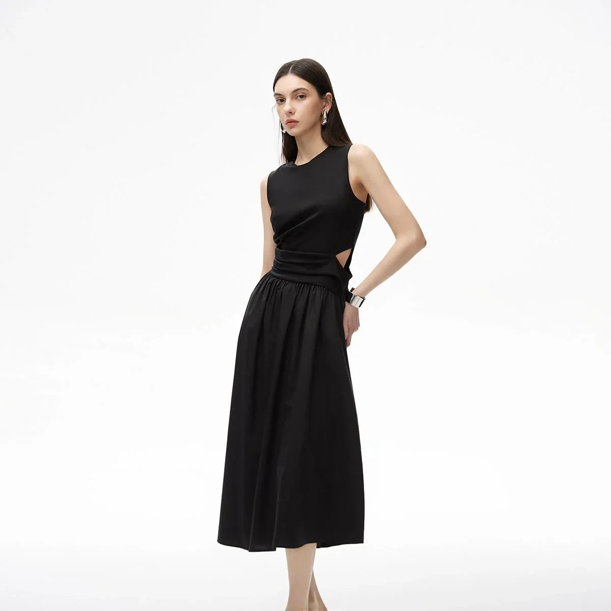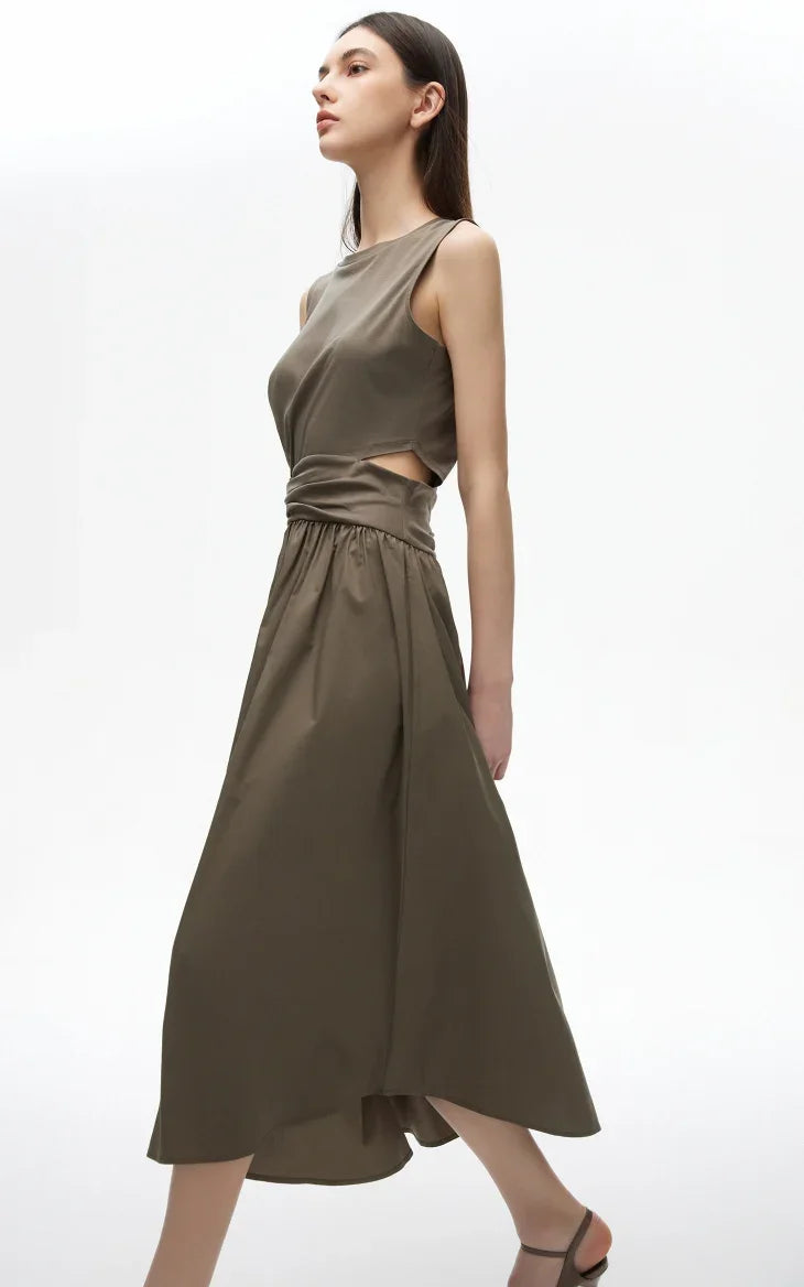 This dress features an elegant umbrella skirt that adds volume and flow, while the asymmetrical cutout waist creates a bold, modern look. The invisible side zipper ensures a seamless and smooth finish to the design.