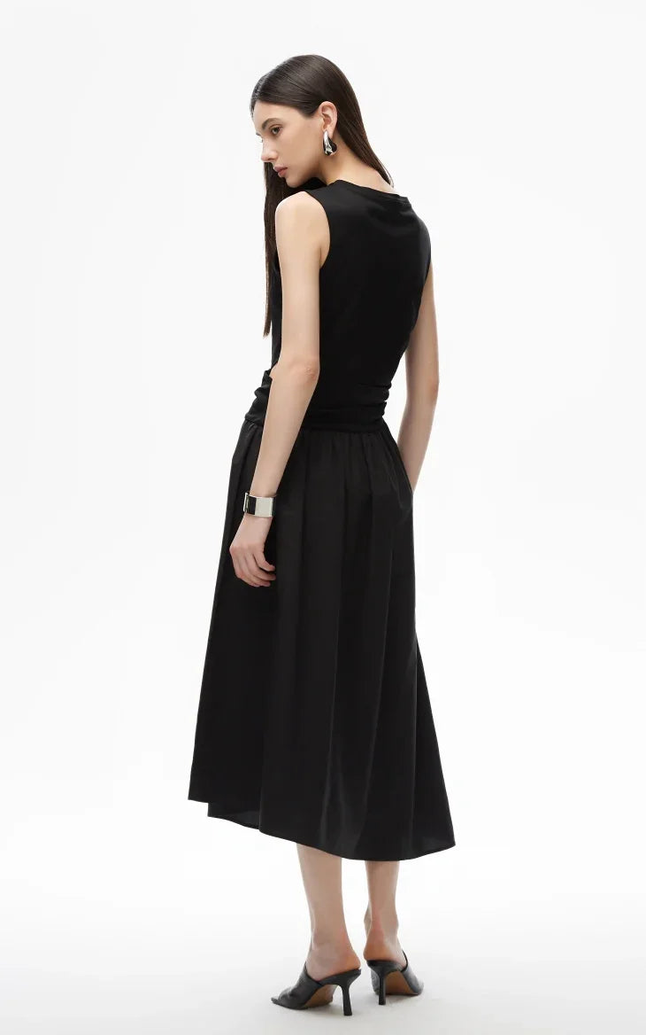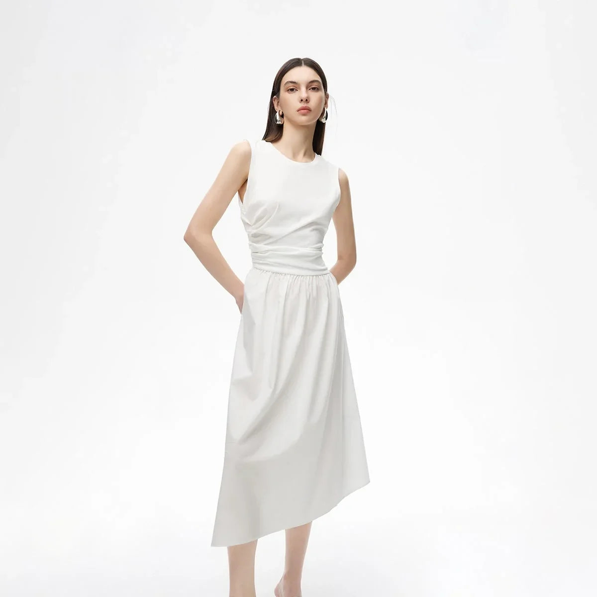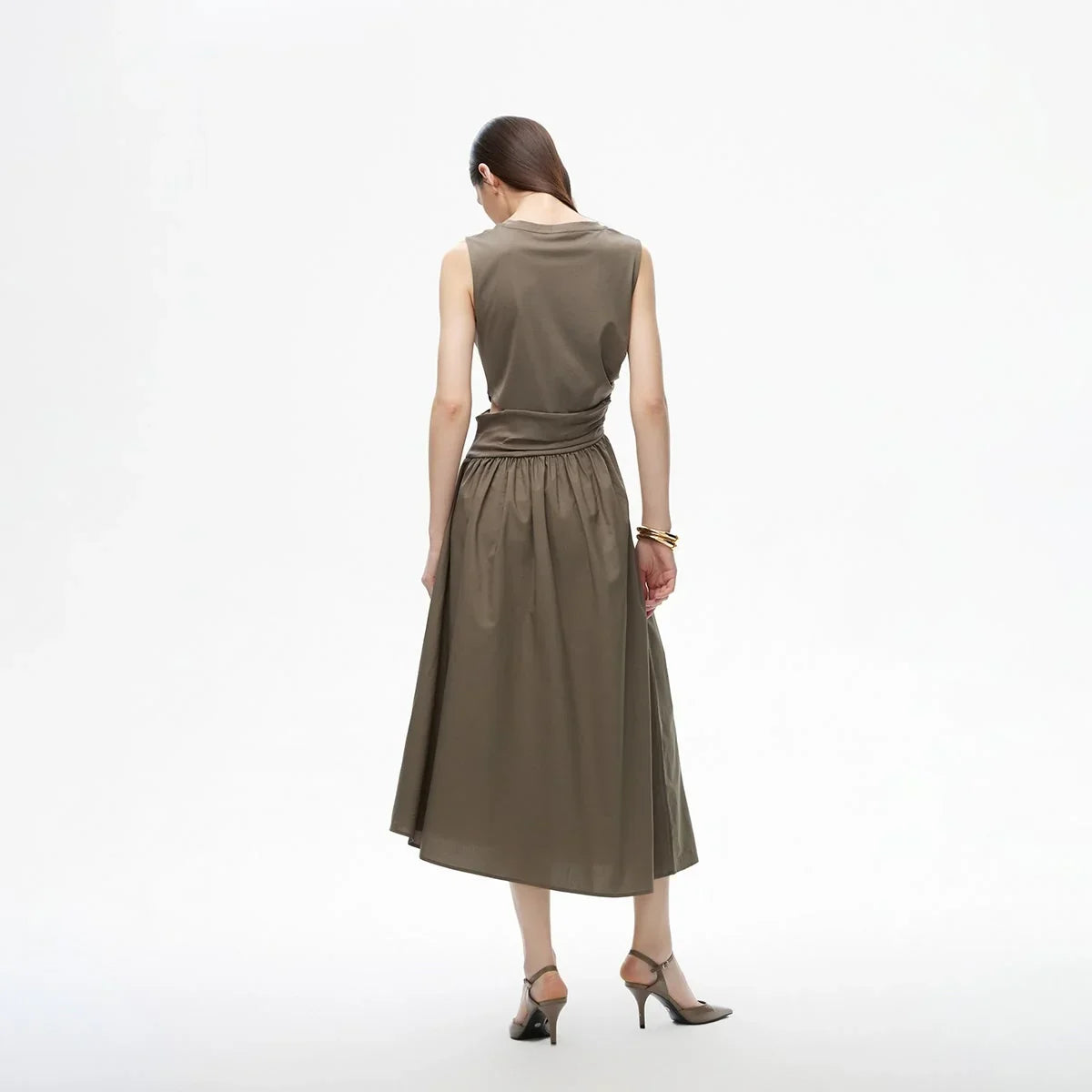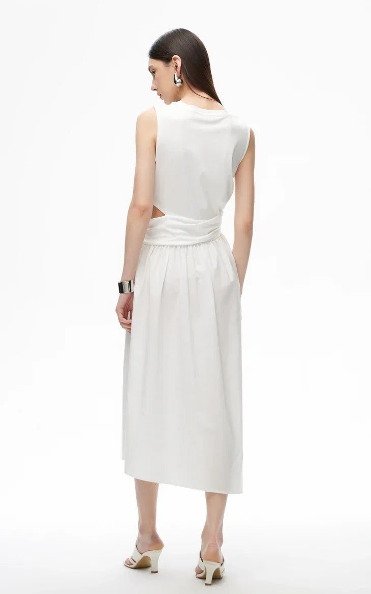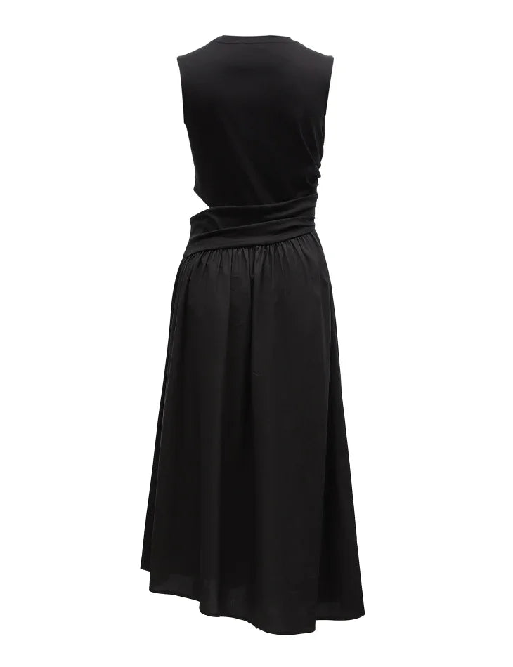 This dress features an elegant umbrella skirt that adds volume and flow, while the asymmetrical cutout waist creates a bold, modern look. The invisible side zipper ensures a seamless and smooth finish to the design.